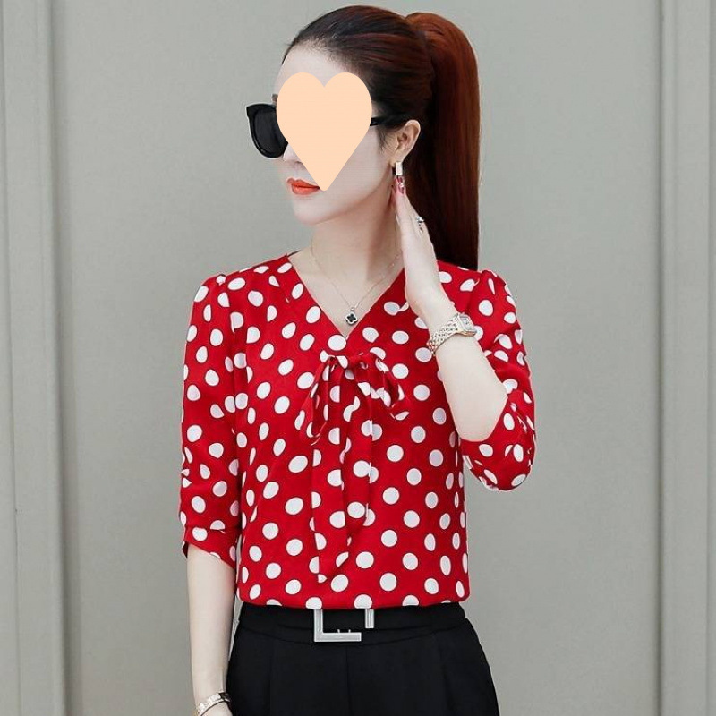 • 2053 폴카 도트 쉬폰 레드 반소매