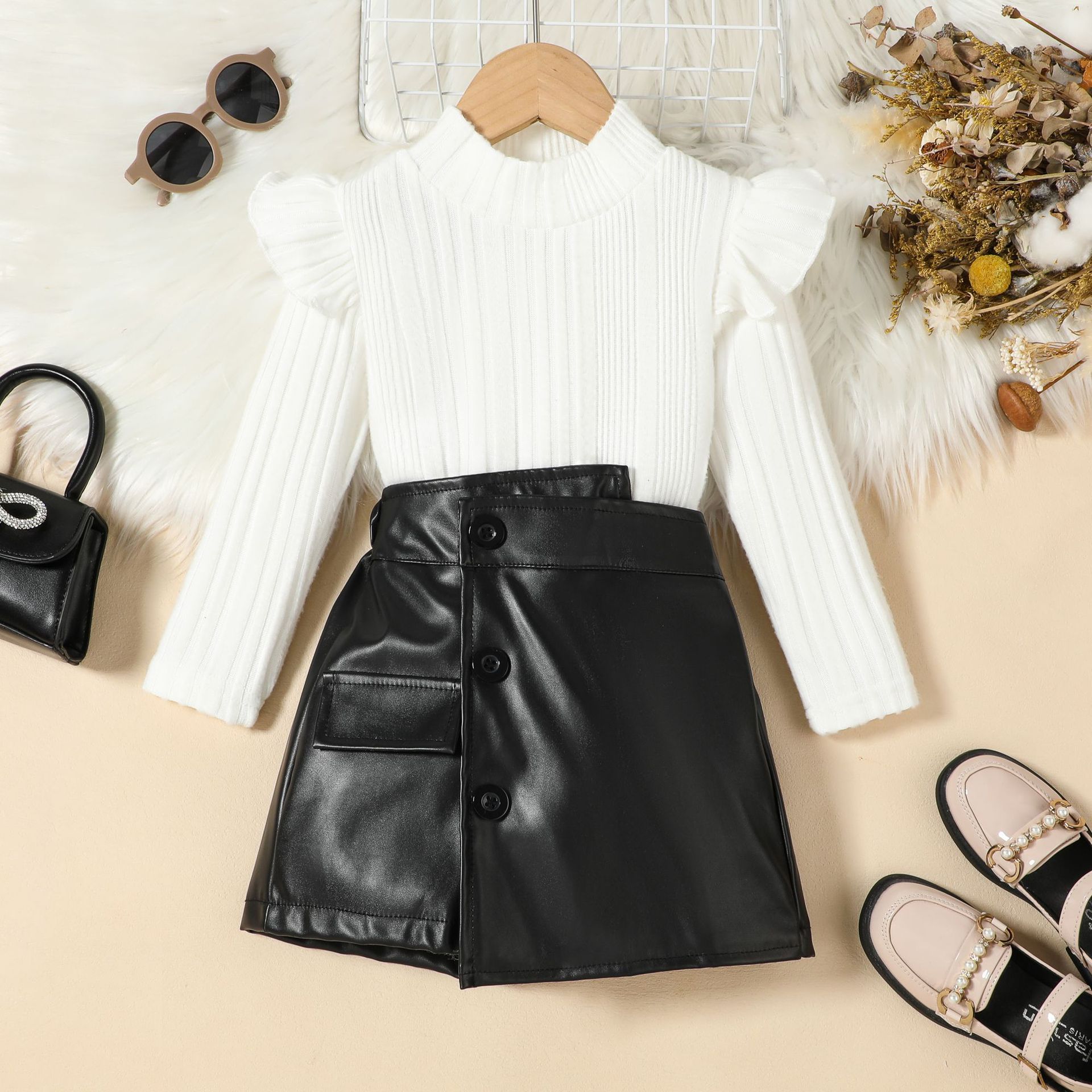 유럽과 미국의 가을 겨울 하이넥 니트 플라잉 슬리브 탑 + 불규칙한 PU 가죽 스커트 투피스 세트를 입은 중소형 어린이 유행 소녀스토어 가기
