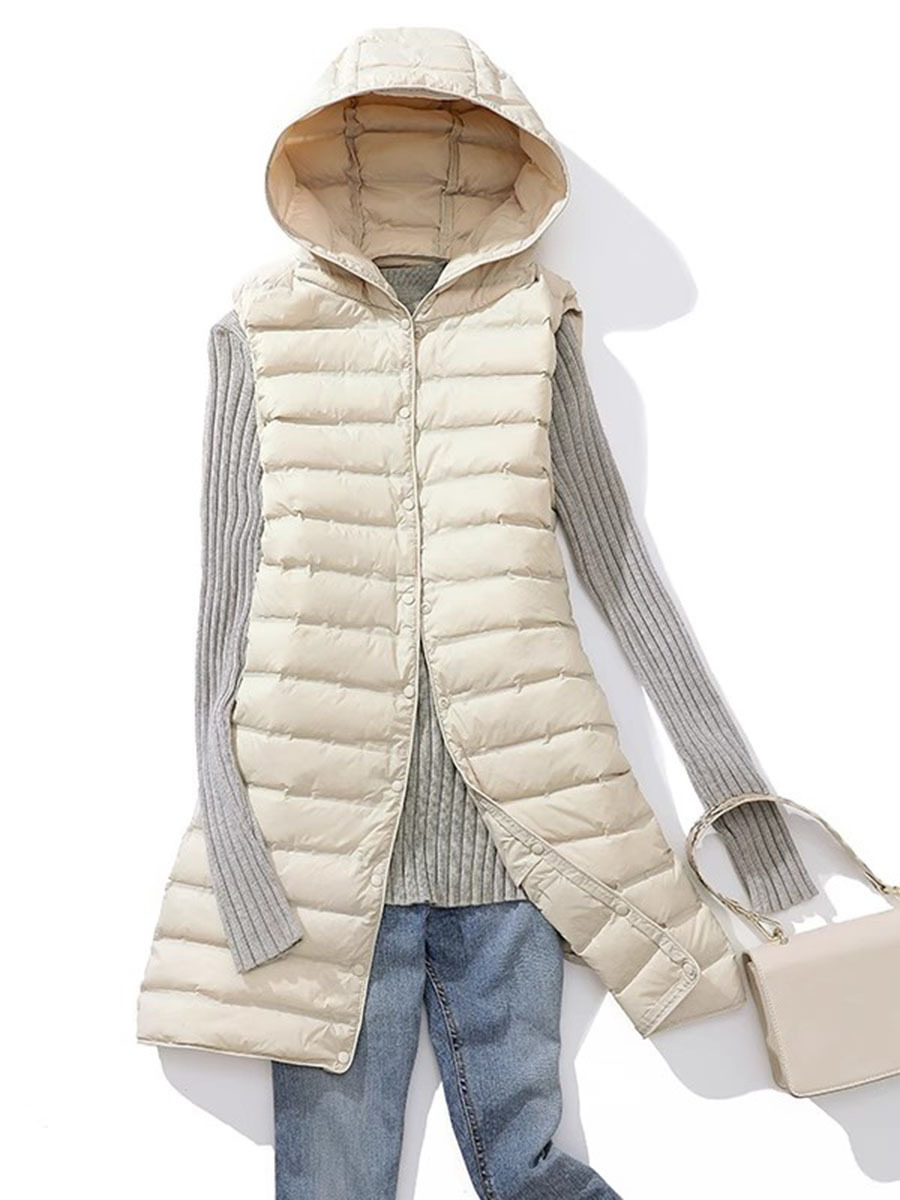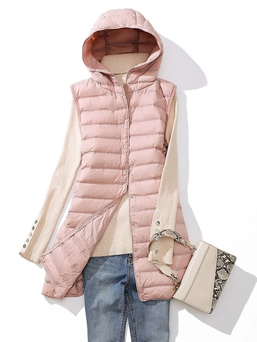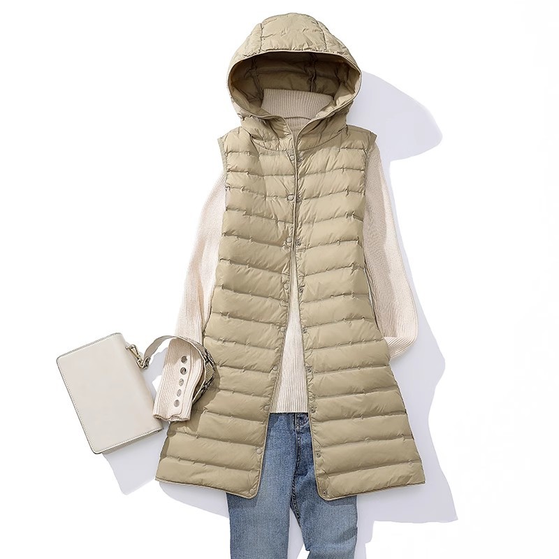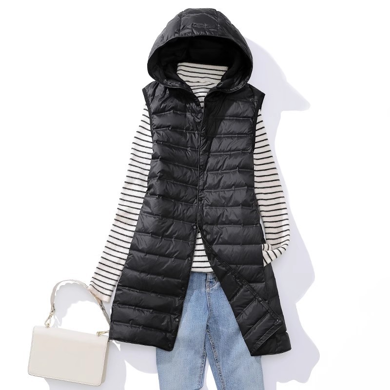 2025 새로운 얇은 다운 조끼 여성 중간 길이 가을, 겨울 경량 후드 다운 조끼 민소매 라이너 탑