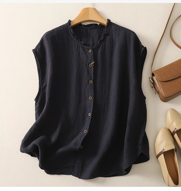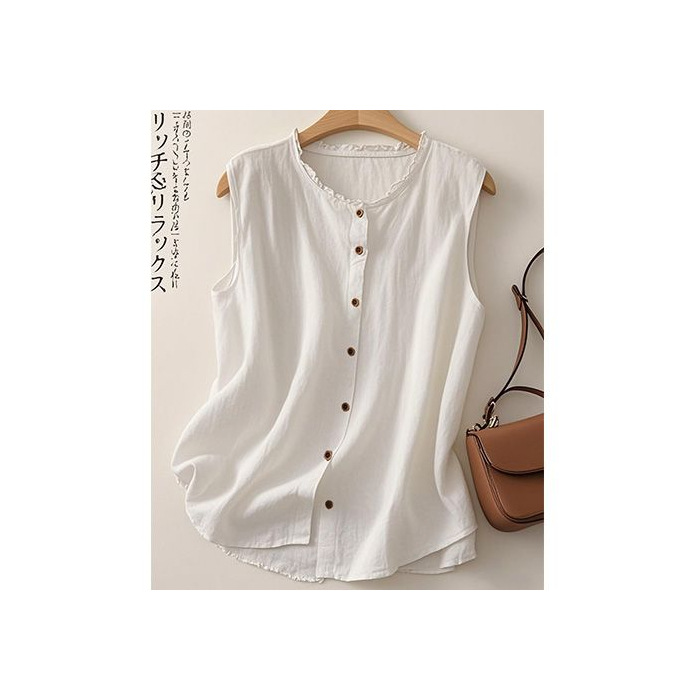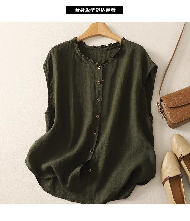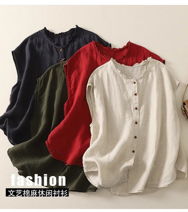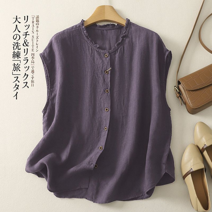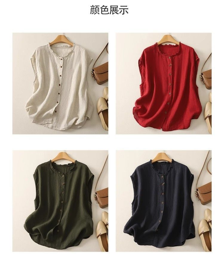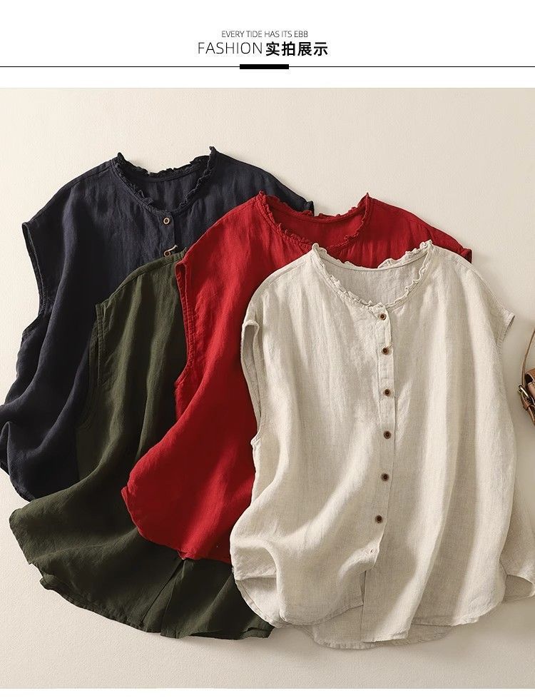 대외 무역 여성 의류 카운터 여름 복고풍 면화 및 린넨 민소매 셔츠 여성용 캐주얼 루즈 슬리밍 레이스 칼라 탑스토어 가기
