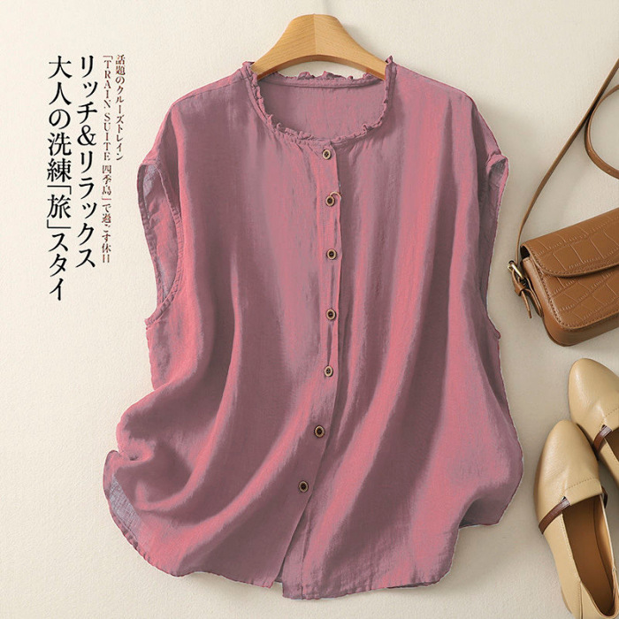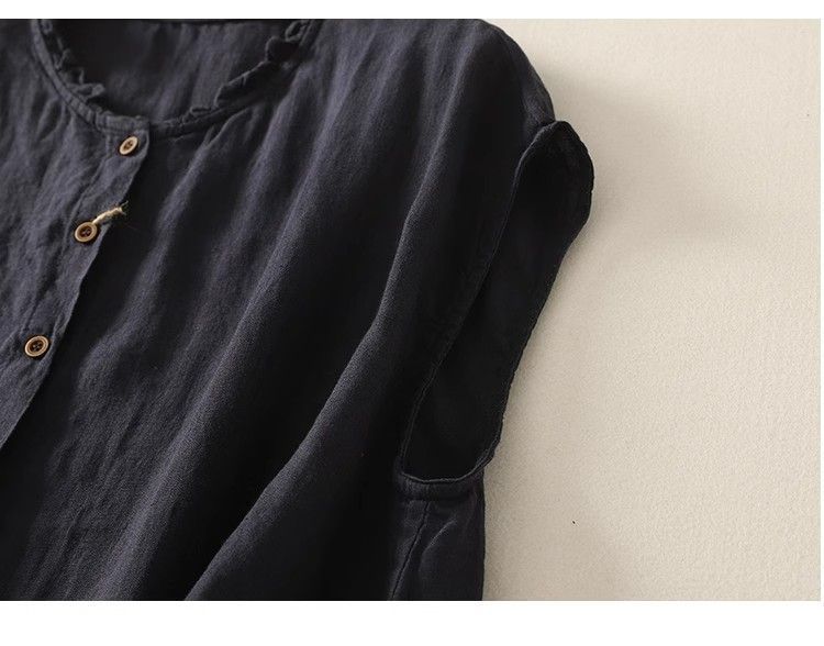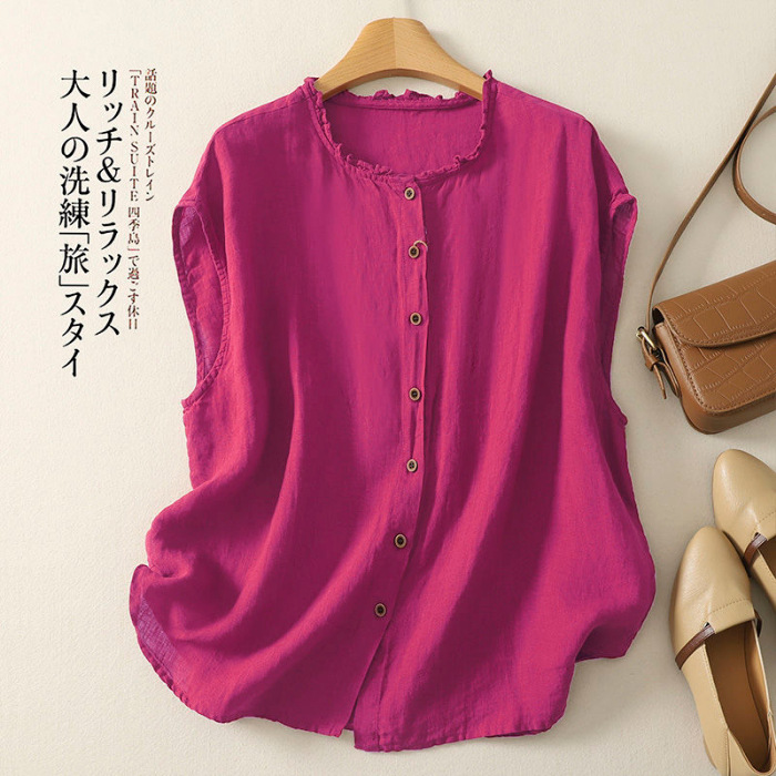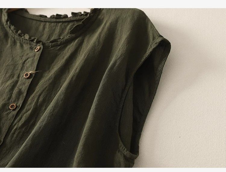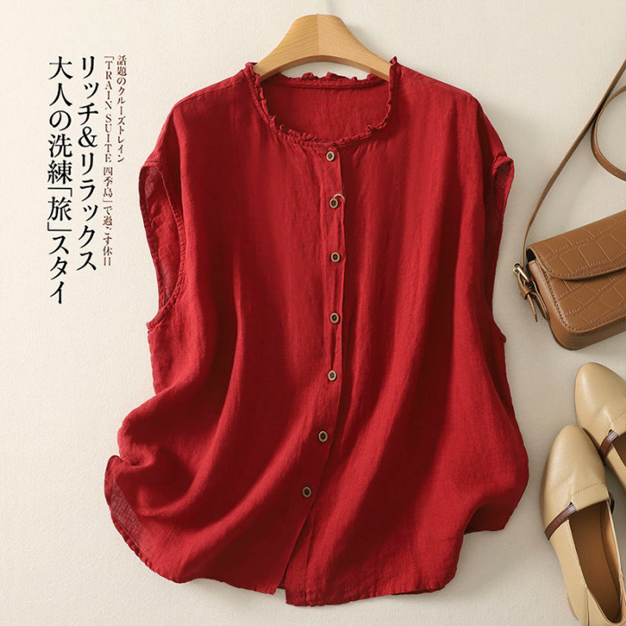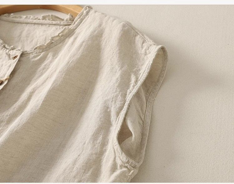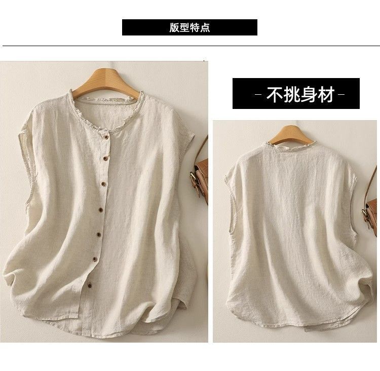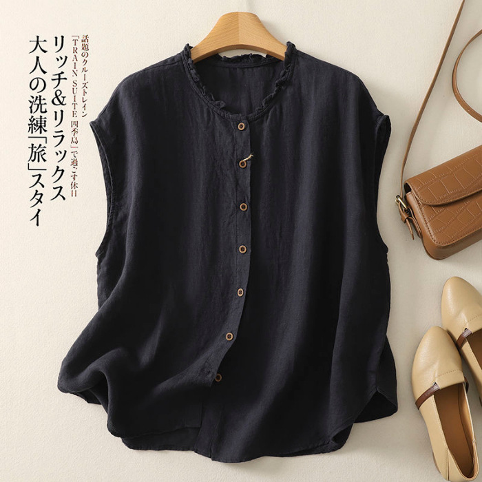 대외 무역 여성 의류 카운터 여름 복고풍 면화 및 린넨 민소매 셔츠 여성용 캐주얼 루즈 슬리밍 레이스 칼라 탑