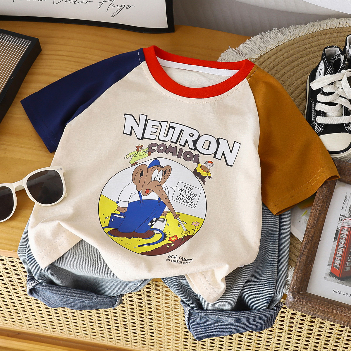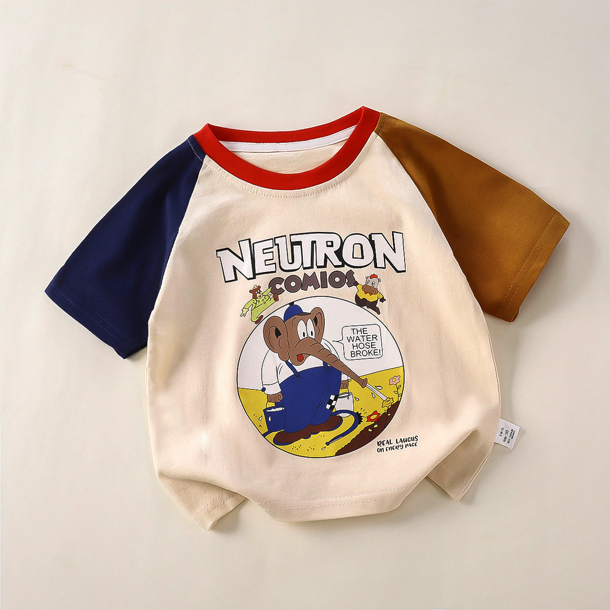 순수 코튼 아동 티셔츠 대비 색상 라글란 슬리브 탑 2025 새로운 만화 다목적 중소 아동 의류 반팔 셔츠스토어 가기