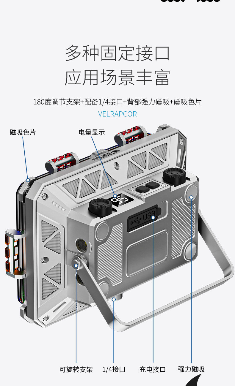 전원 디스플레이 보조 조명 자기 흡입 후크 휴대용을 갖춘 새로운 크로스 보더 야외 강한 빛 하이라이트 캠핑 램프 작업 램프