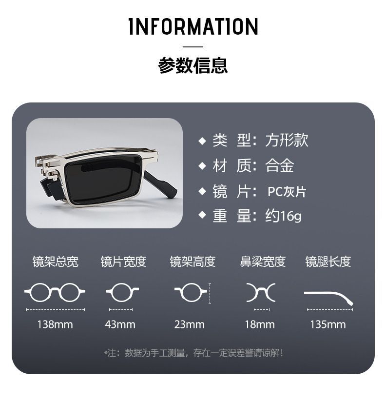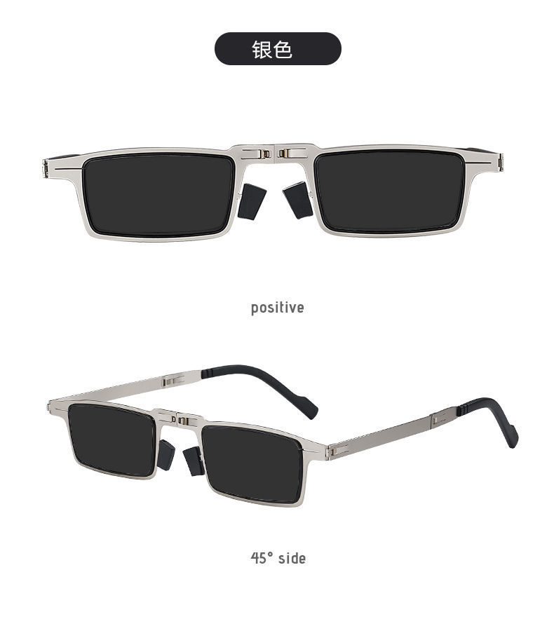 • 실버 사각형 휴대용 접이식 선글라스는 어울리는 사각형 거울 상자와 함께 제공됩니다.