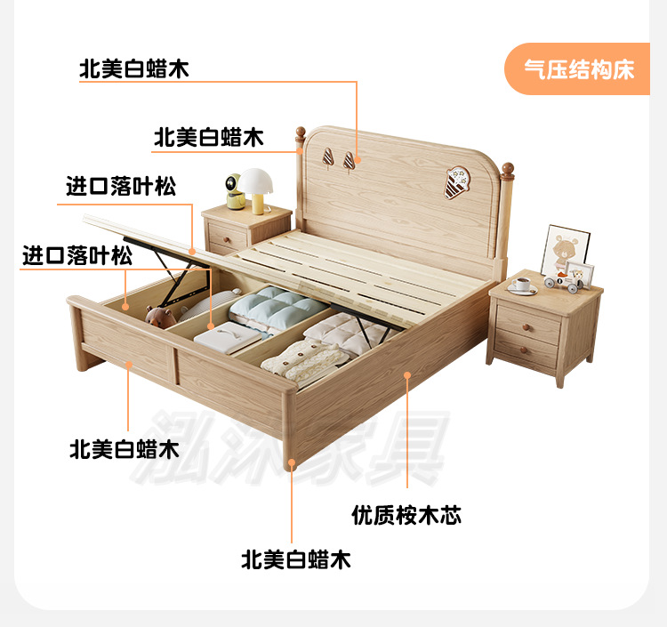 • 공압 구조(모두 원목 상자) + 침대 옆 탁자 2개