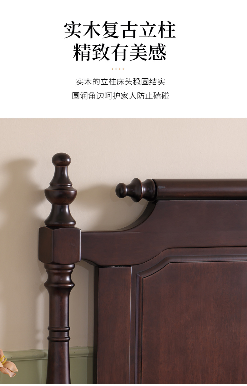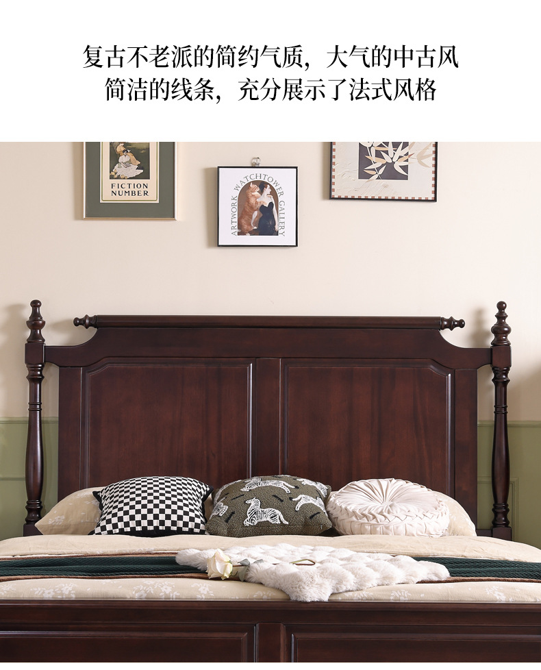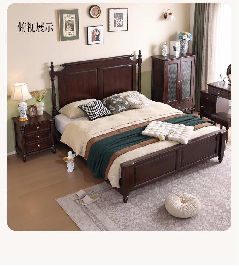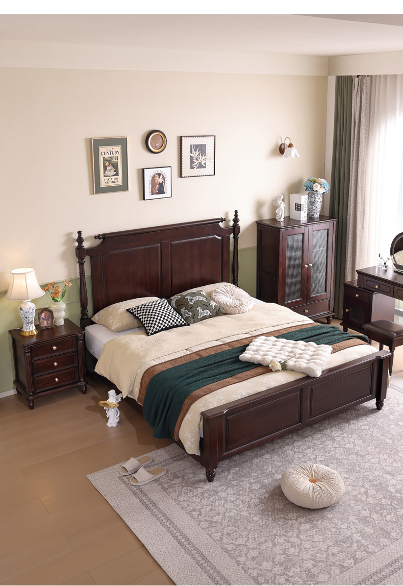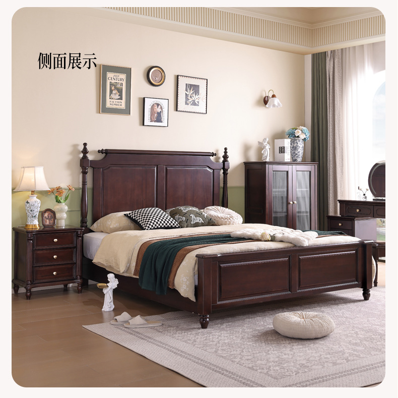 미국산 원목 침대, 블랙 호두 더블 침대, 1.8m 중세 스타일, 심플하고 아름다운 복고풍 침대, 침실 하이박스 가구