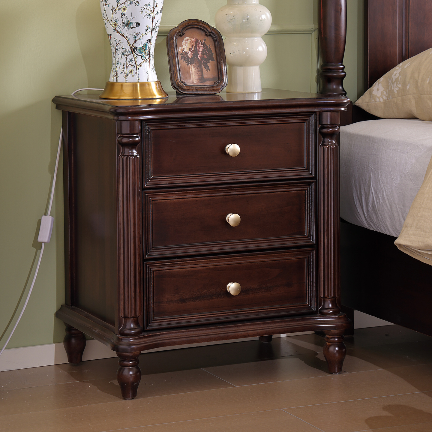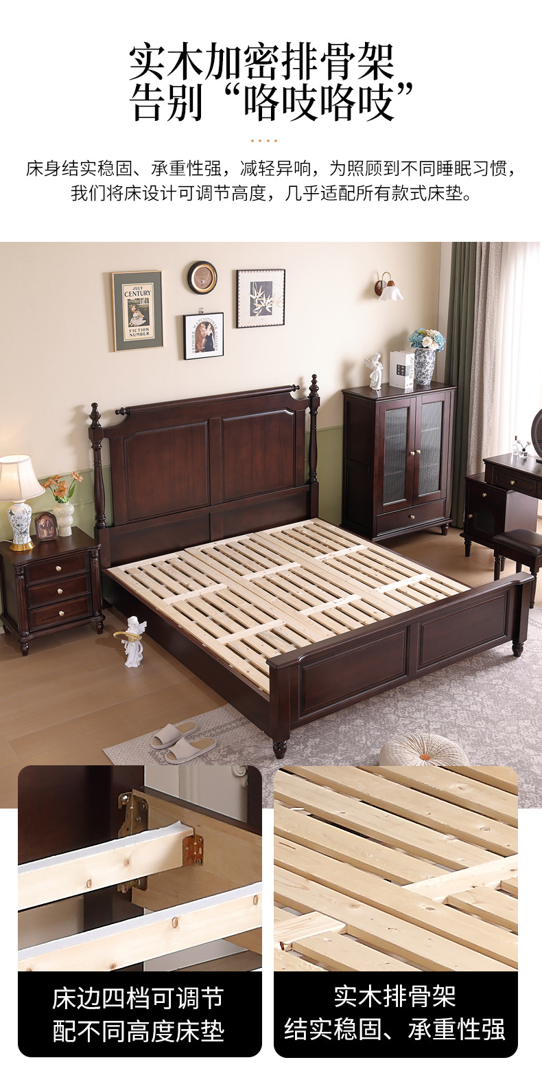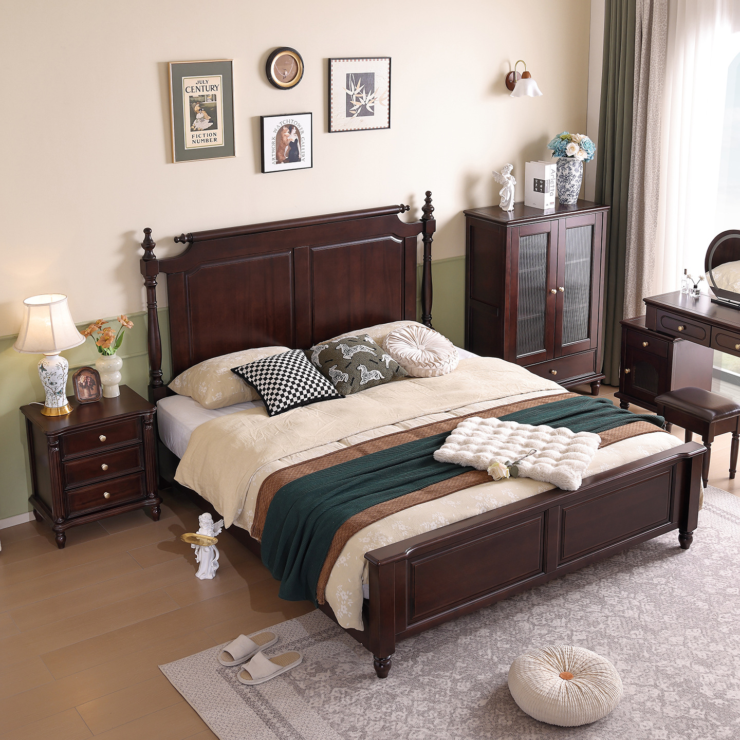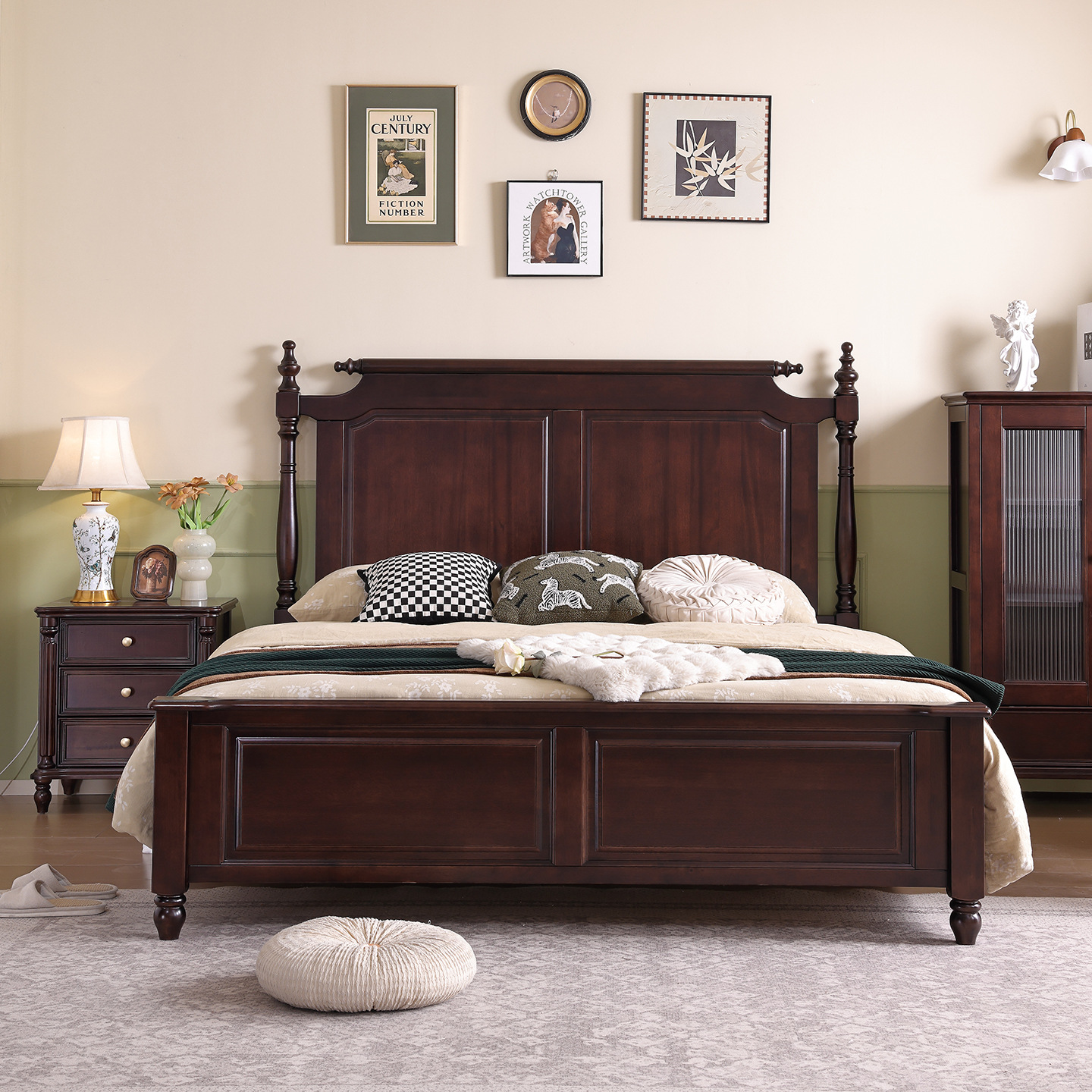 미국산 원목 침대, 블랙 호두 더블 침대, 1.8m 중세 스타일, 심플하고 아름다운 복고풍 침대, 침실 하이박스 가구
