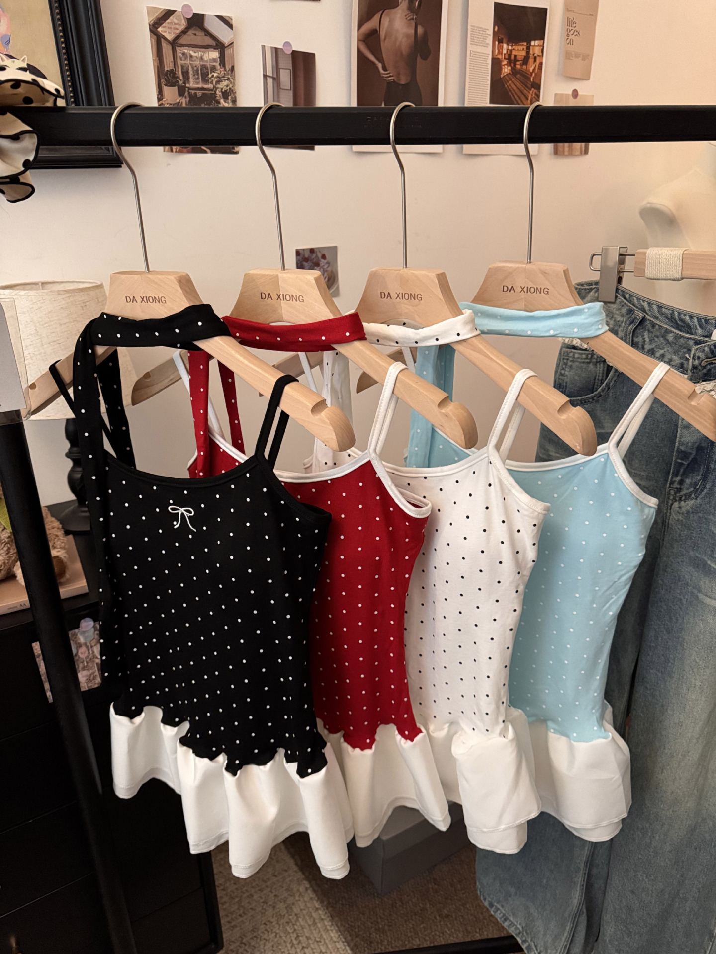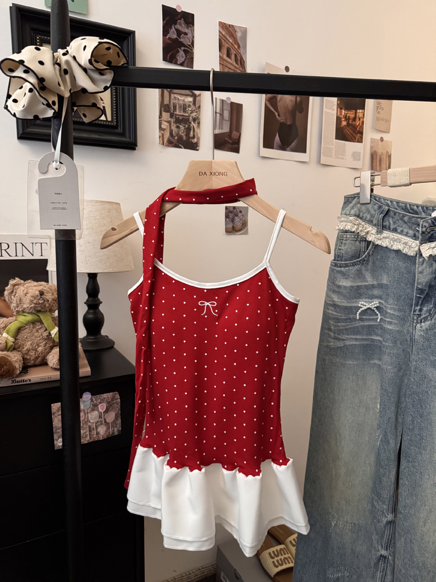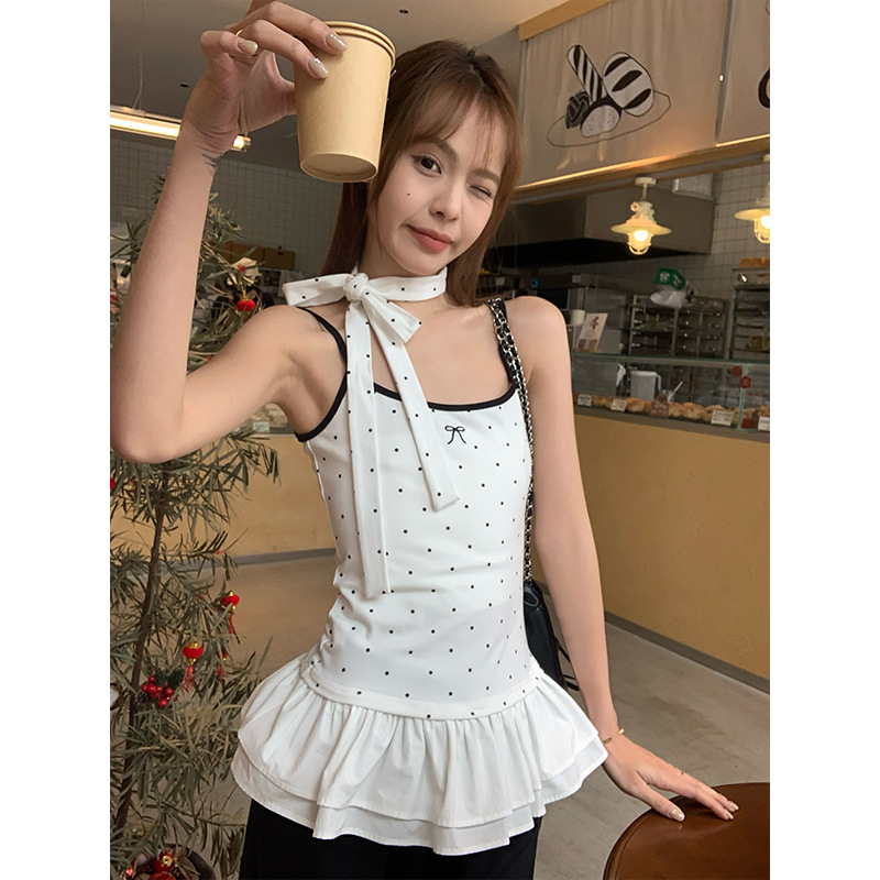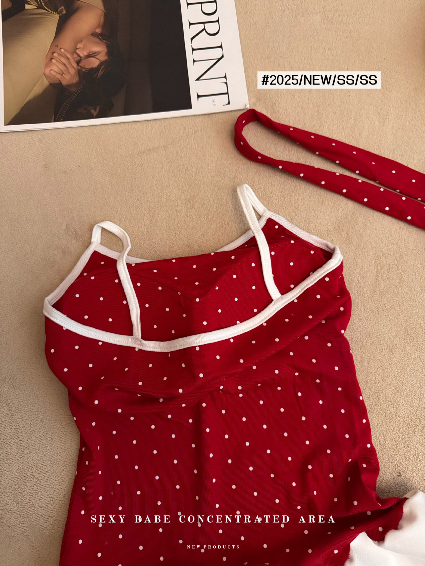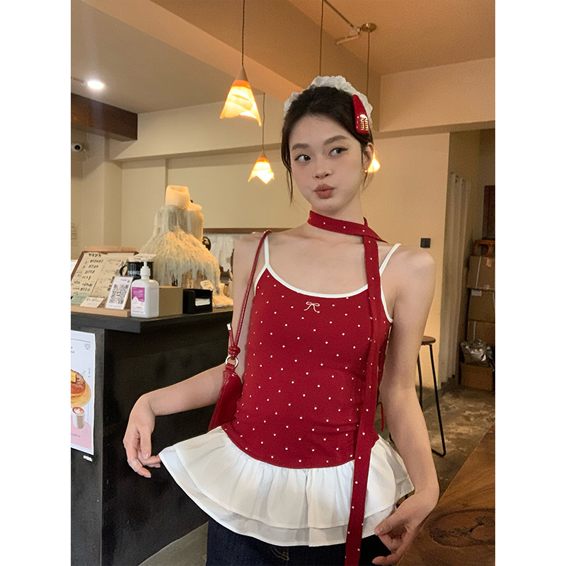 폴카 도트 레드 화이트 캐미솔 여성 여름 신작 밑단 레이스 디자인 슬림핏 탑 트렌디
