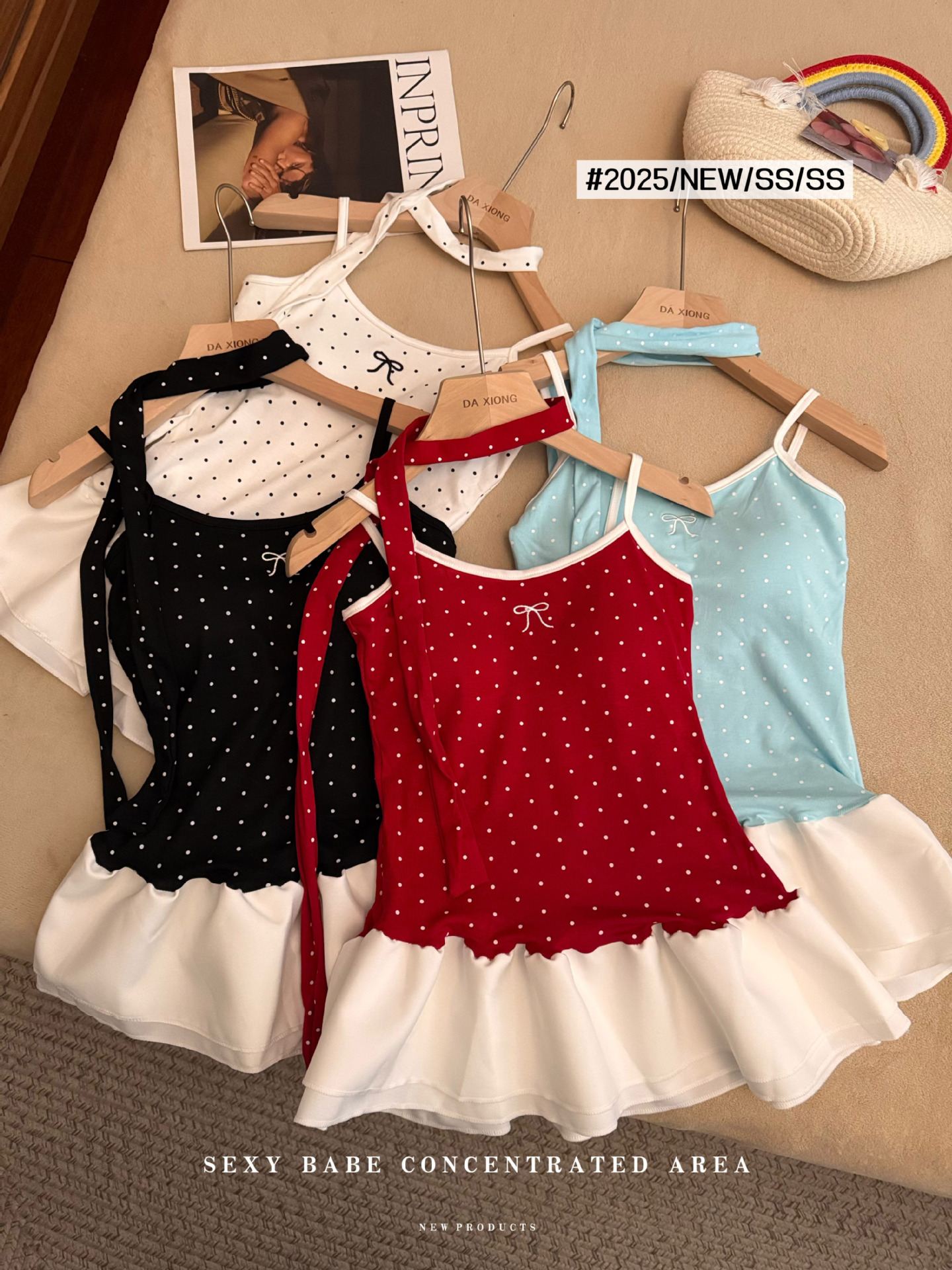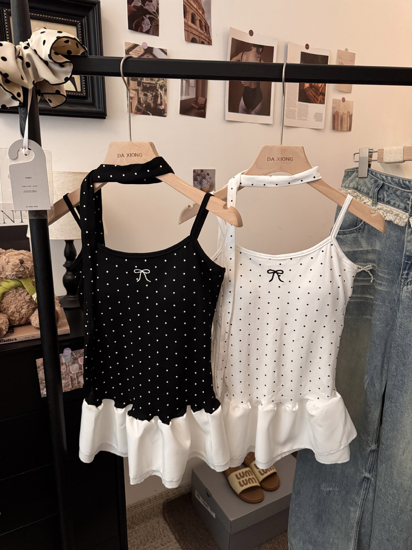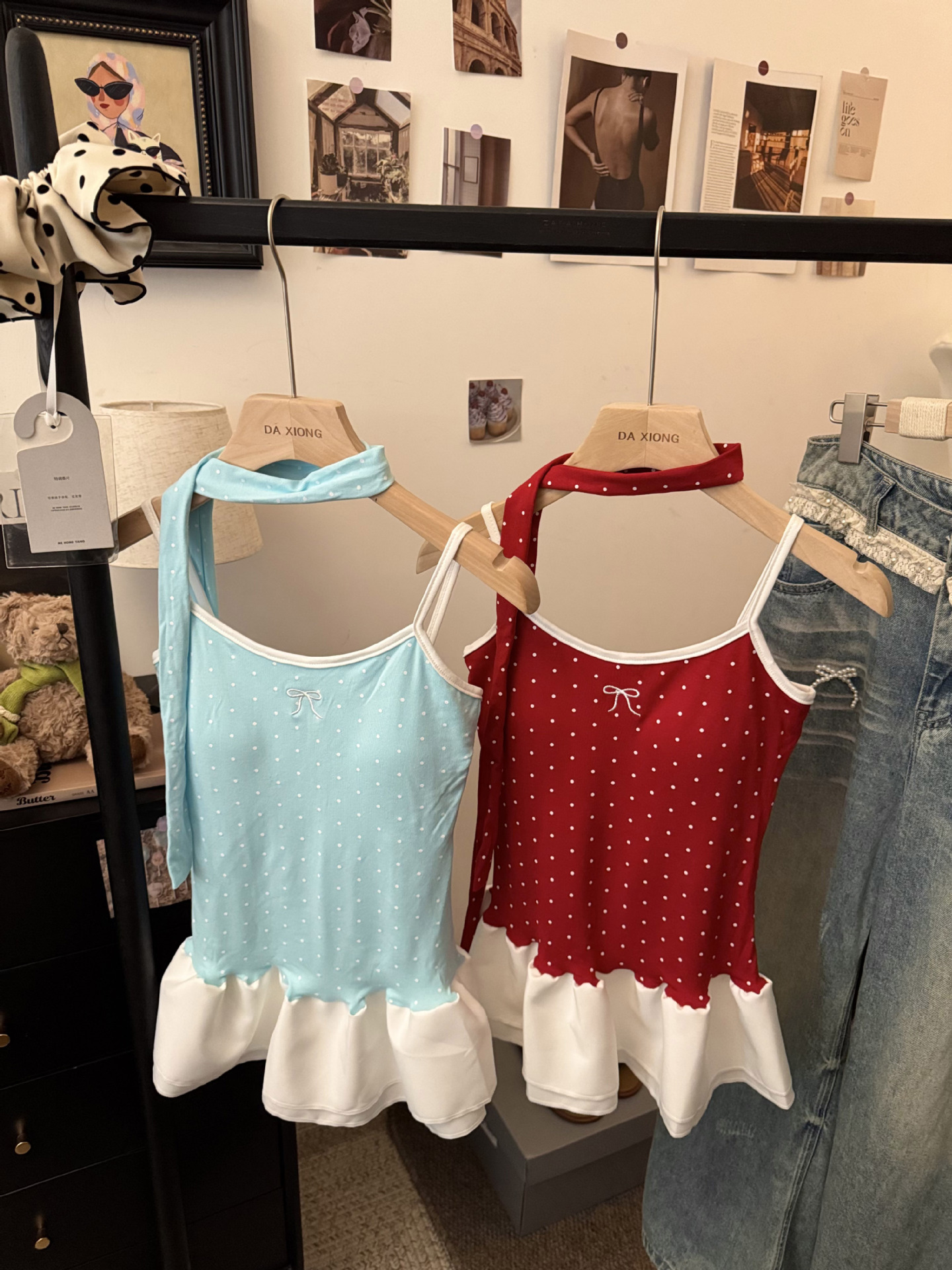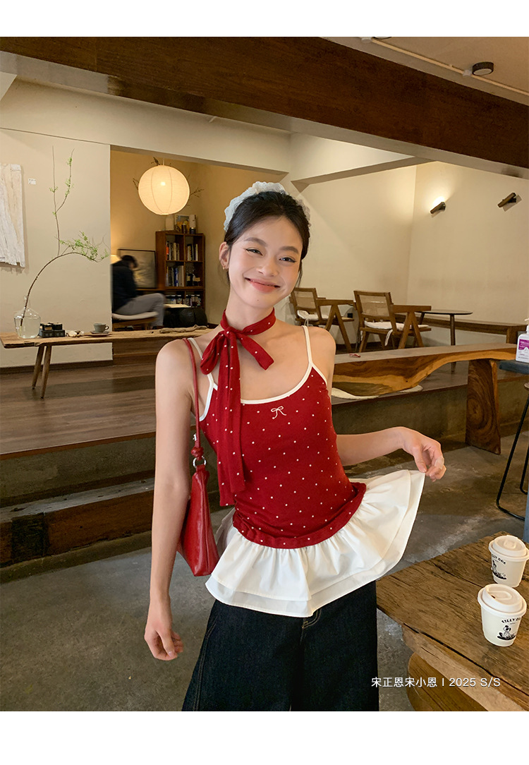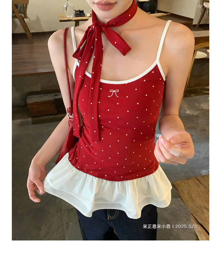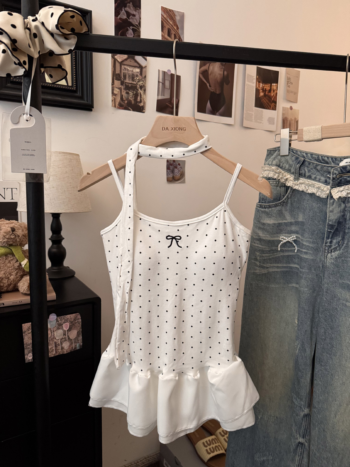 폴카 도트 레드 화이트 캐미솔 여성 여름 신작 밑단 레이스 디자인 슬림핏 탑 트렌디