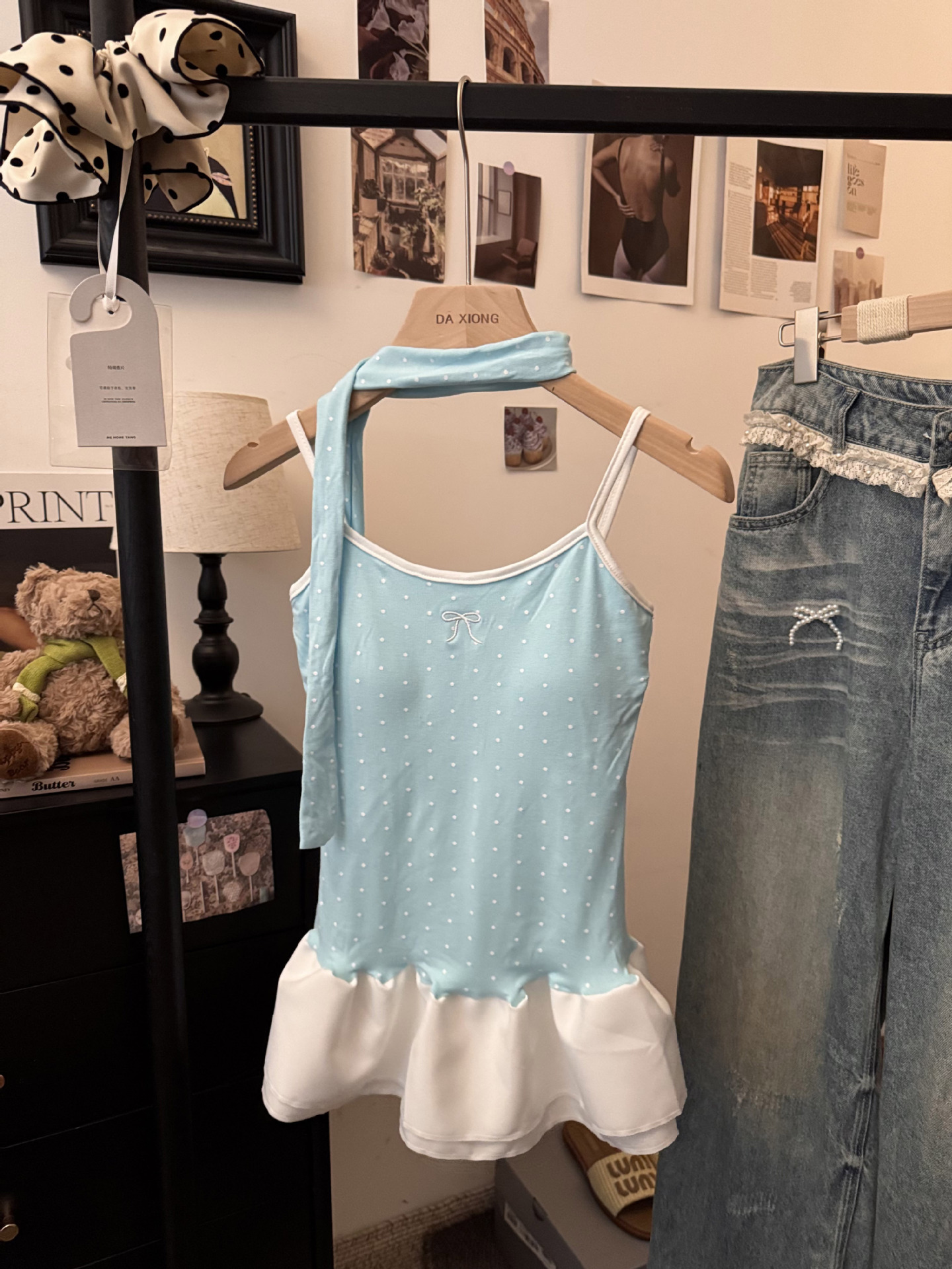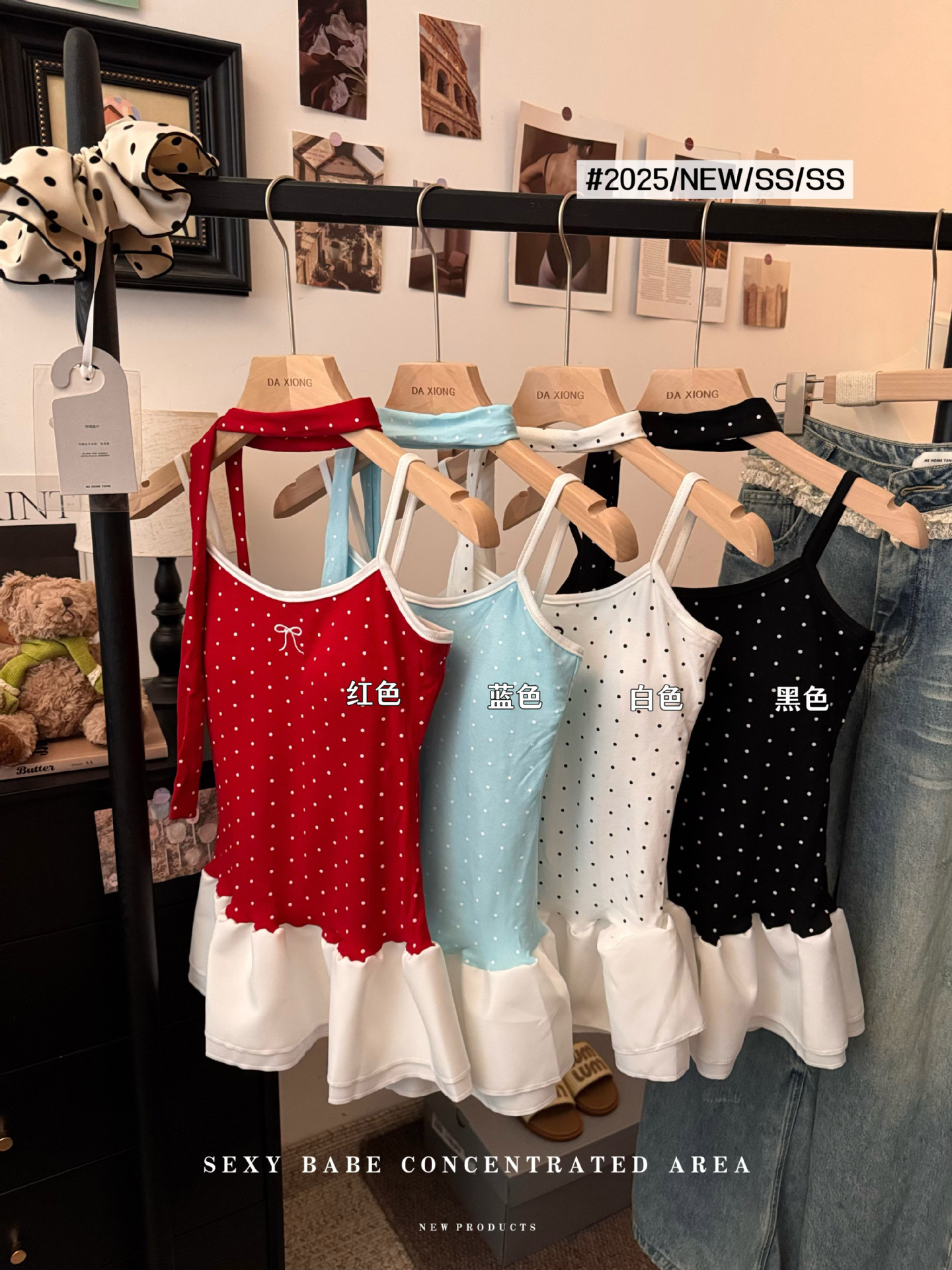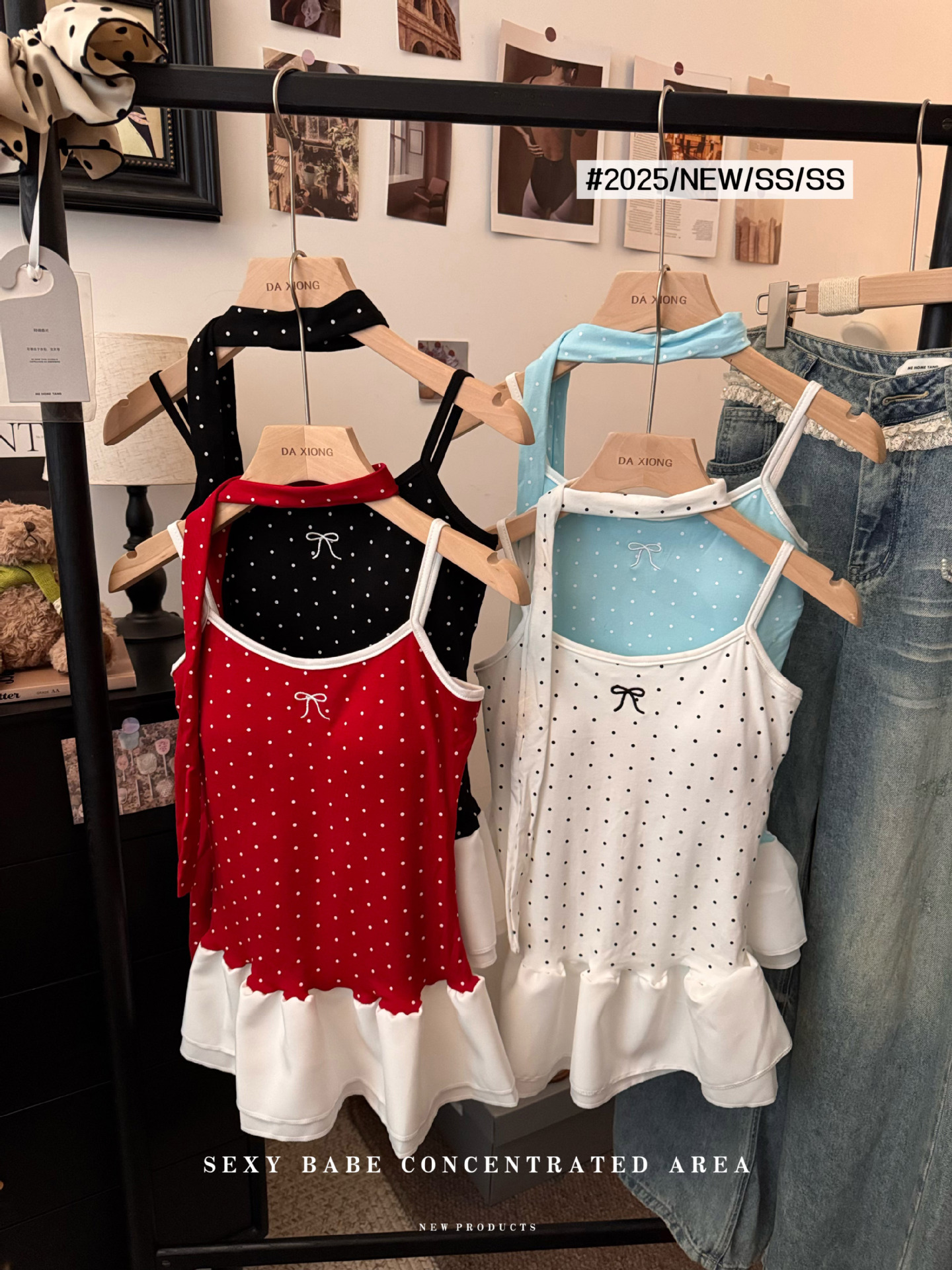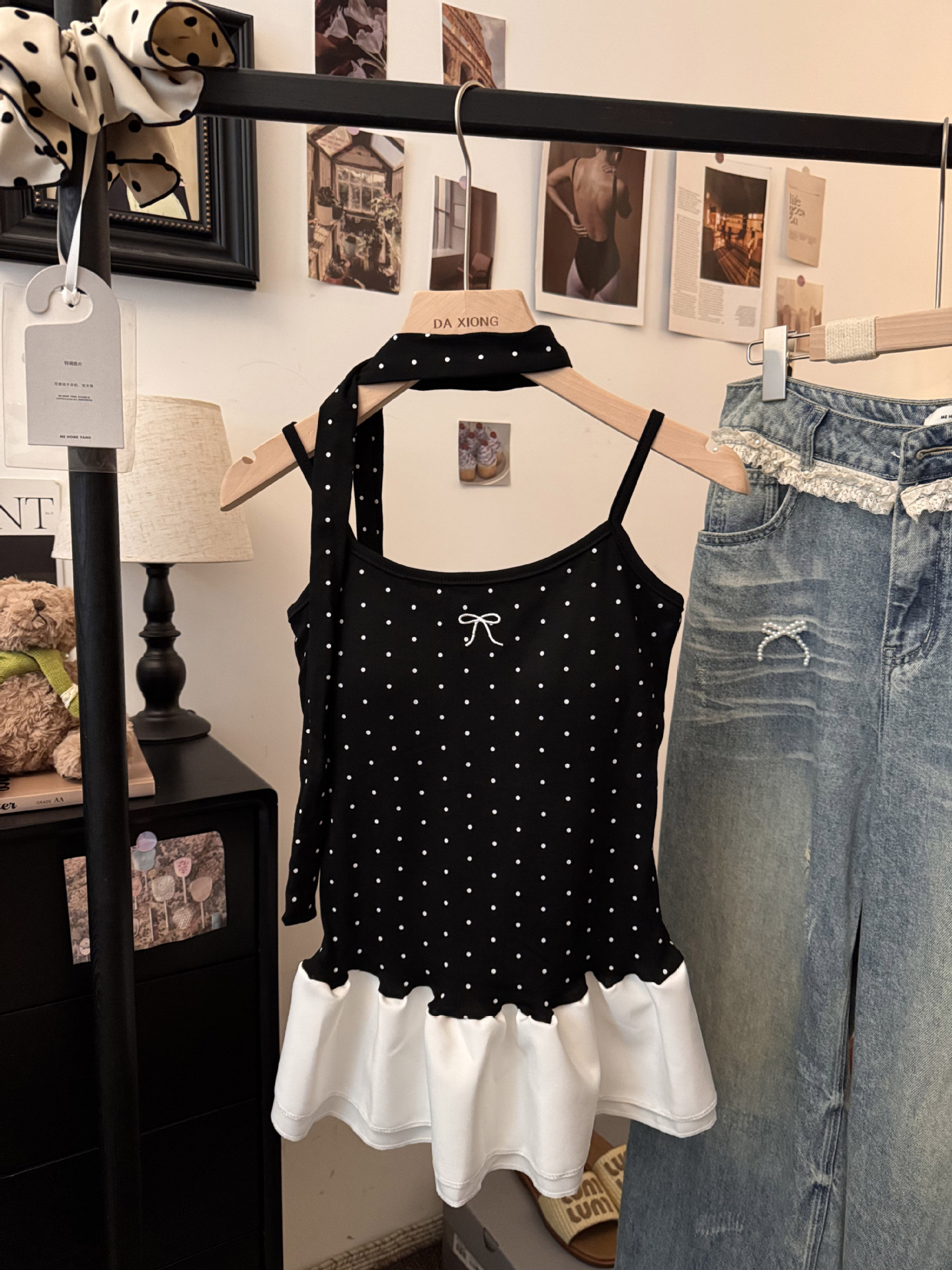 폴카 도트 레드 화이트 캐미솔 여성 여름 신작 밑단 레이스 디자인 슬림핏 탑 트렌디