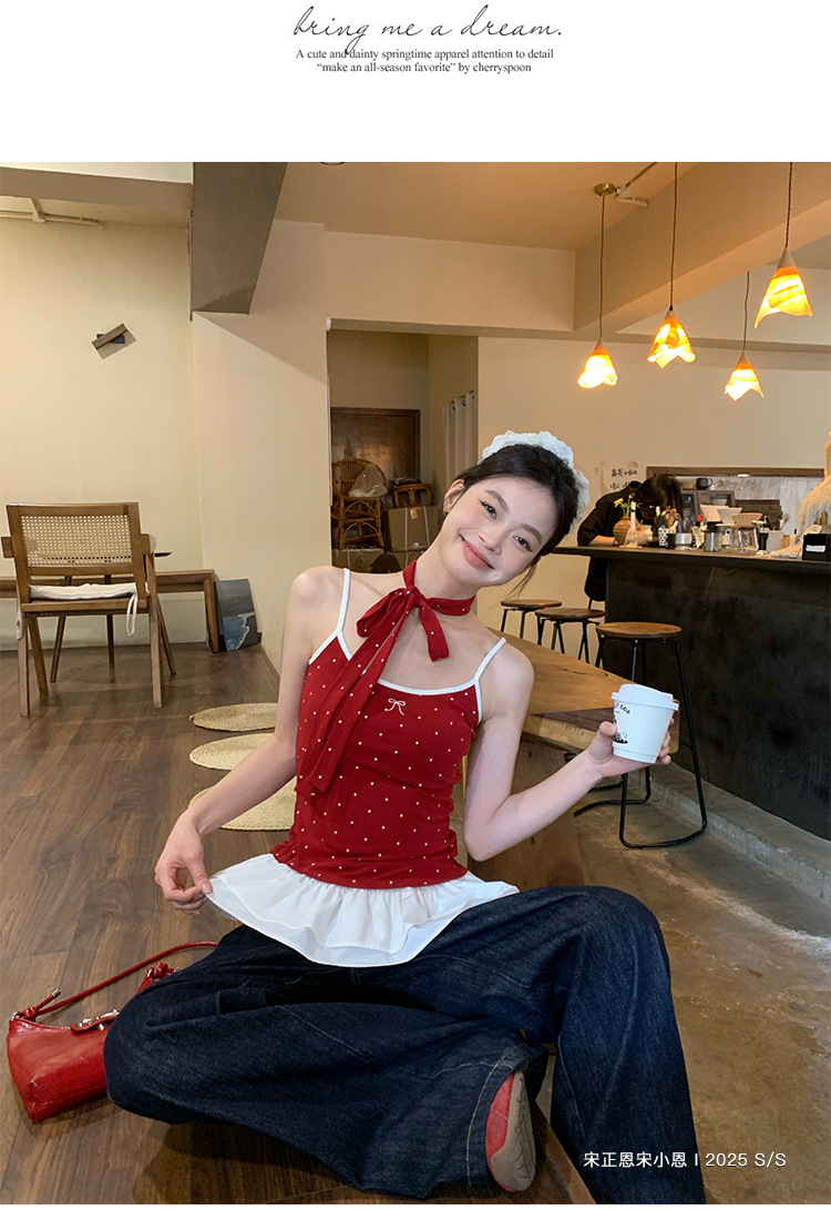 폴카 도트 레드 화이트 캐미솔 여성 여름 신작 밑단 레이스 디자인 슬림핏 탑 트렌디스토어 가기