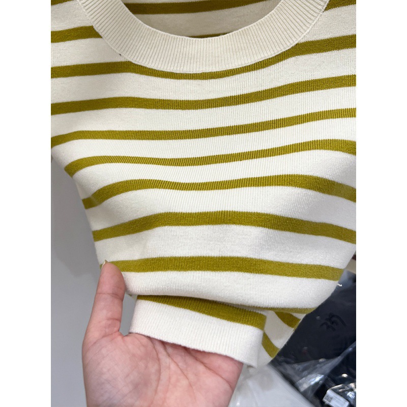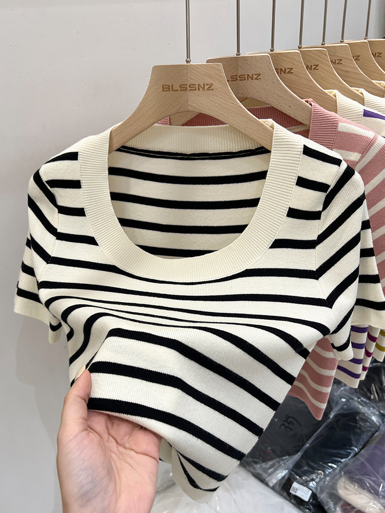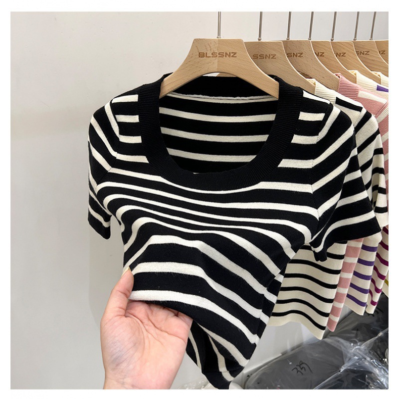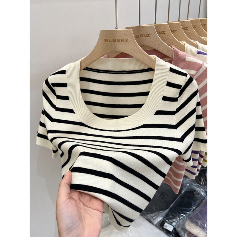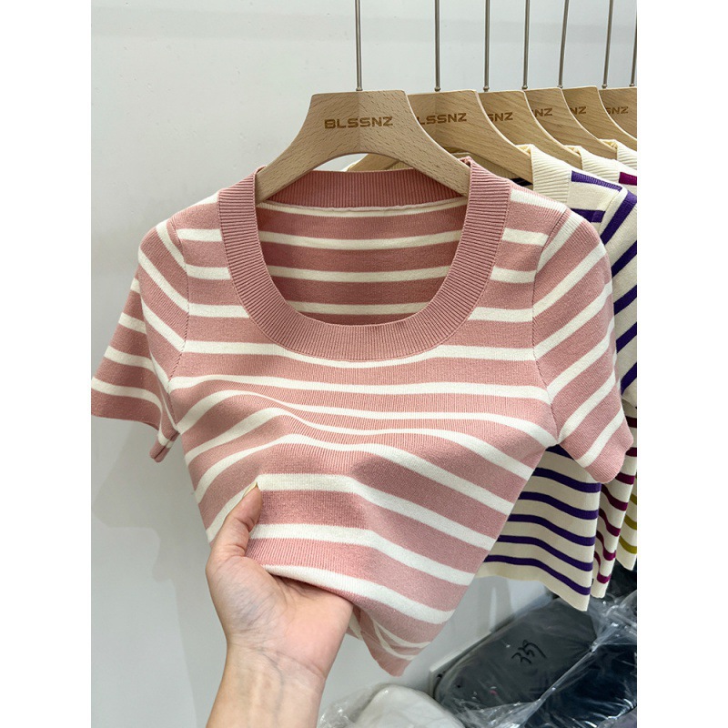 스트라이프 니트 반팔 신선하고 달콤한 심플 슬림 디자인 틈새 탑 여성 2025 여름 신작 패션스토어 가기