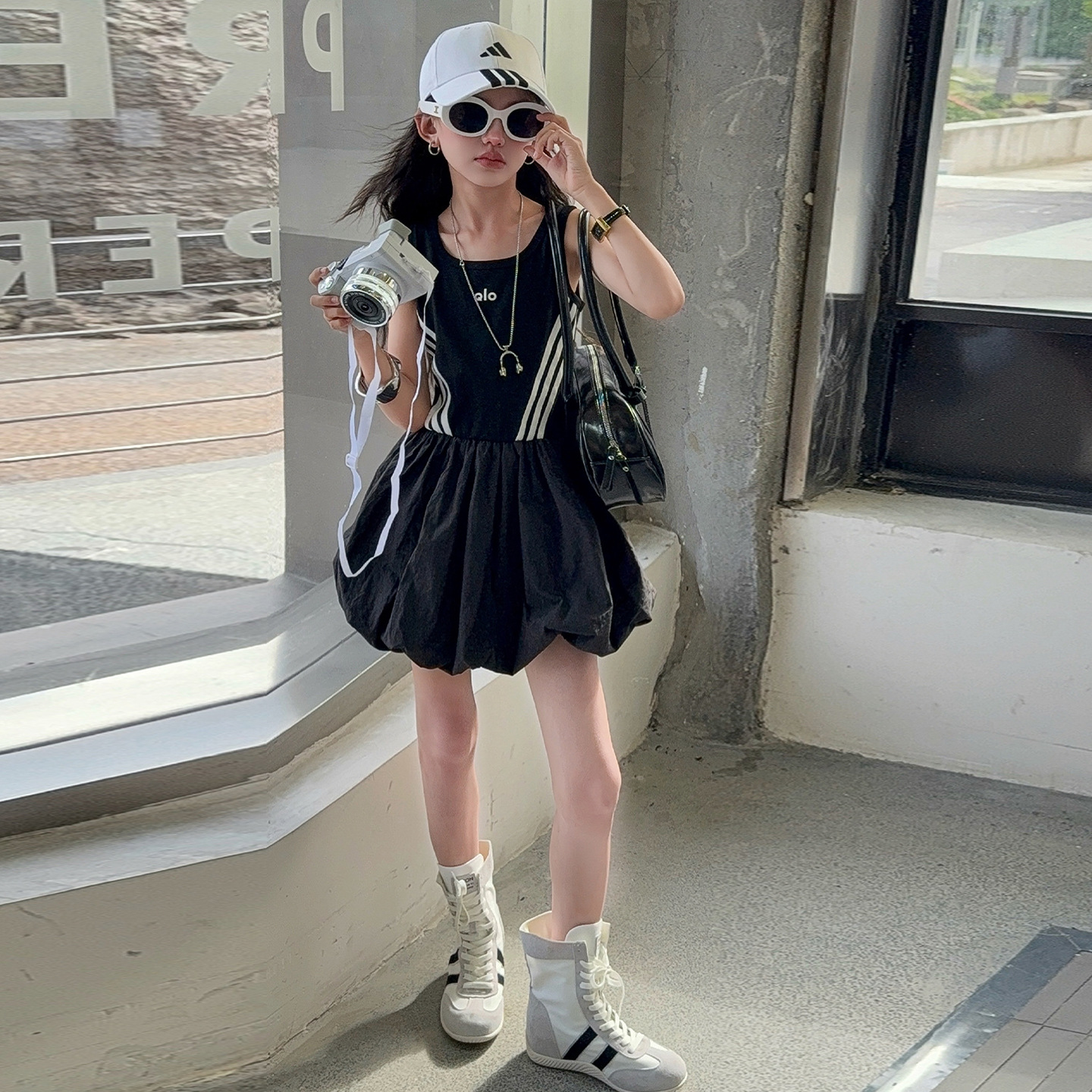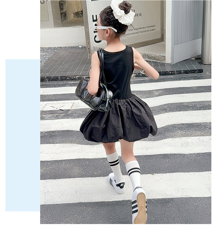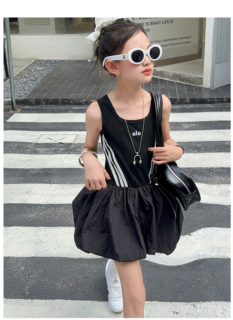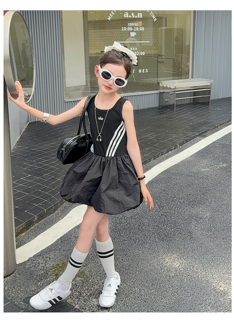 여자 한국 스타일 스포츠 스타일 캐주얼 민소매 드레스 2025 여름 새로운 스타일 중대형 어린이 스트라이프 퍼프 스커트스토어 가기