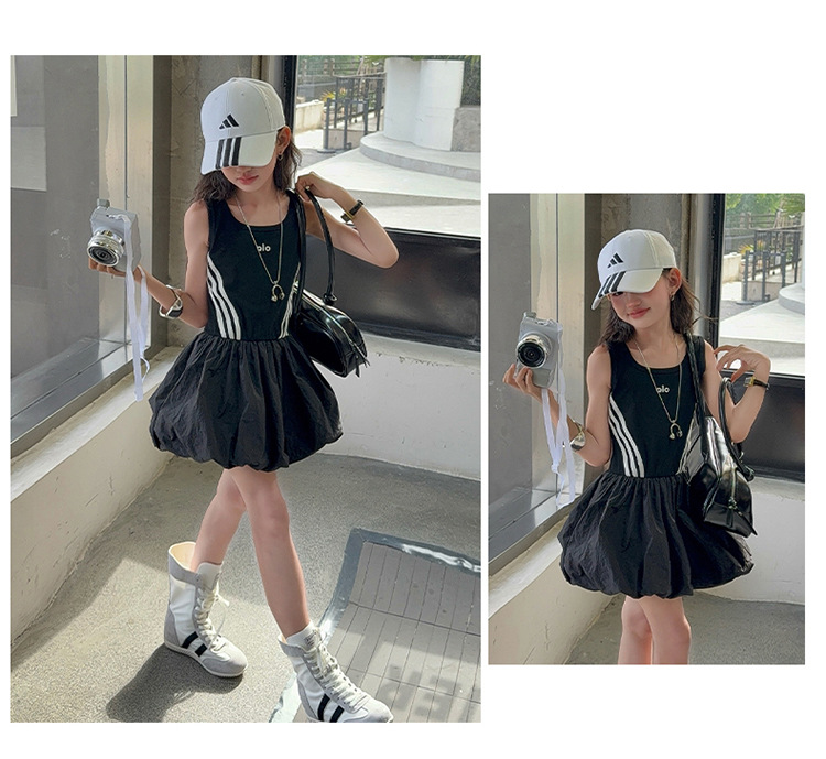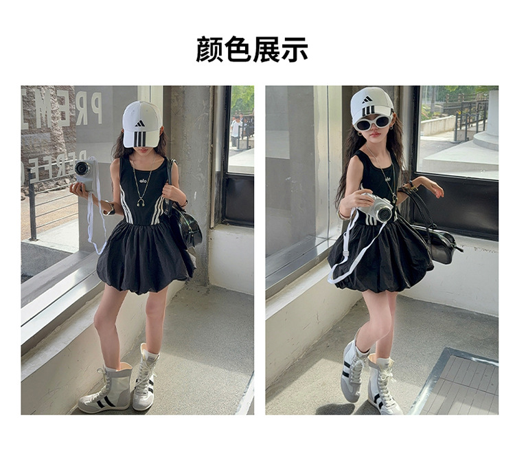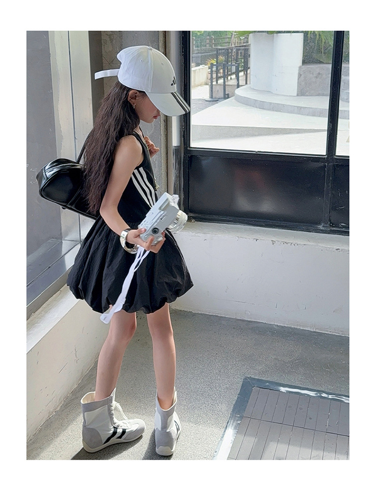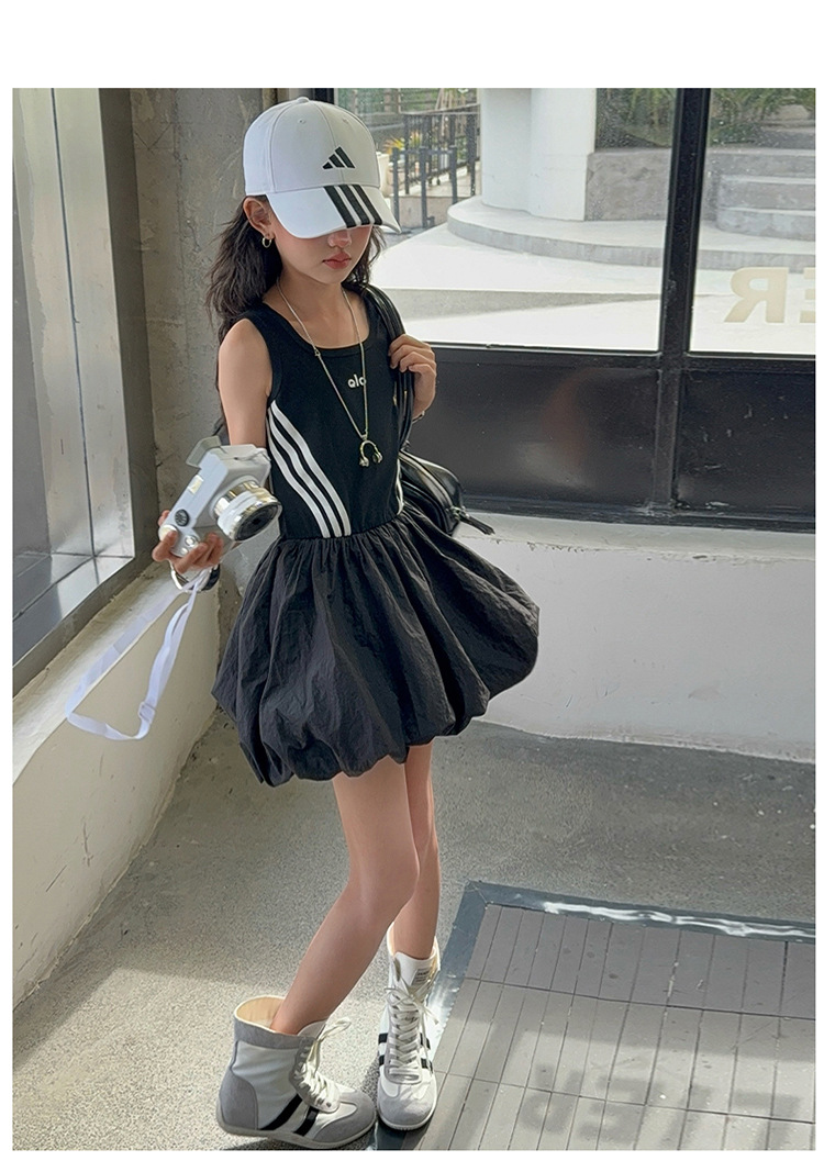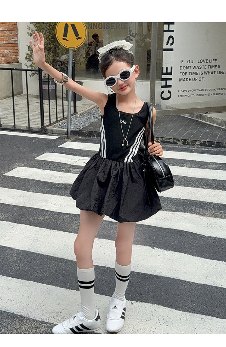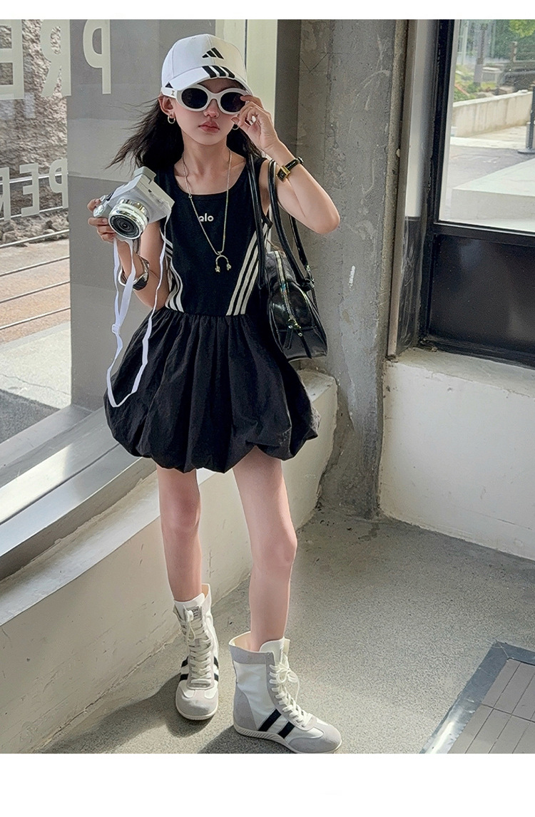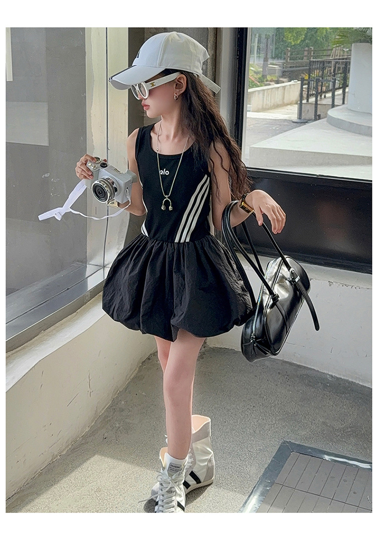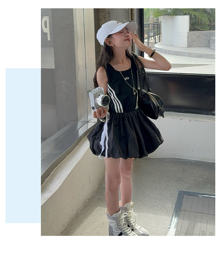 여자 한국 스타일 스포츠 스타일 캐주얼 민소매 드레스 2025 여름 새로운 스타일 중대형 어린이 스트라이프 퍼프 스커트