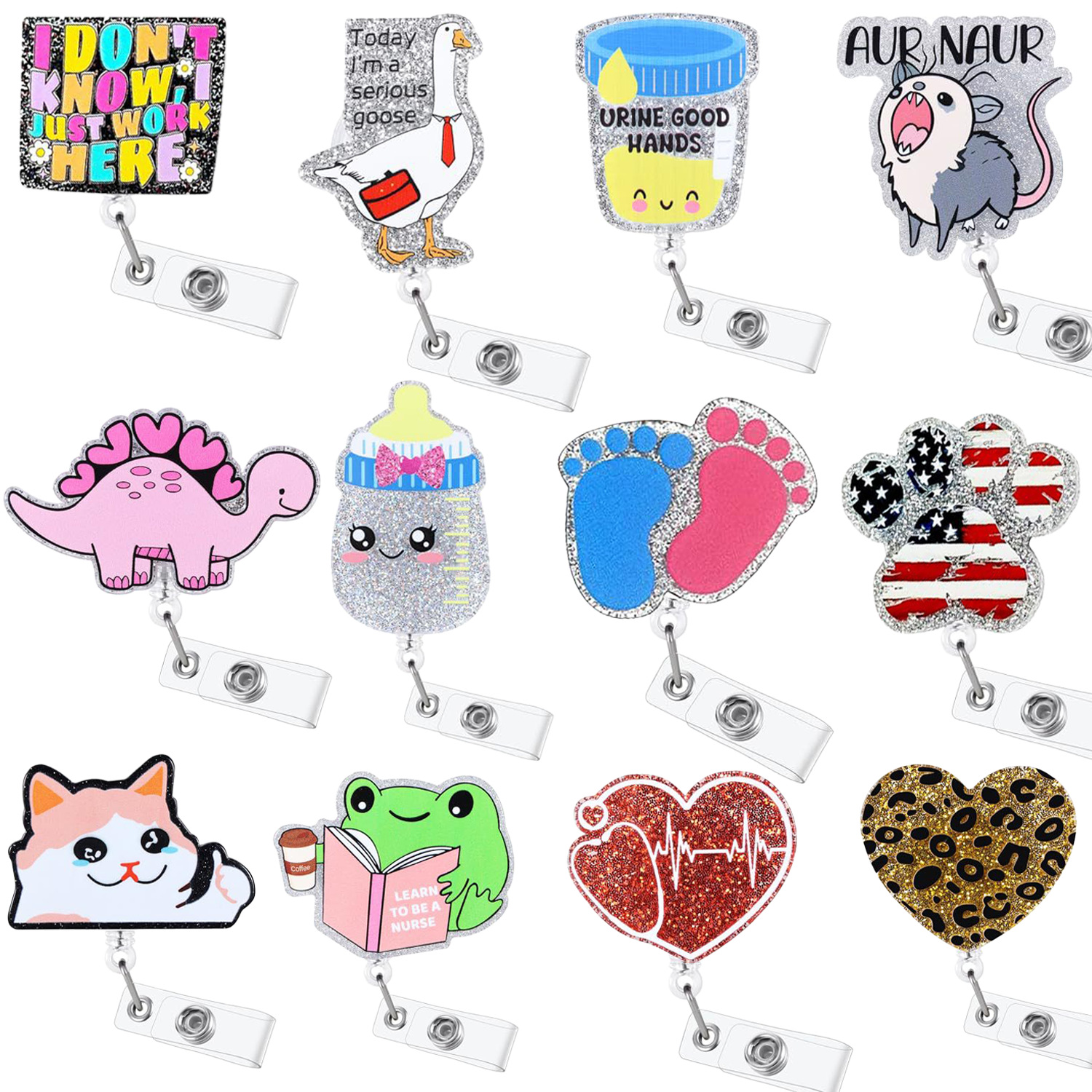 국경 간 아크릴 만화 거위 배지 릴 영어 반짝이 이름표 ID 홀더 참신 의료 간편 릴락 버클 사용자 정의스토어 가기