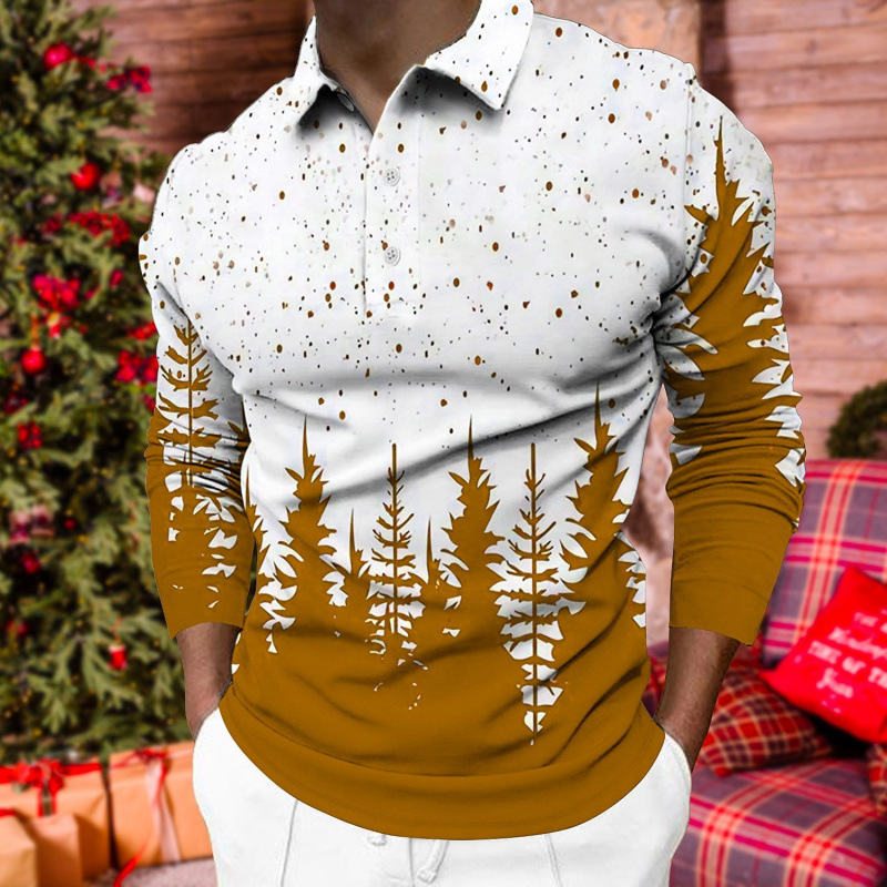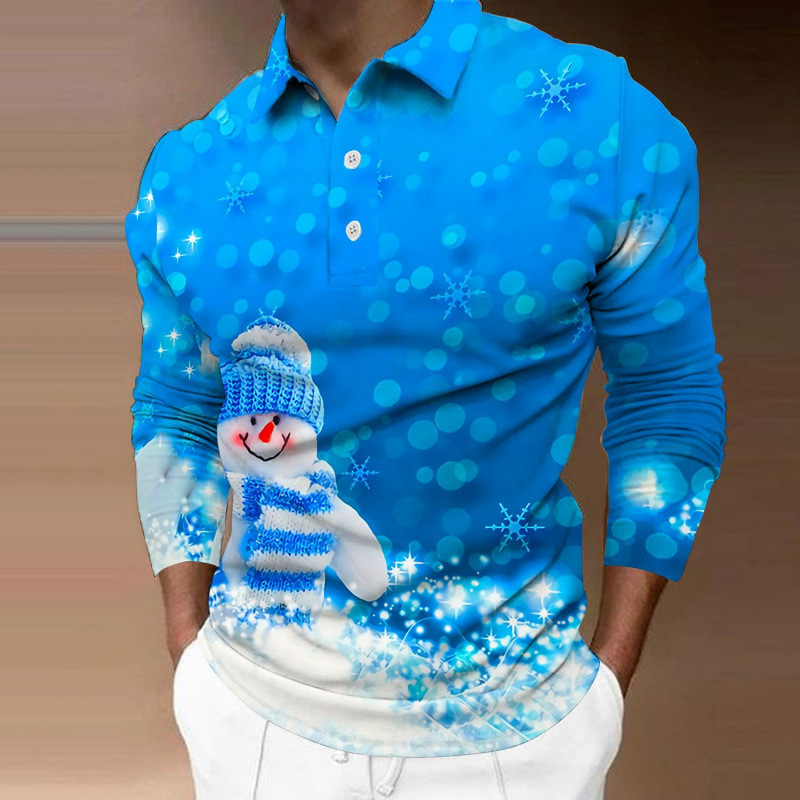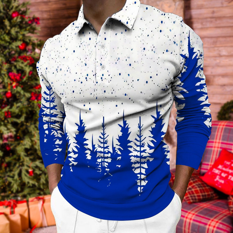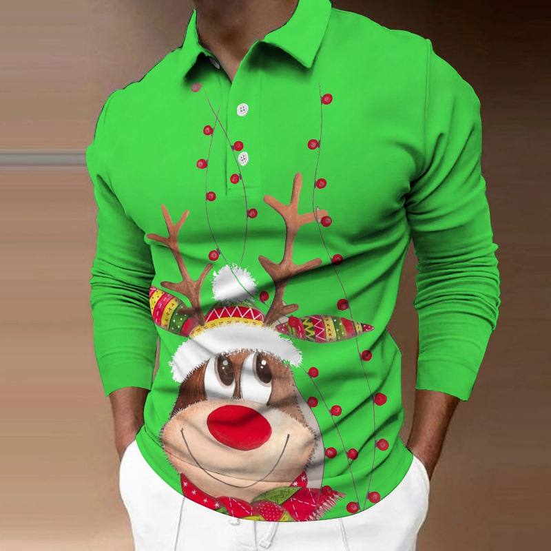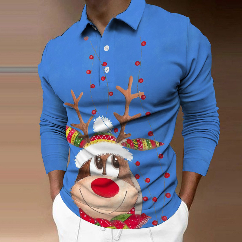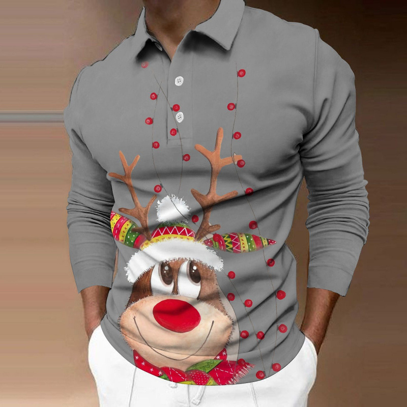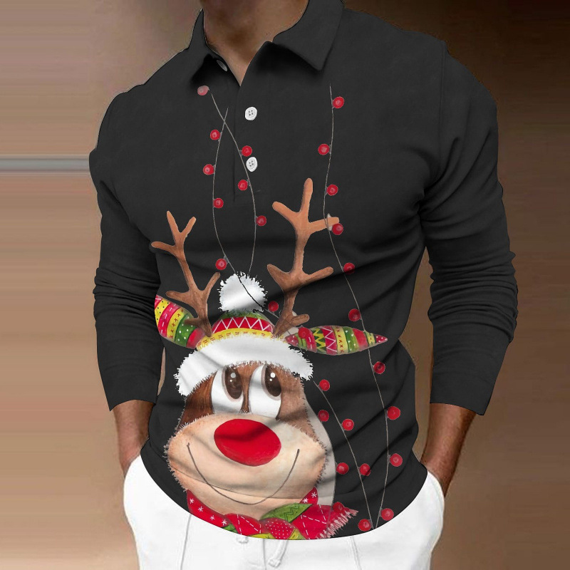 크로스보더 3D 긴팔 버튼 프린트 폴로 셔츠 라펠 남성용 크리스마스 동물 엘크 골프 셔츠 남성용스토어 가기
