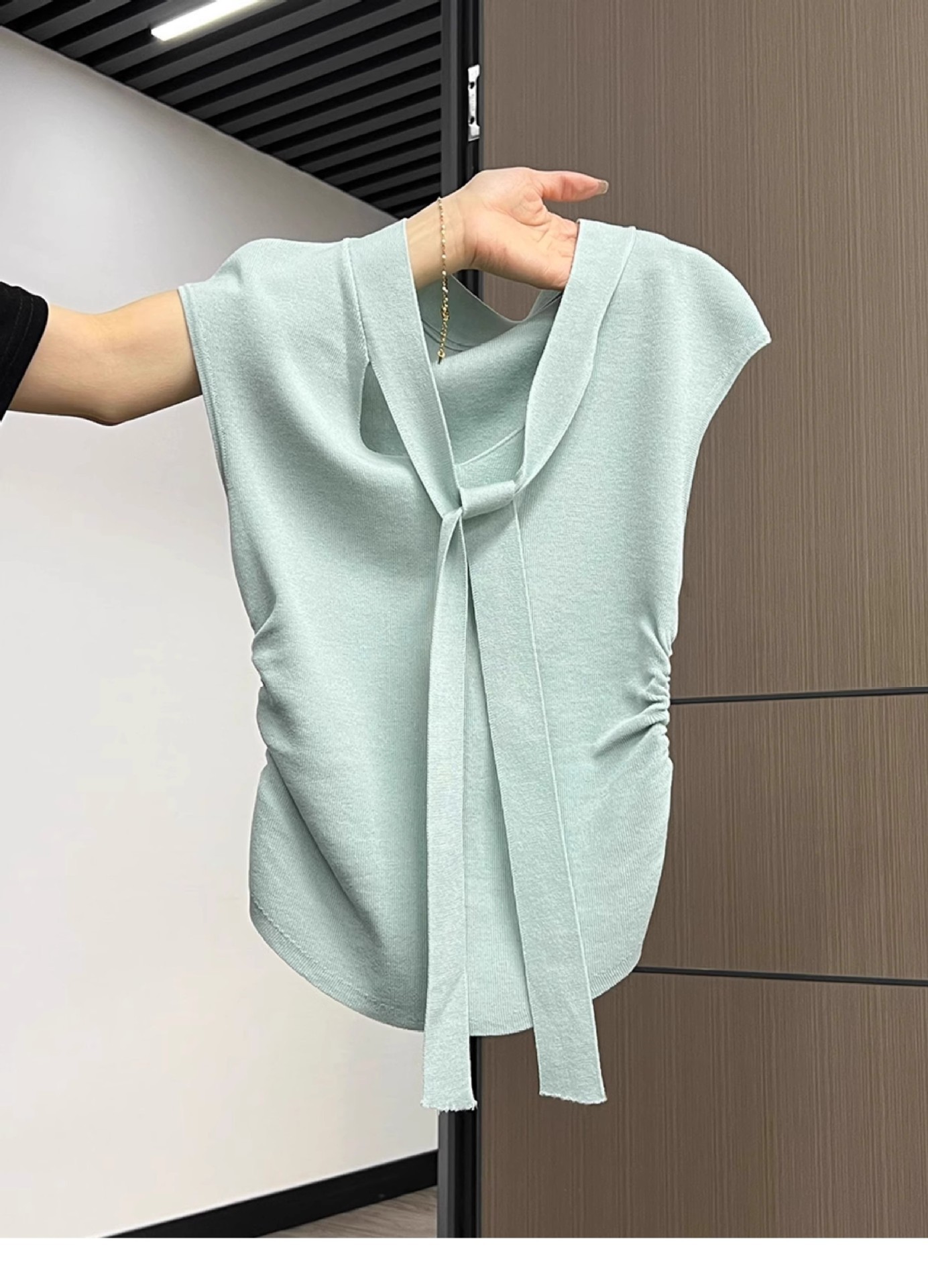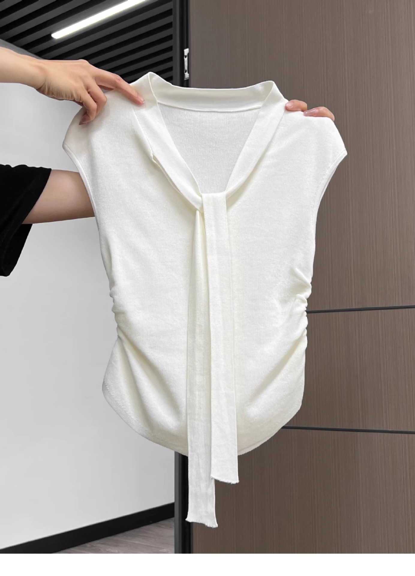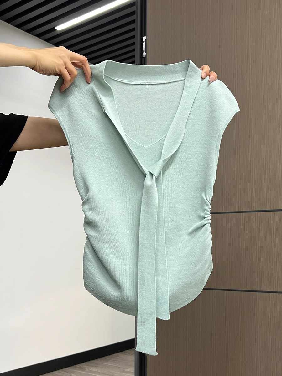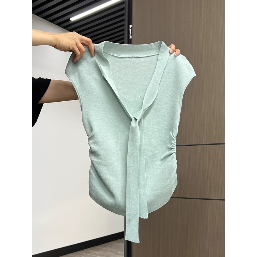 여름에 작은 체형을 가진 여성을 위한 민소매 클리어 워터 블루 리본 브이넥 플리츠 스웨터, 슬림핏 이너웨어, 아름다운 탑스토어 가기