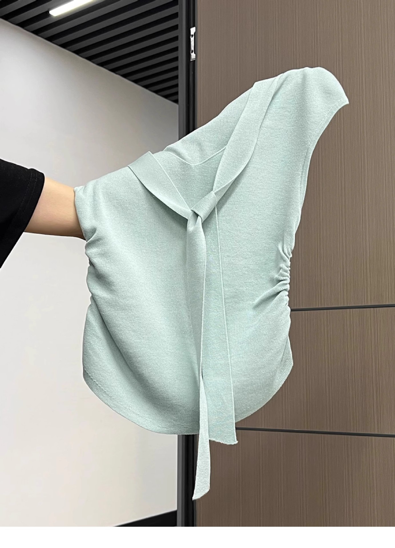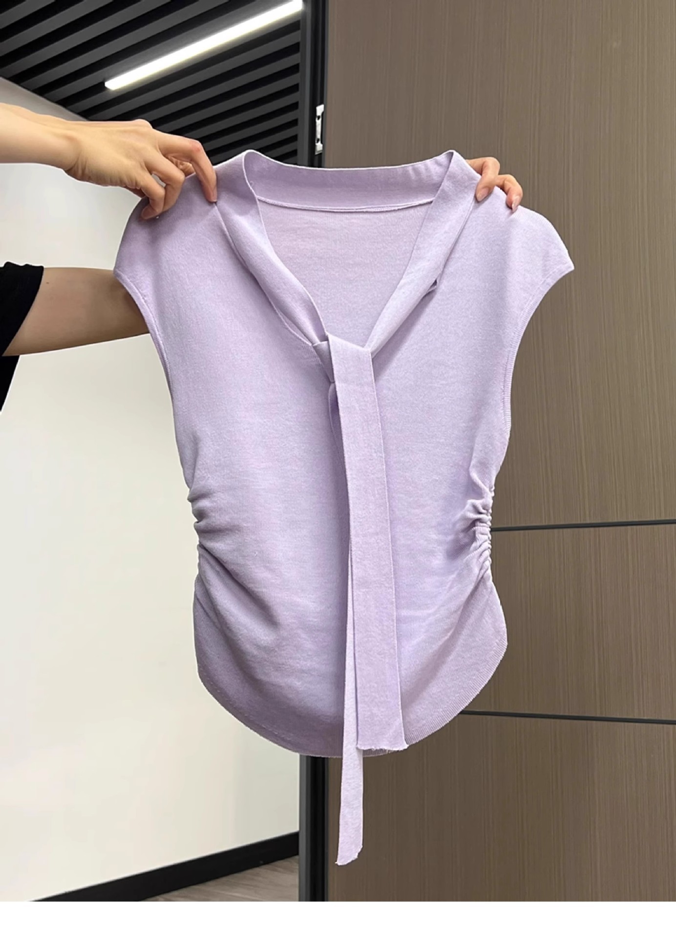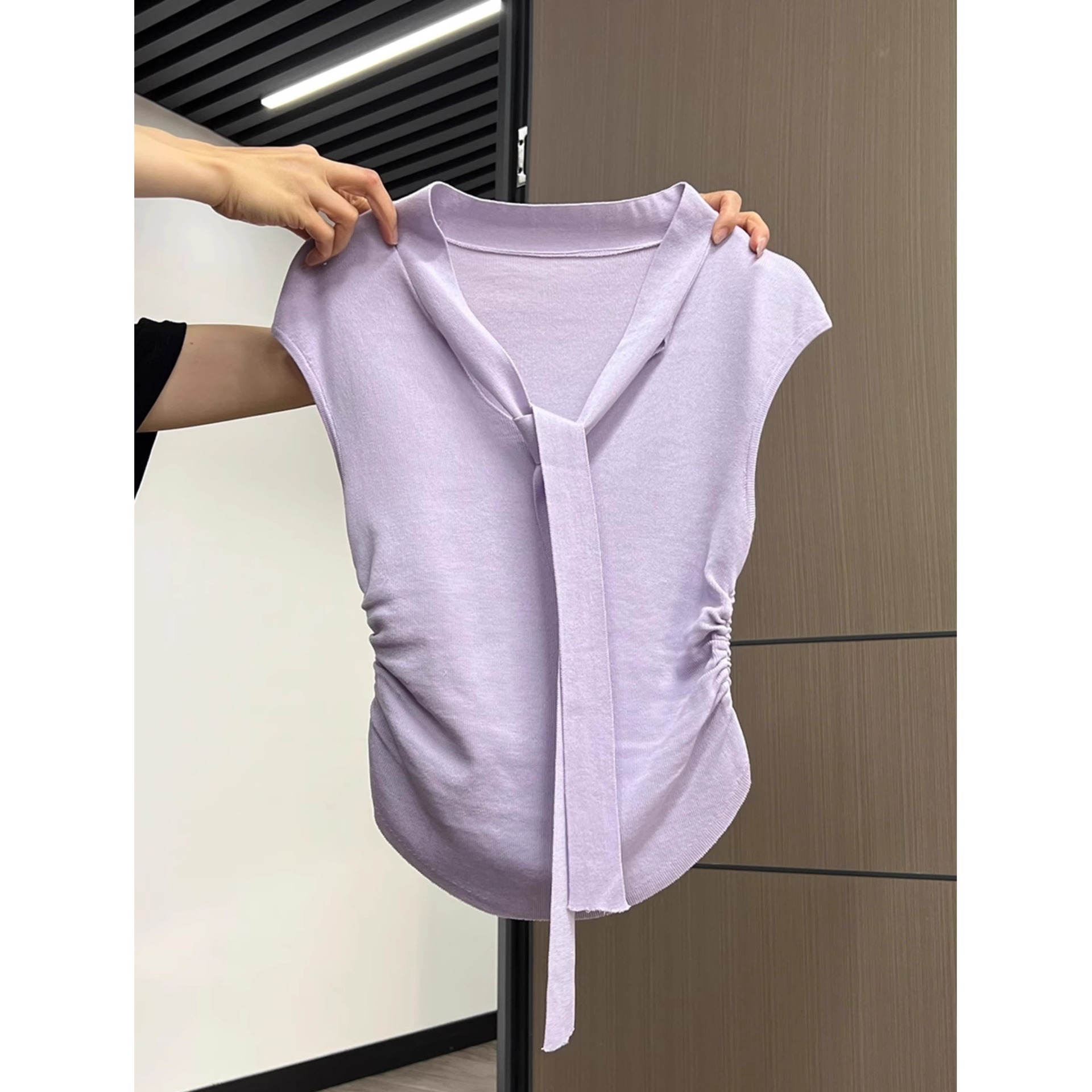 여름에 작은 체형을 가진 여성을 위한 민소매 클리어 워터 블루 리본 브이넥 플리츠 스웨터, 슬림핏 이너웨어, 아름다운 탑스토어 가기
