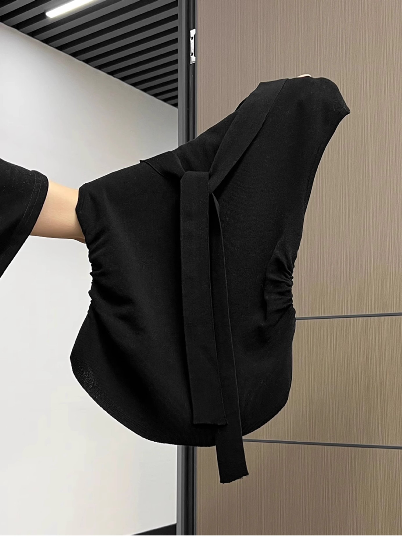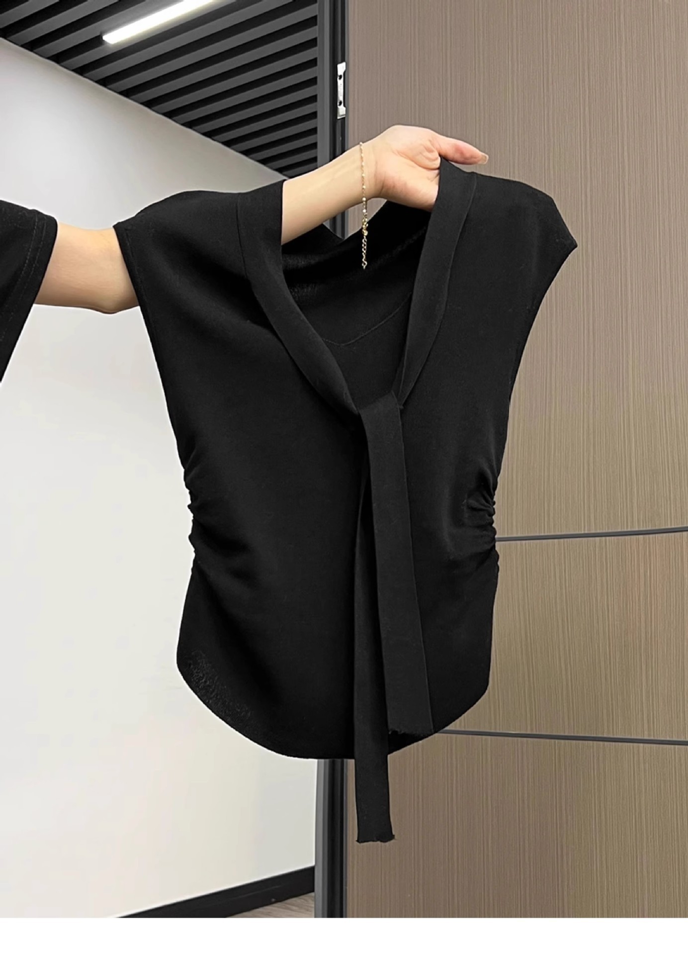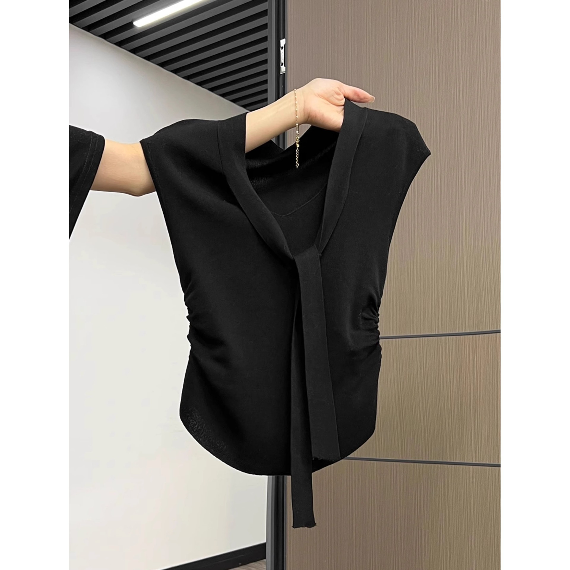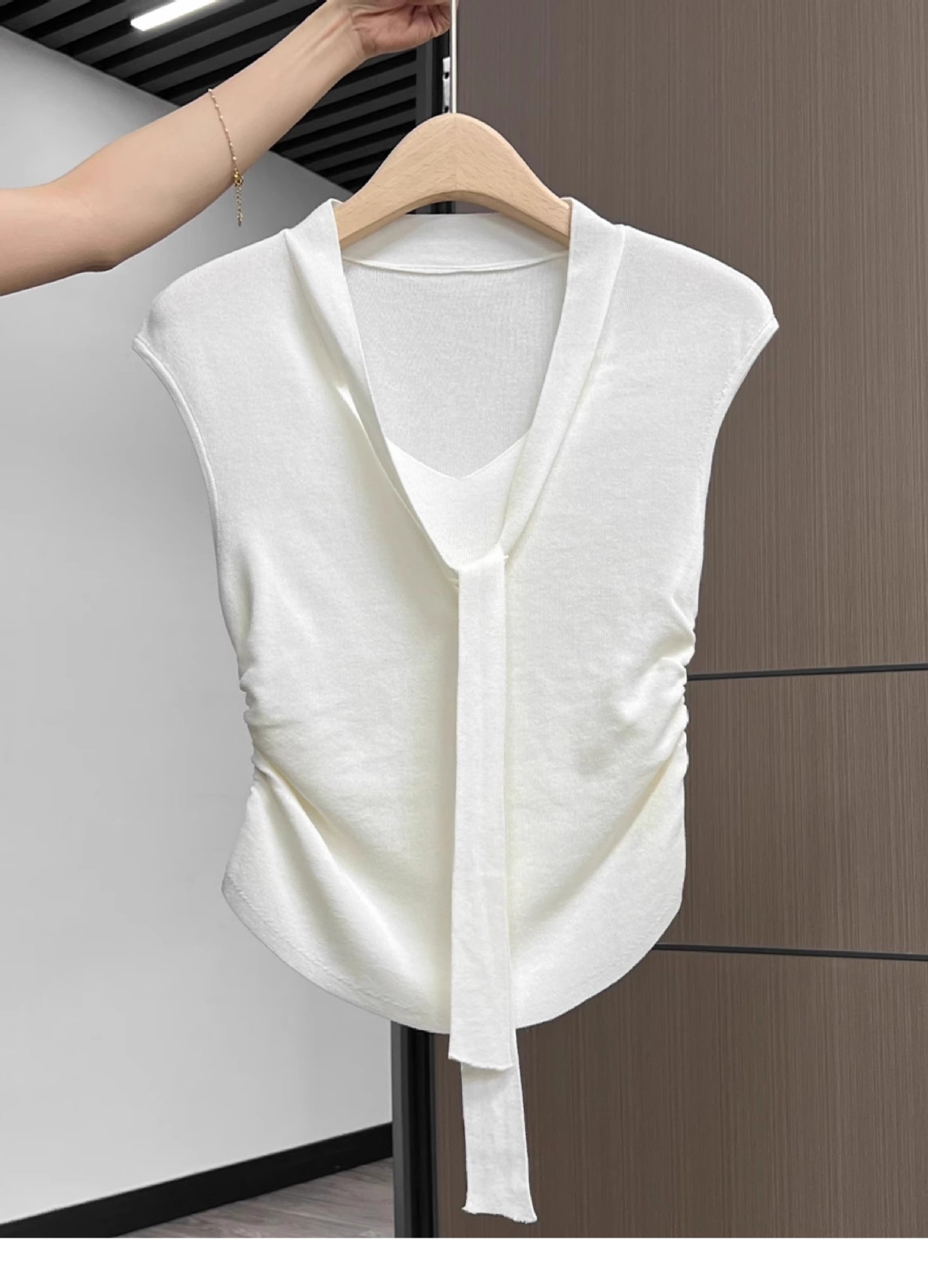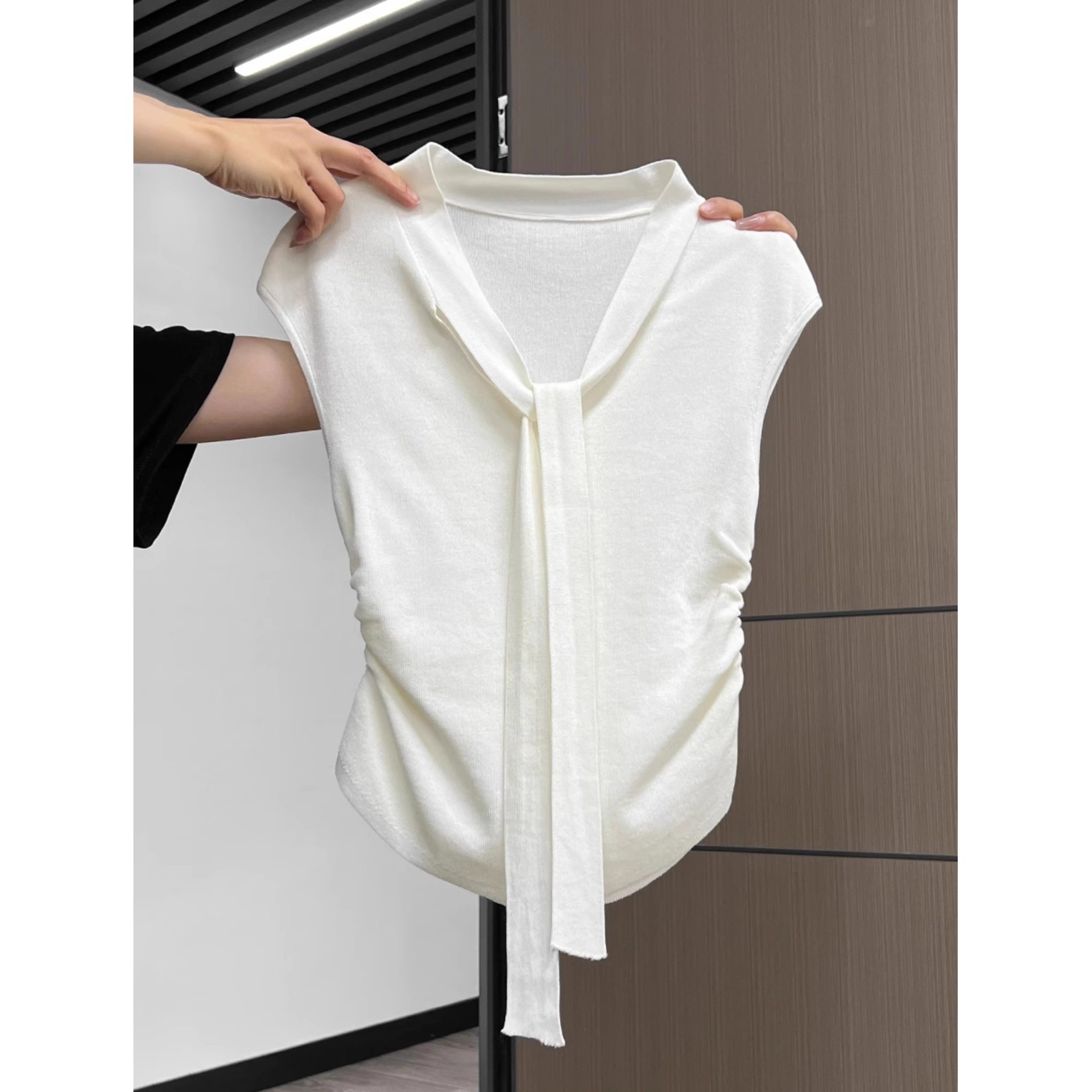 여름에 작은 체형을 가진 여성을 위한 민소매 클리어 워터 블루 리본 브이넥 플리츠 스웨터, 슬림핏 이너웨어, 아름다운 탑