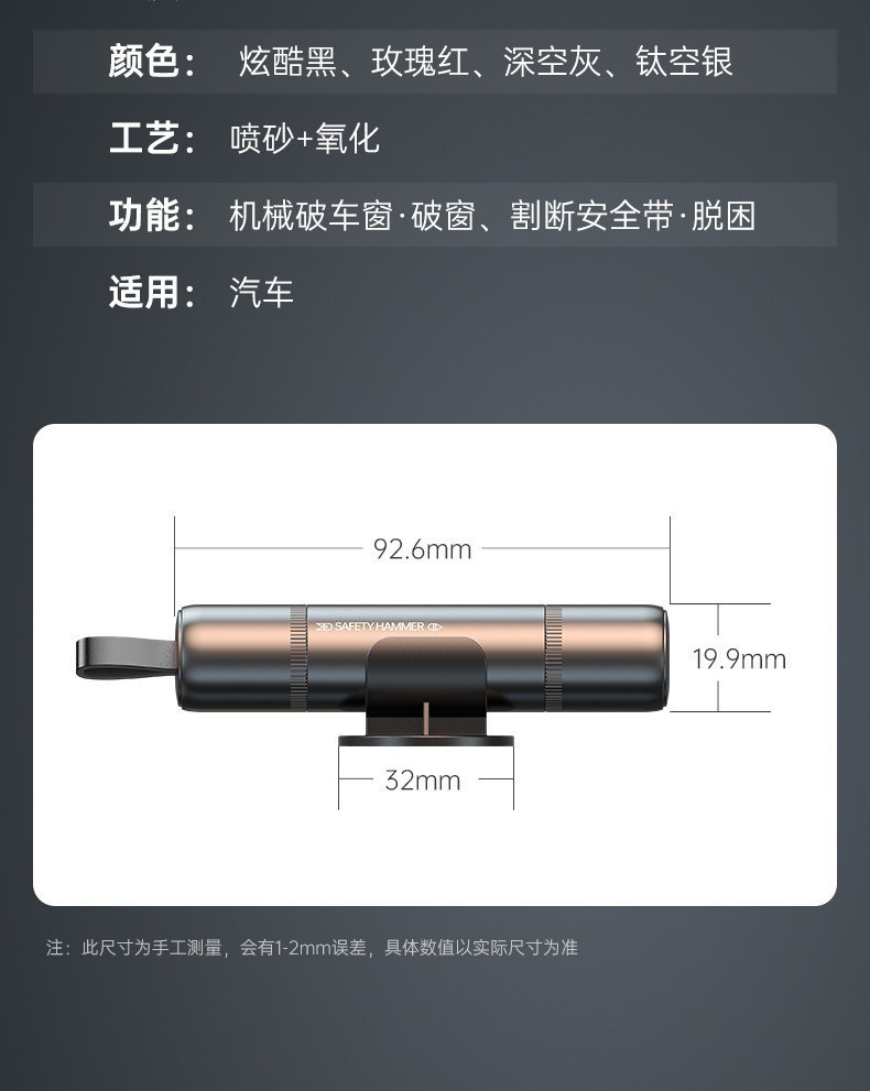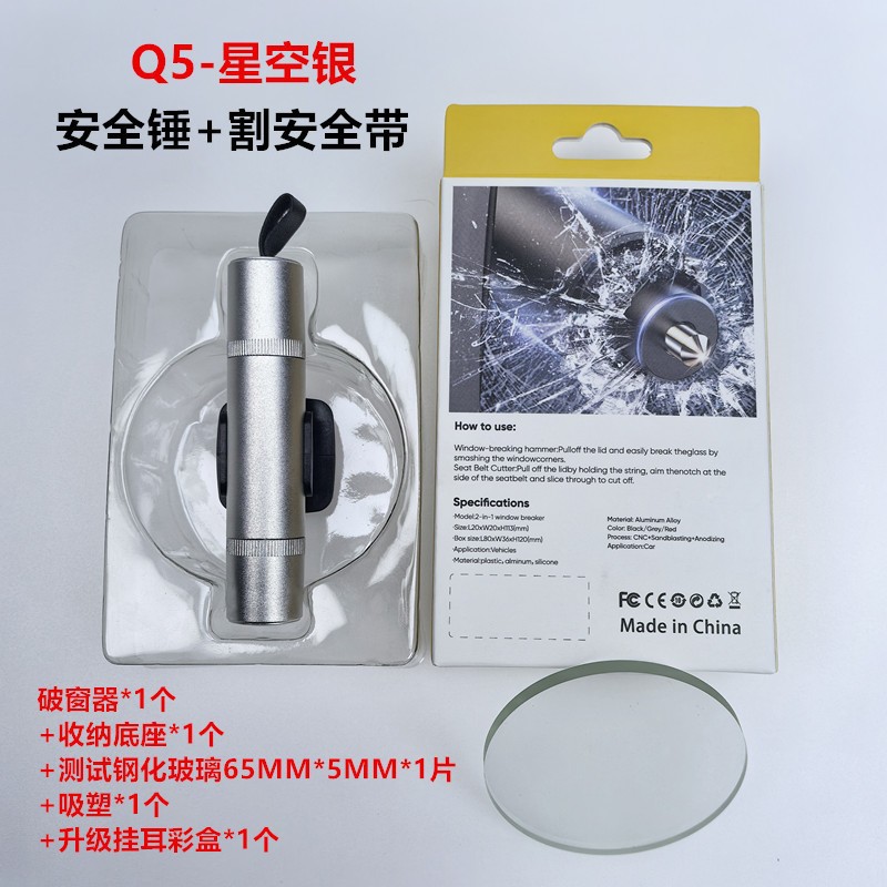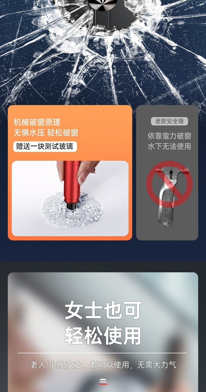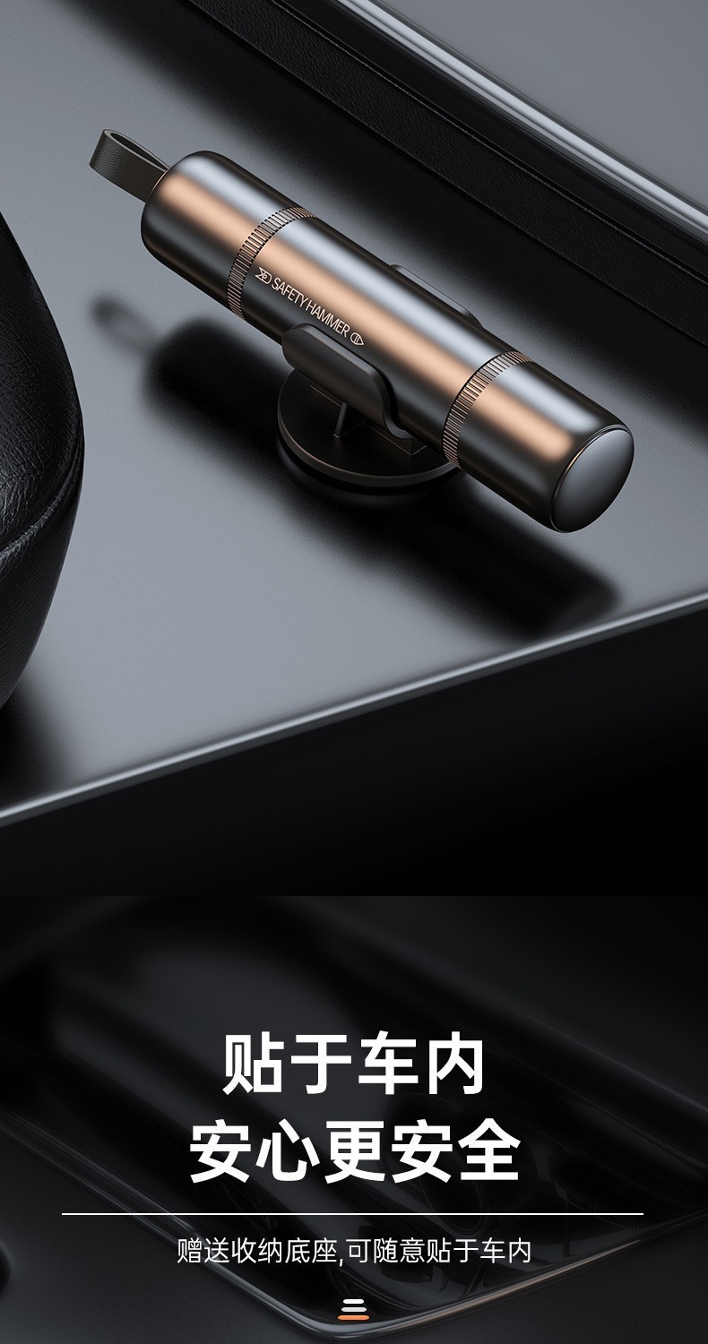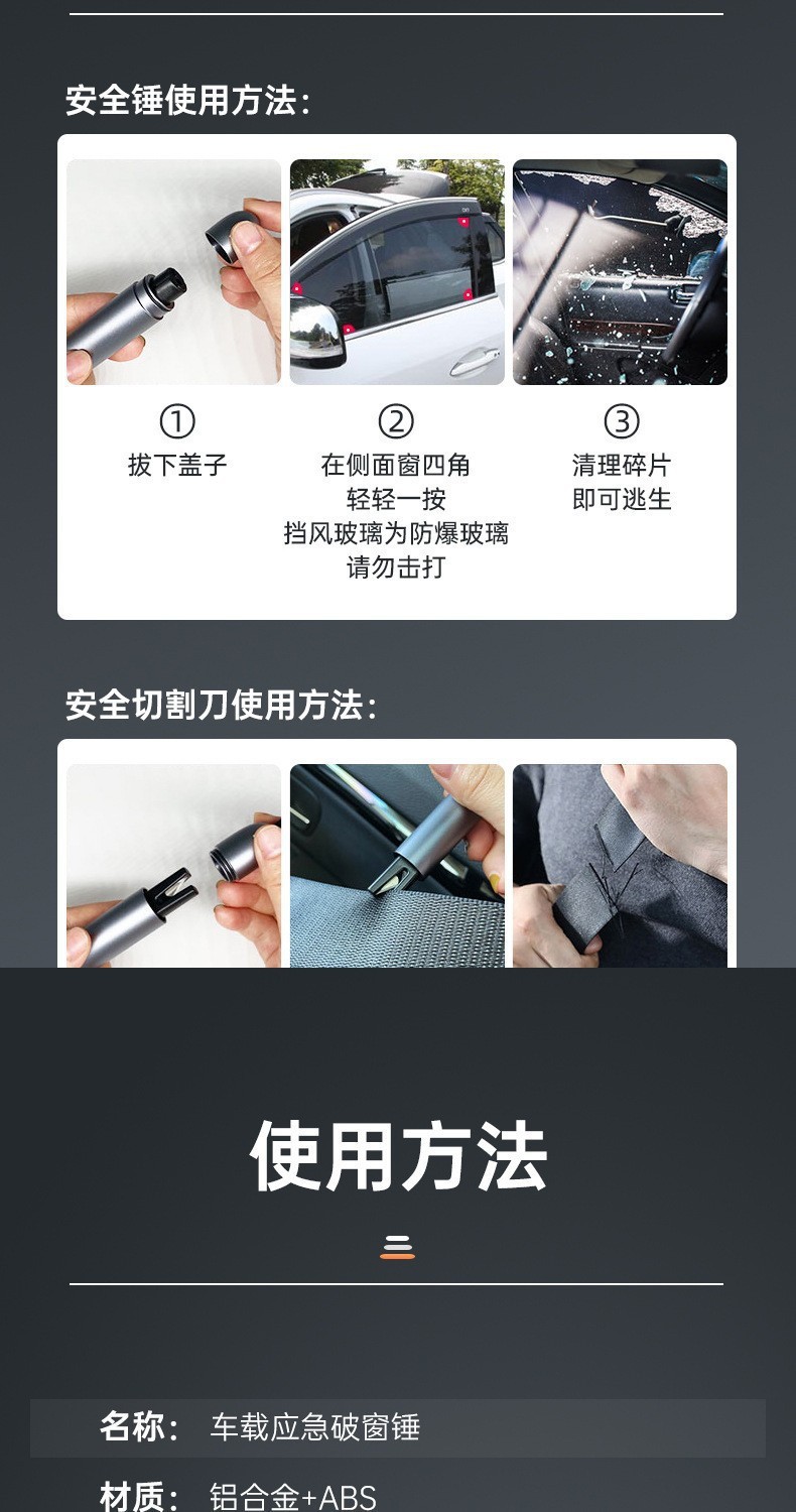 【产品特点】:二合一功能 自救、逃生破窗 开车人都该有的保命神器!航空合金破窗锤+安全带割刀,高雅的外观,精致又实用。合金钢锤头,坚硬无比,关键时刻能迅速破窗 ;隐藏式割刀,轻松割断安全带。别看它小小一支,却是危急时刻的“救命稻草”。现在下单,还送测试玻璃,送收纳底座,赶紧为爱车添置2个