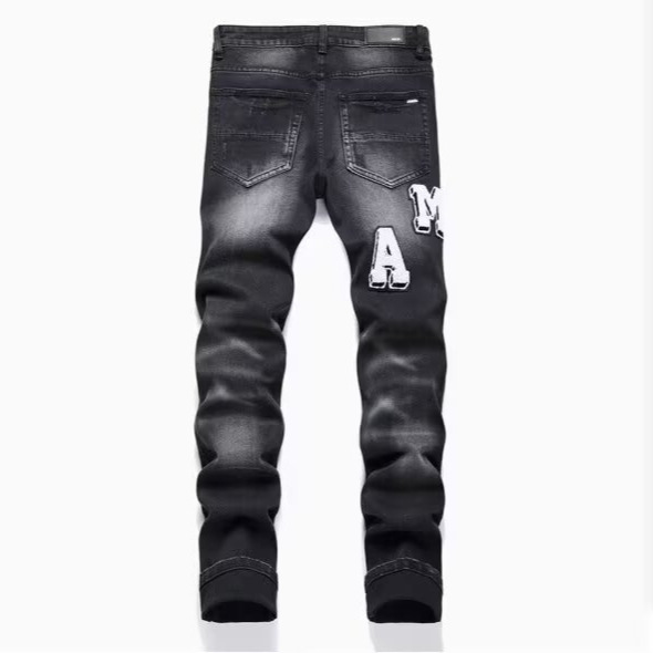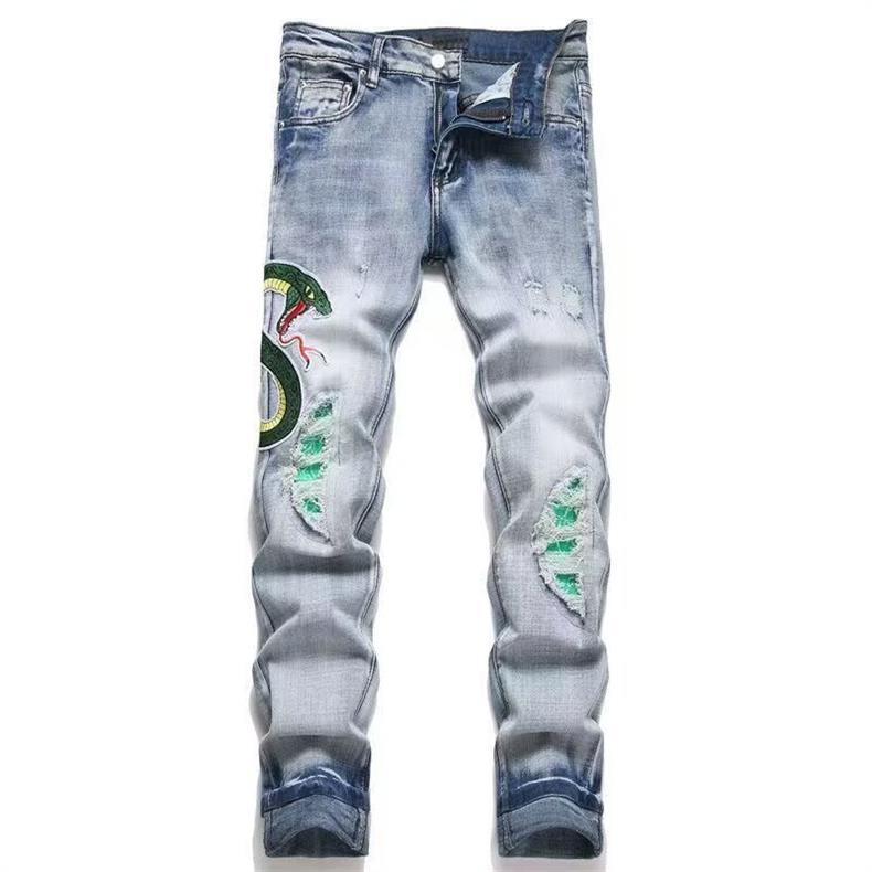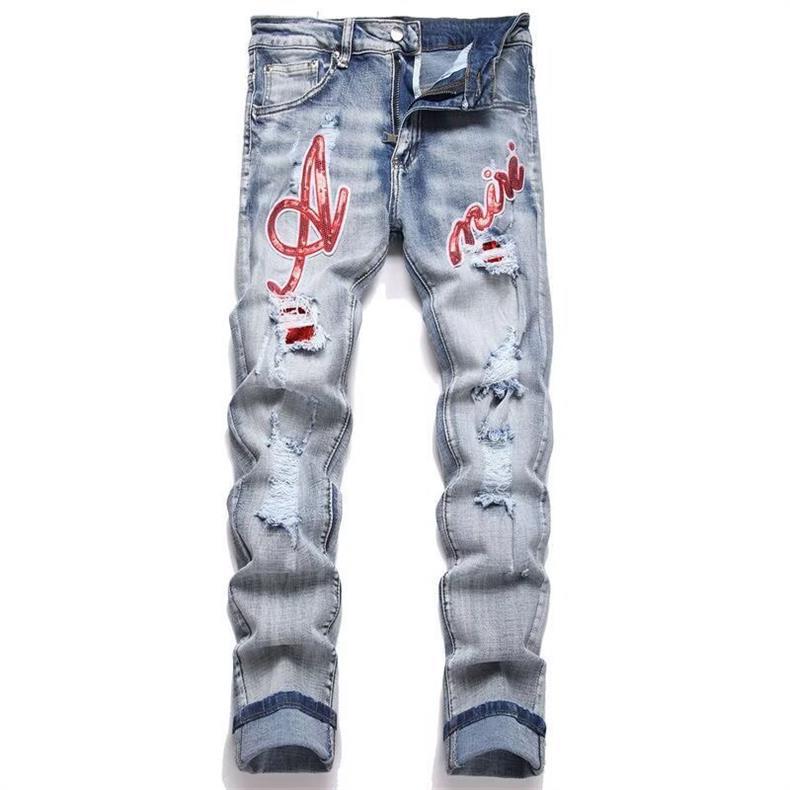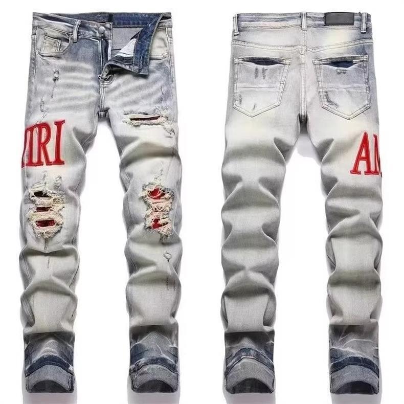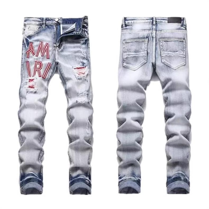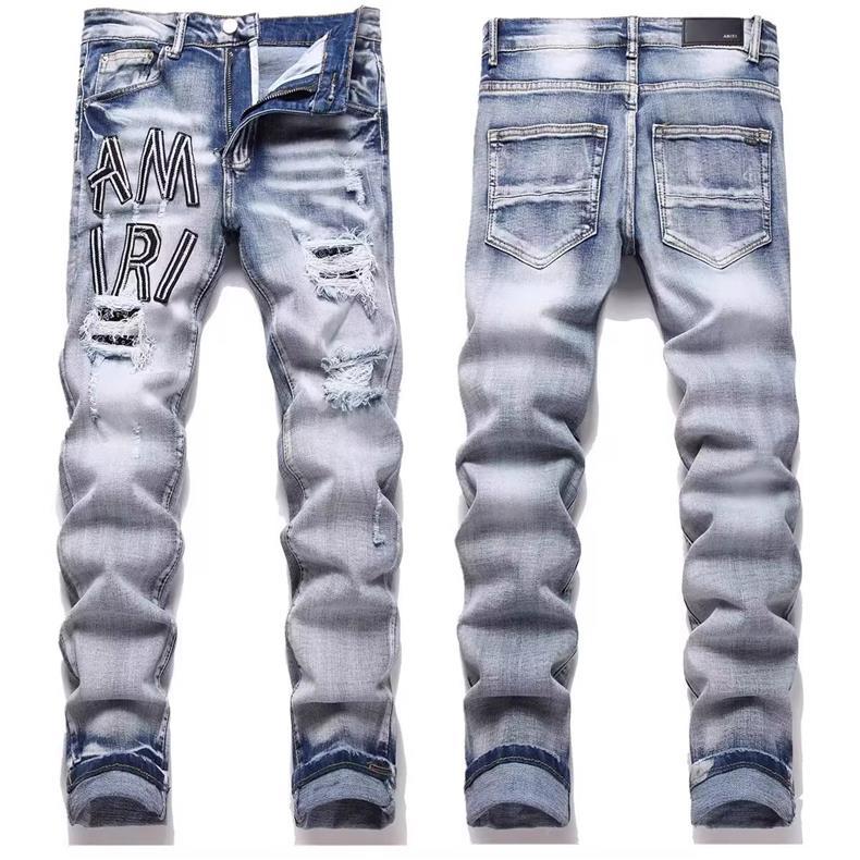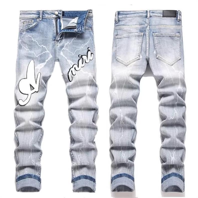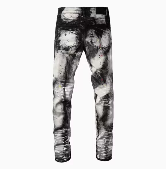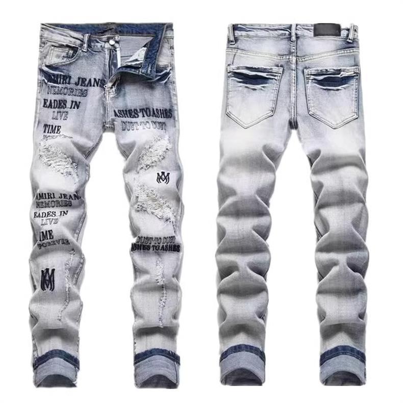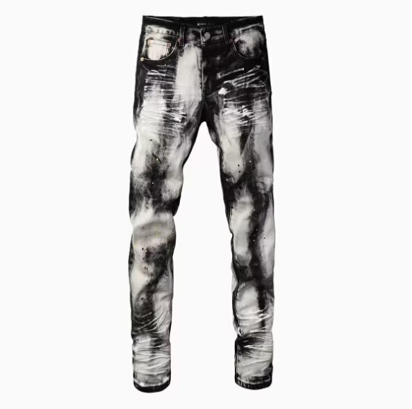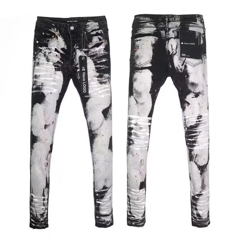 유럽과 미국의 트렌디 브랜드 가을 신작 남성용 블랙 그레이 스플래시 잉크 그래피티 찢어진 청바지 남성용 스트레치 슬림핏 바지스토어 가기