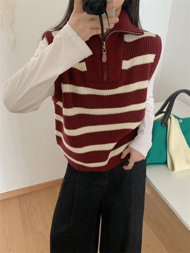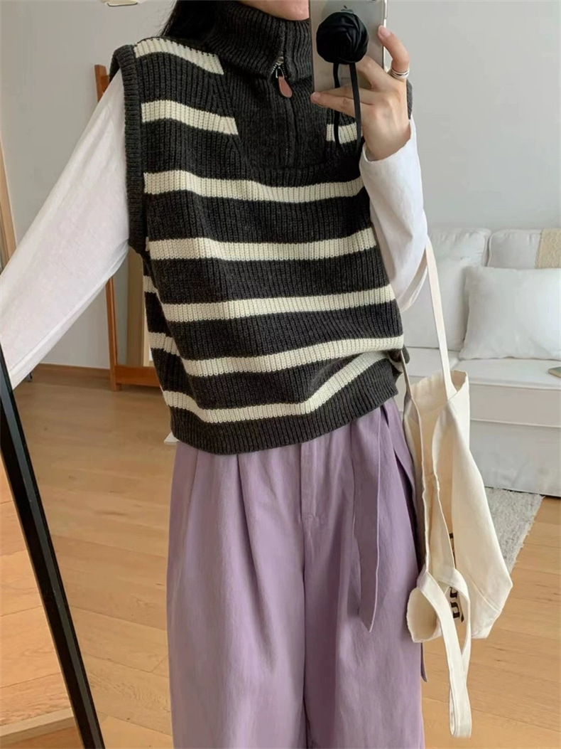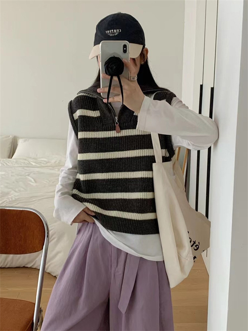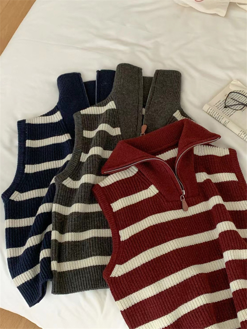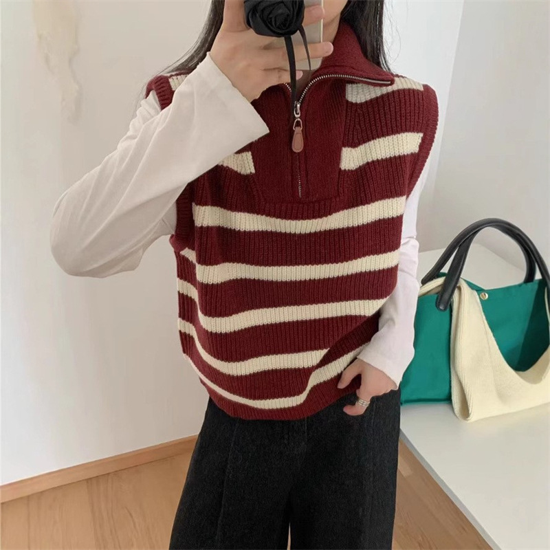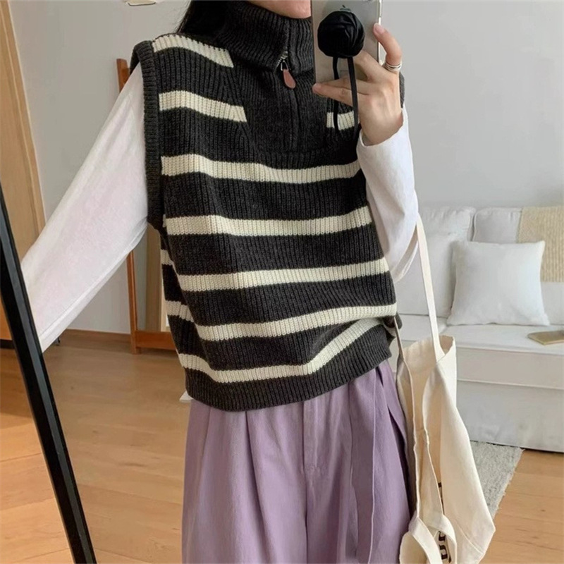 가을 새로운 스타일 레이어드 양복 조끼 니트 조끼 탑 대비 색 줄무늬 하프 지퍼 풀오버 민소매 스웨터 여성용스토어 가기