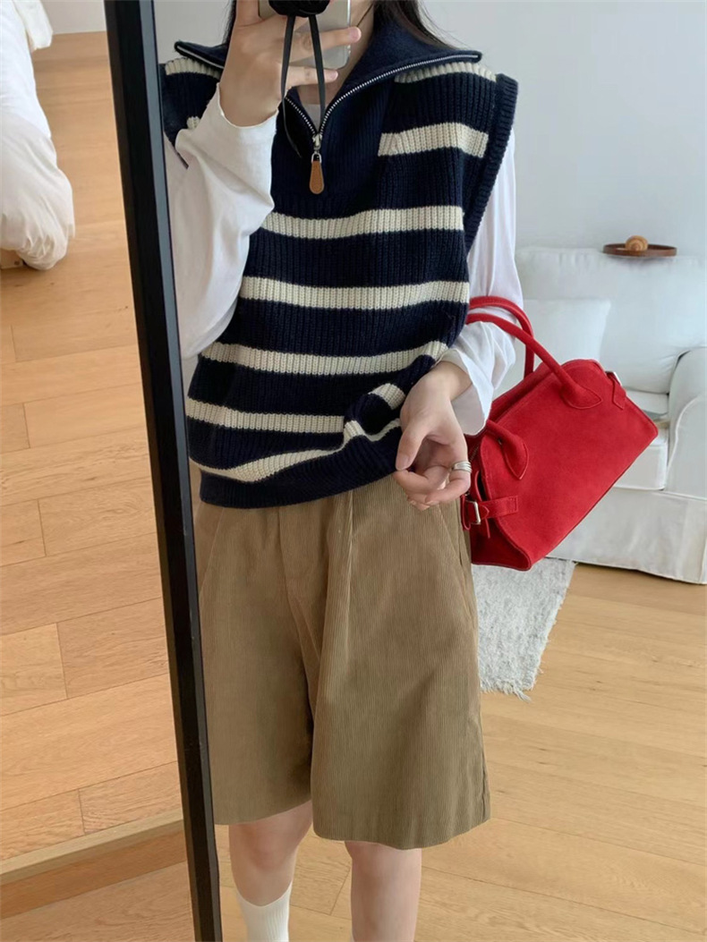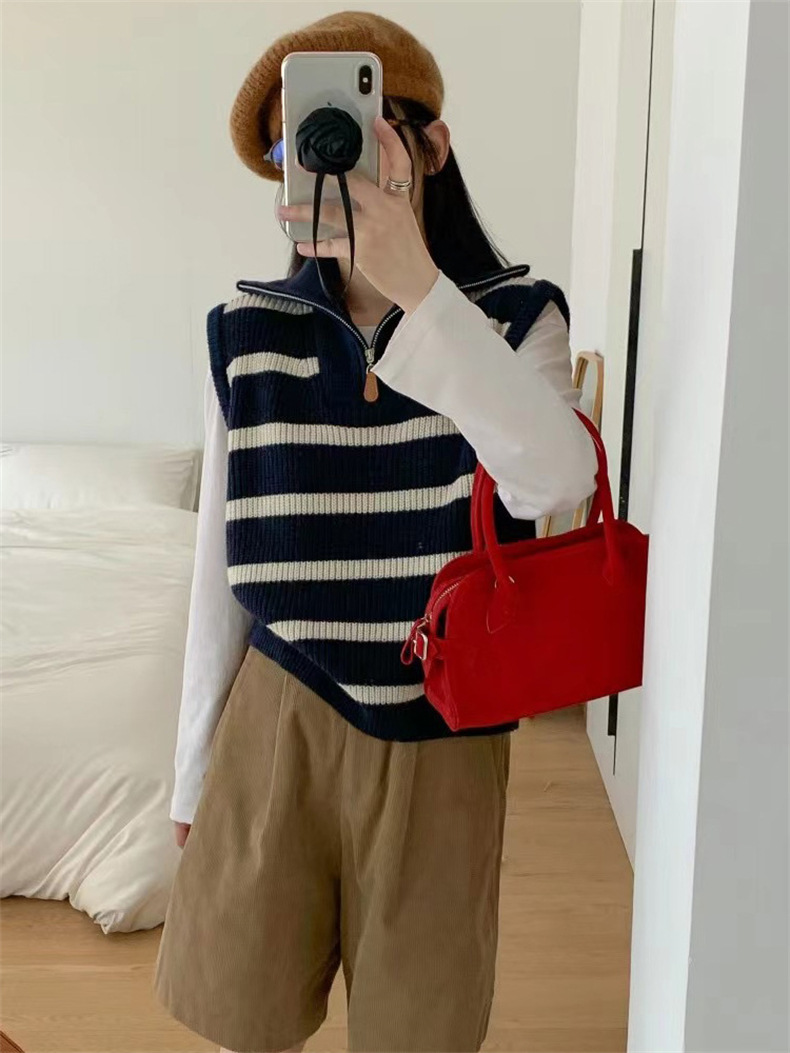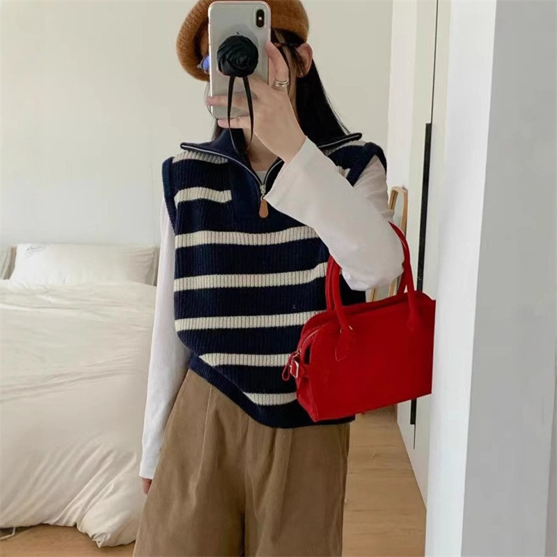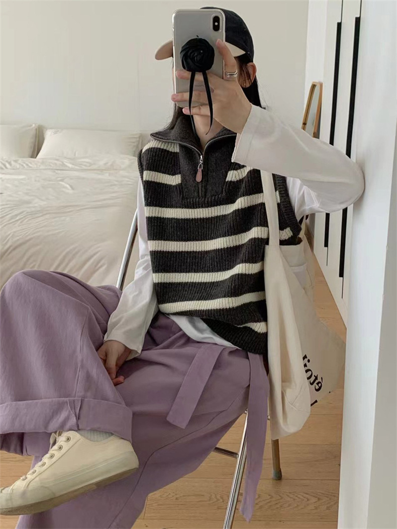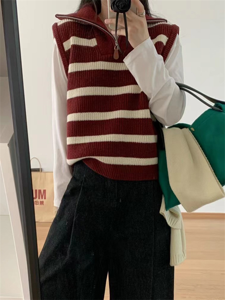 가을 새로운 스타일 레이어드 양복 조끼 니트 조끼 탑 대비 색 줄무늬 하프 지퍼 풀오버 민소매 스웨터 여성용스토어 가기