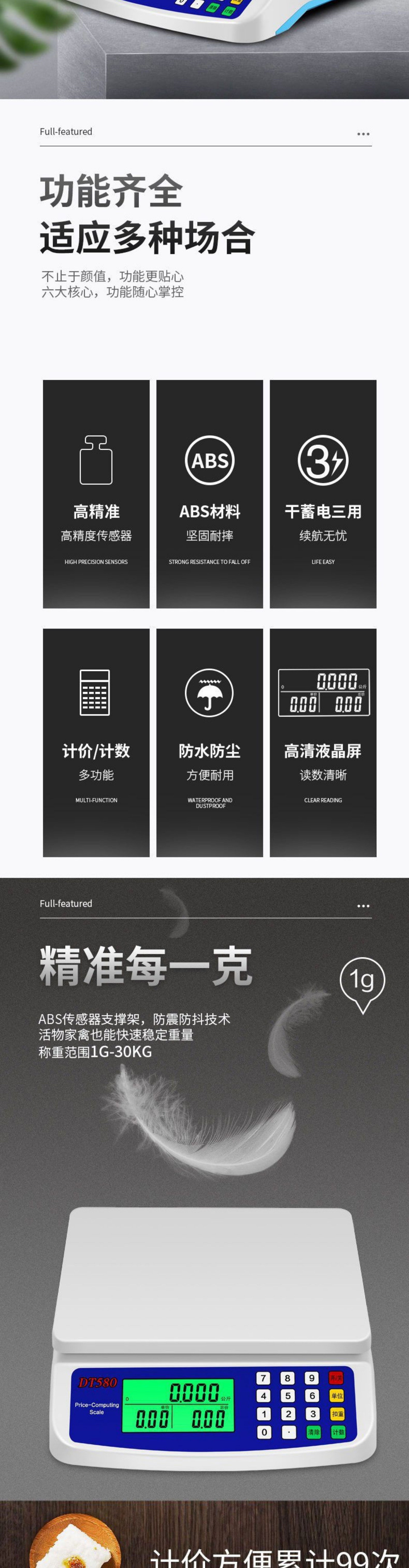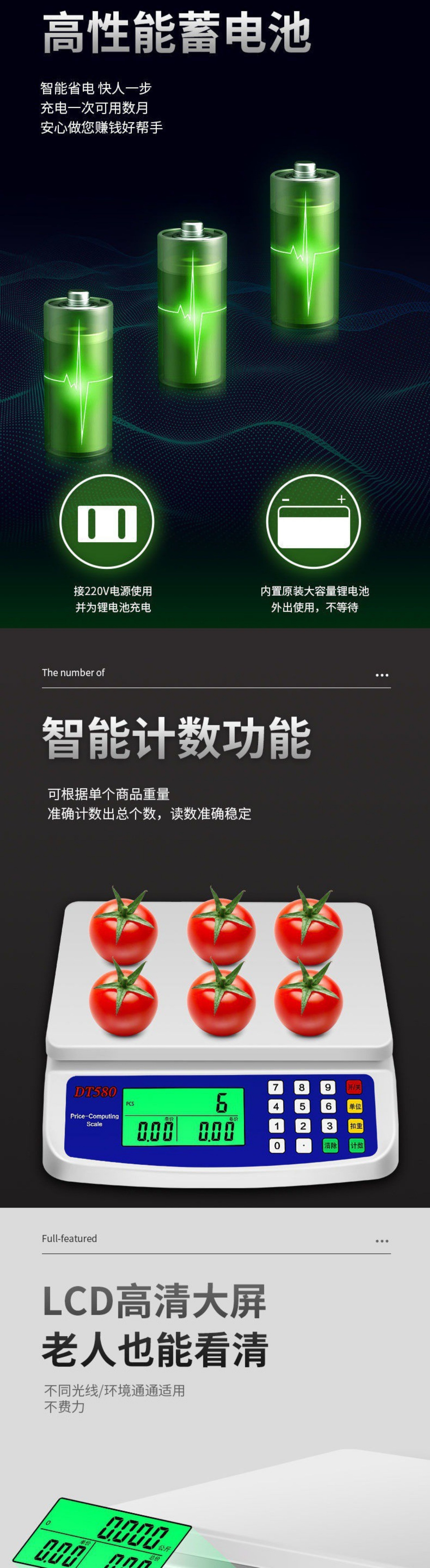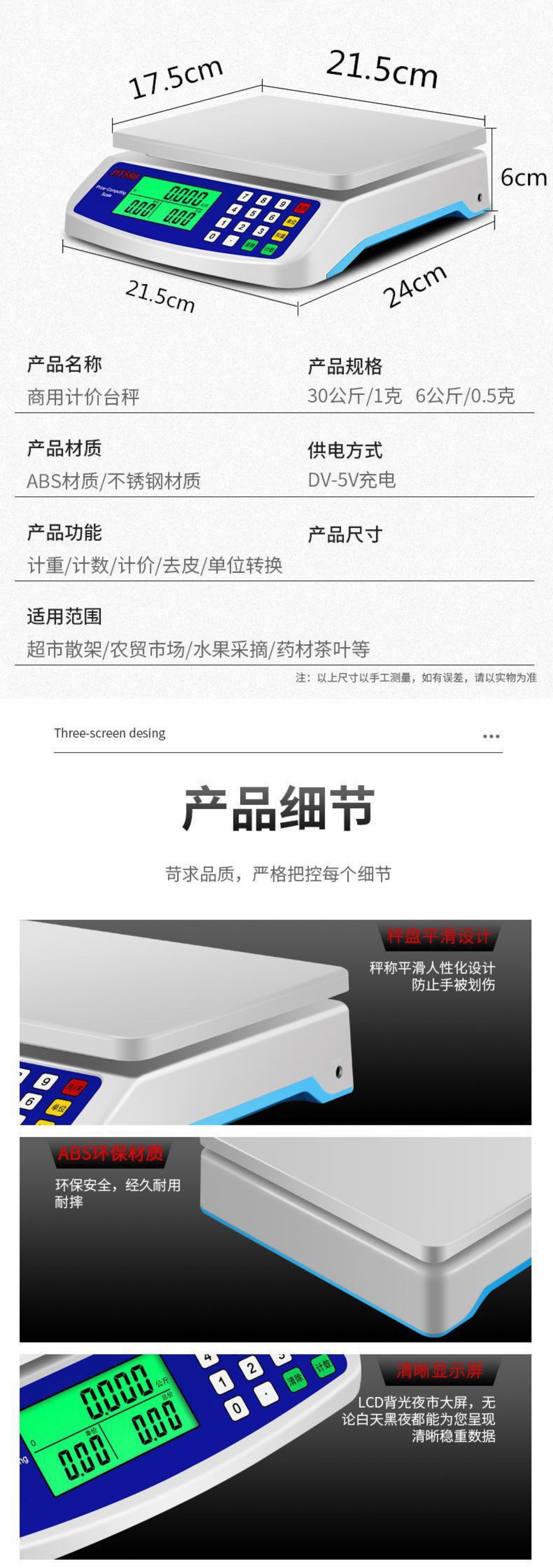 • 양면 디스플레이 가격 저울 [배터리 모델]에는 배터리가 포함되어 있으며 30kg/1g의 고정밀도를 측정할 수 있습니다.