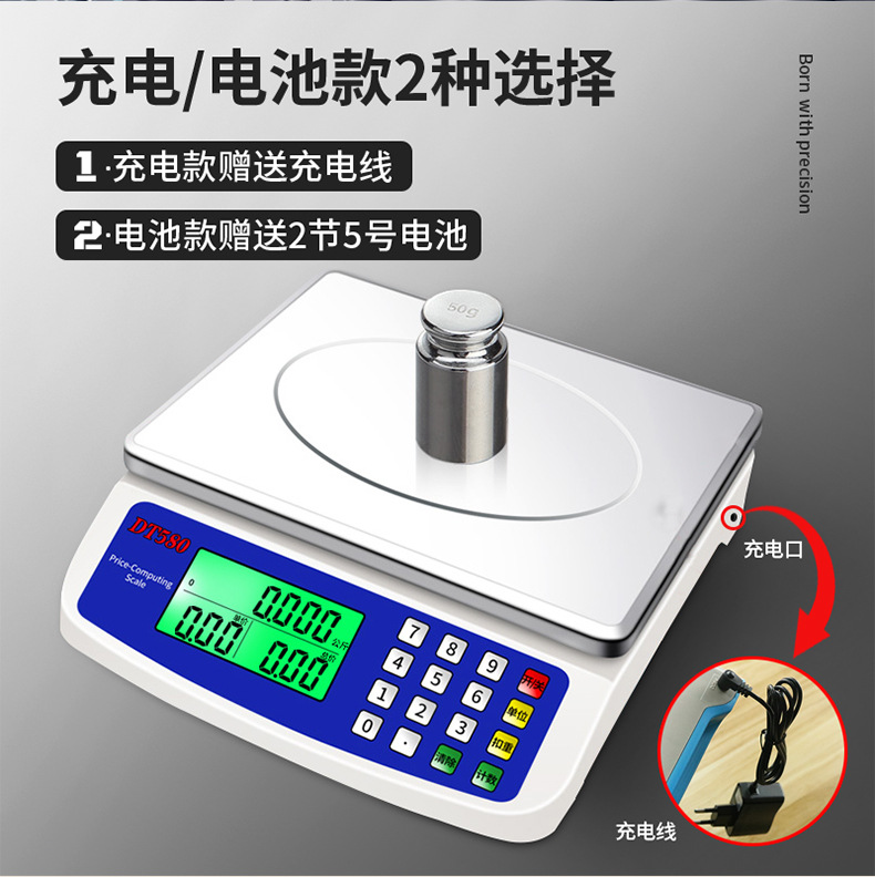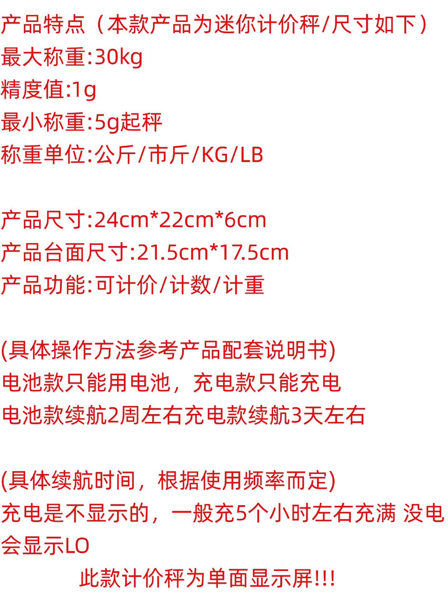 • 강판이 포함된 가격 저울 [충전 모델]에는 충전기가 포함되어 있으며 30kg/1g의 고정밀도를 측정할 수 있습니다.