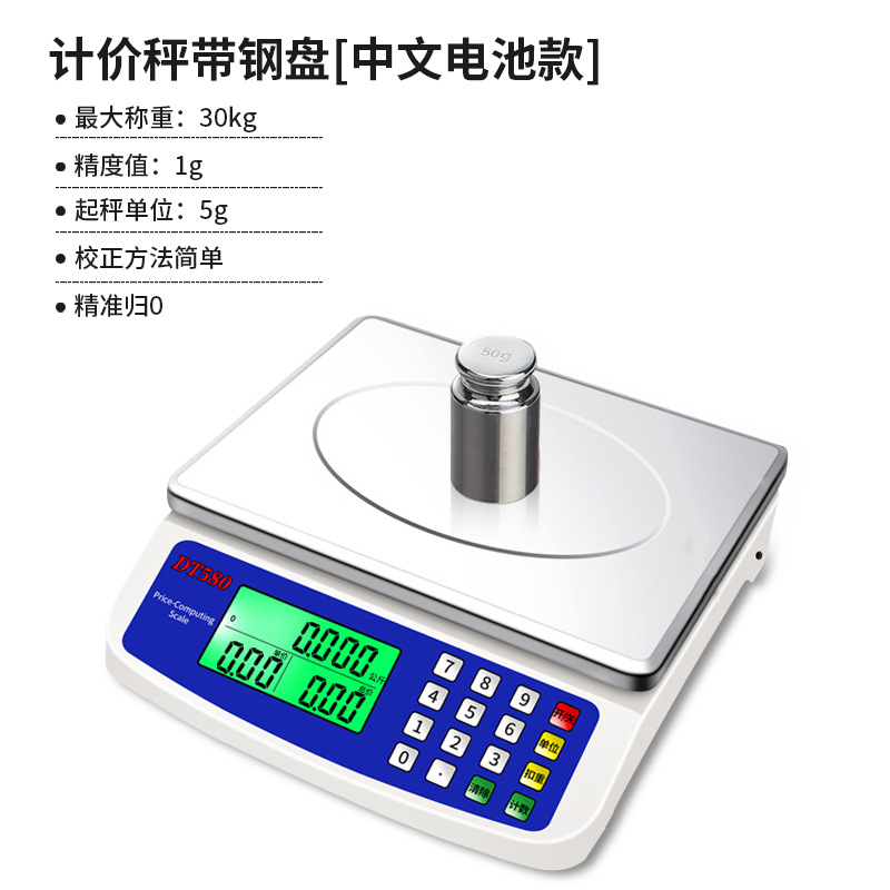 • 강판이 있는 가격 저울 [배터리 모델]에는 배터리가 포함되어 있으며 30kg/1g의 고정밀도를 측정할 수 있습니다.