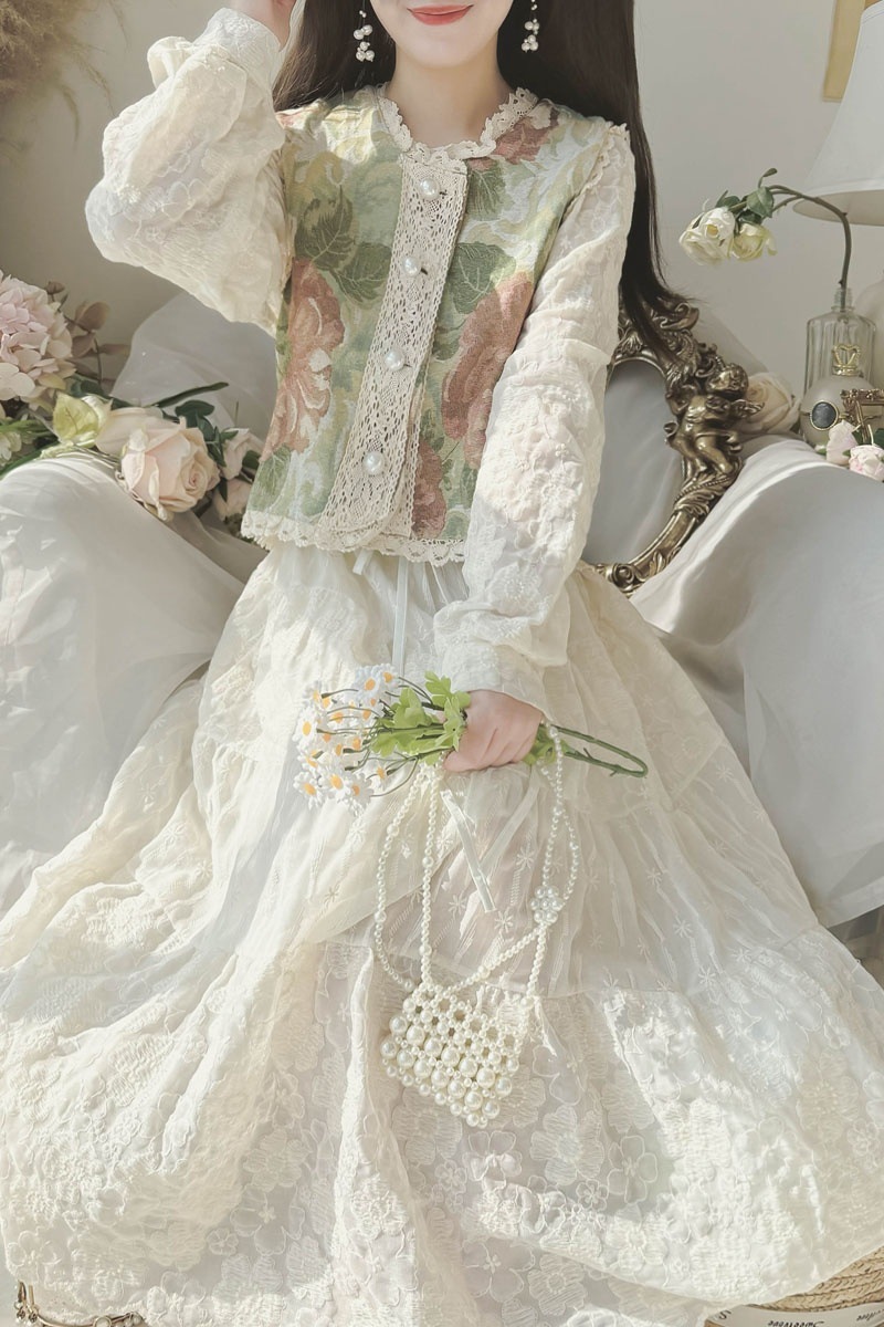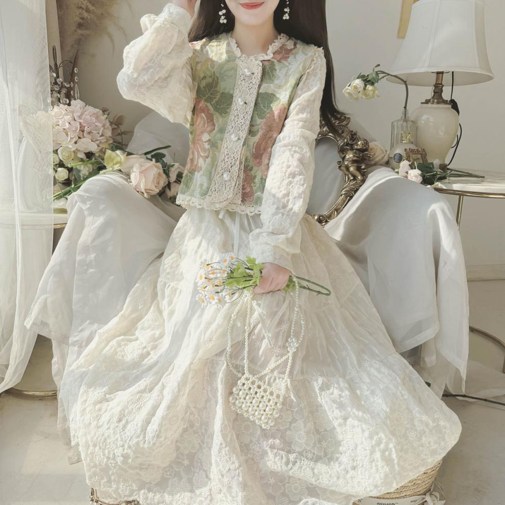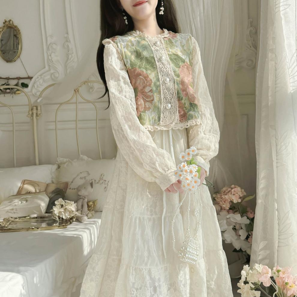 Runaway Princess Sweet Super Fairy 레이스 자수 흰색 느슨한 소녀 드레스 꽃 조끼 투피스 슈트