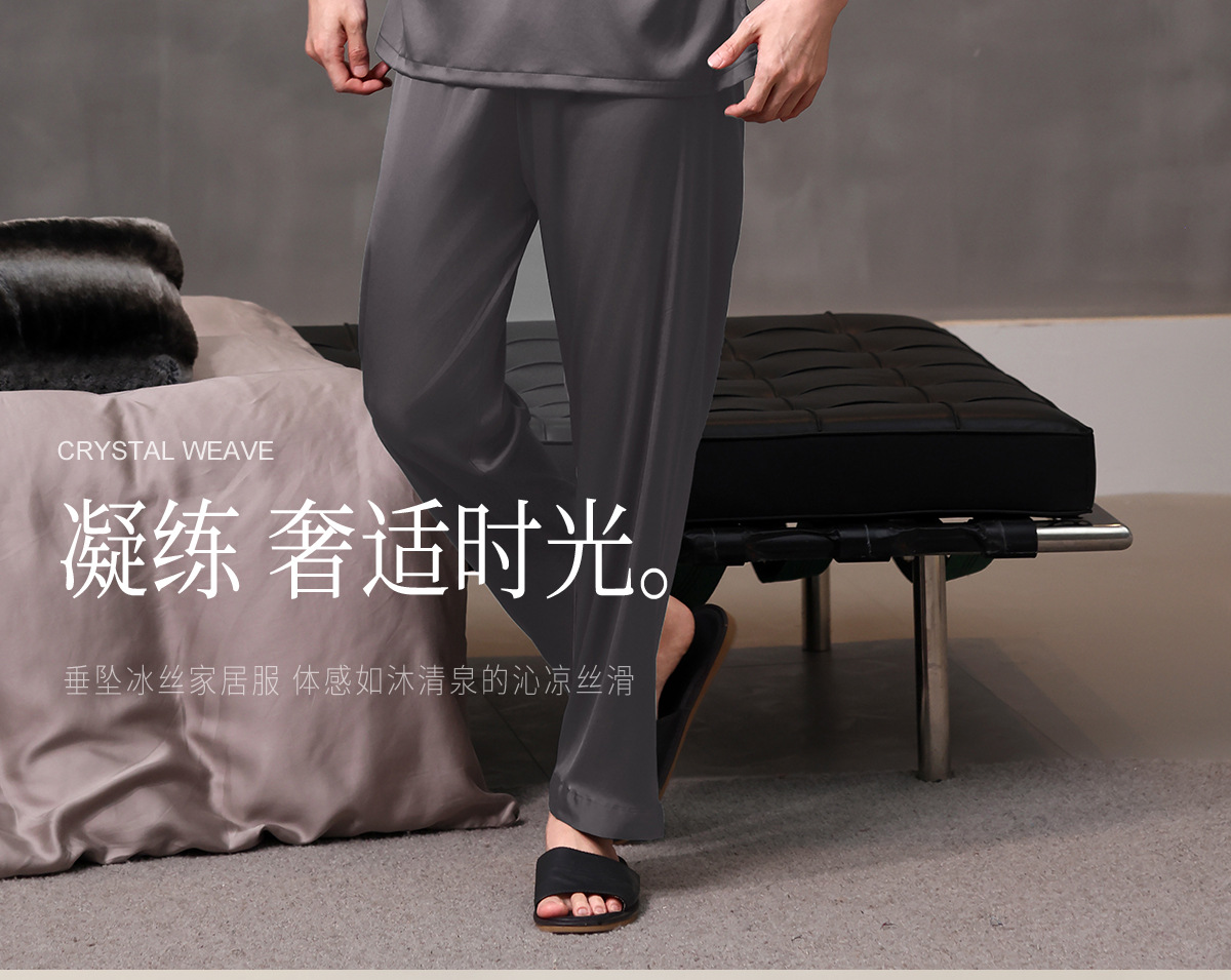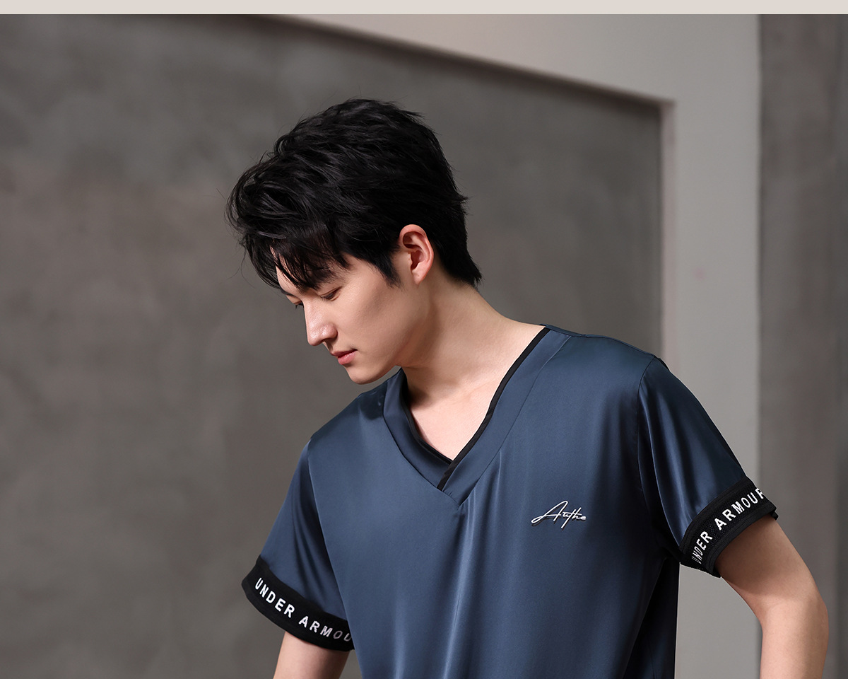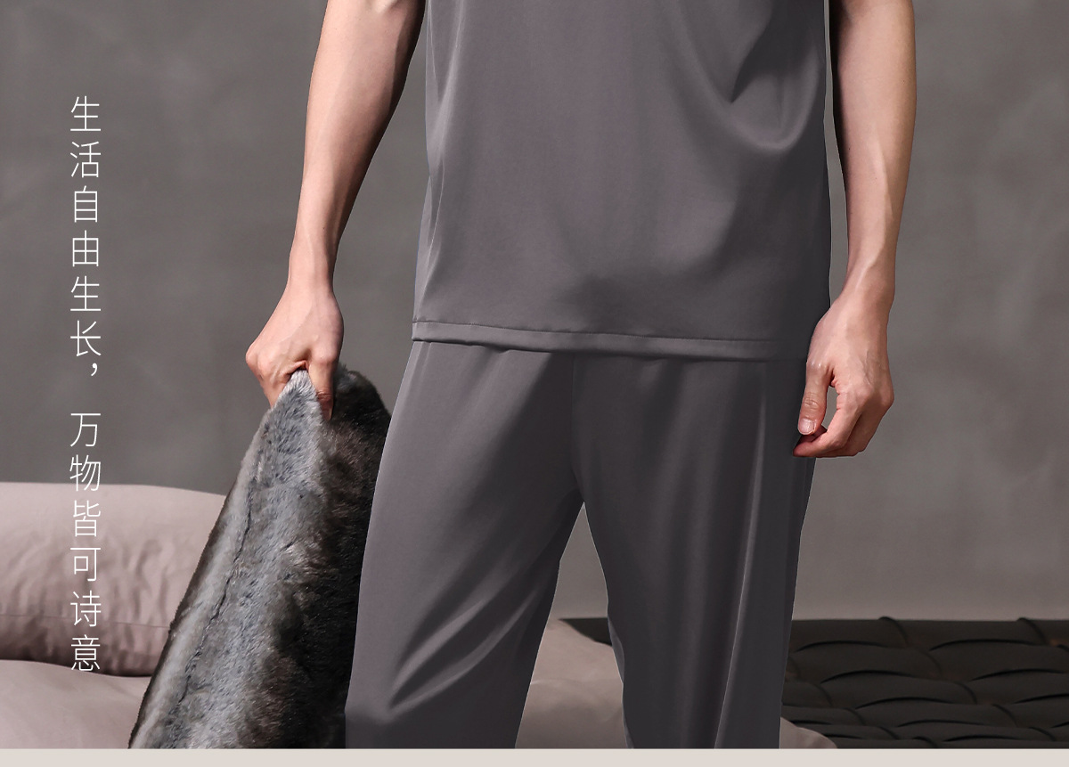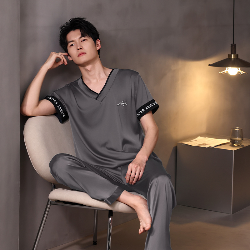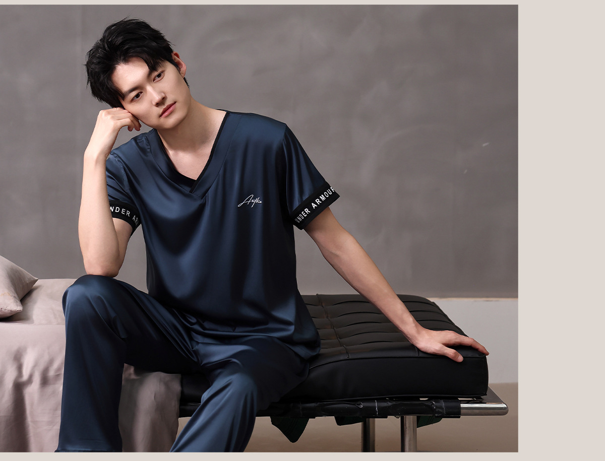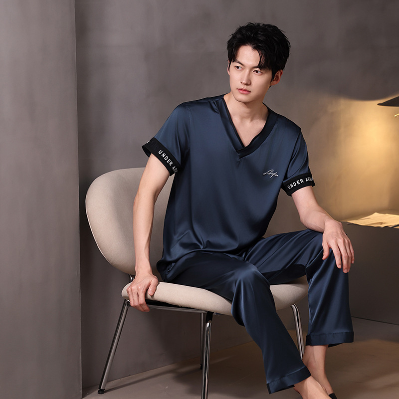 [얼음과 눈의 실크] 남성용 신작 잠옷 여름 반팔 모조 실크 하이 엔드 가을 홈웨어 투피스 세트