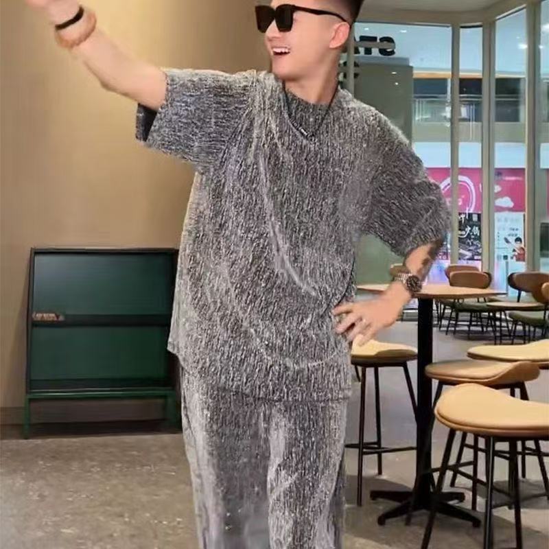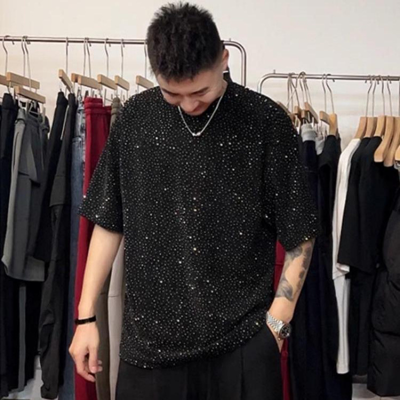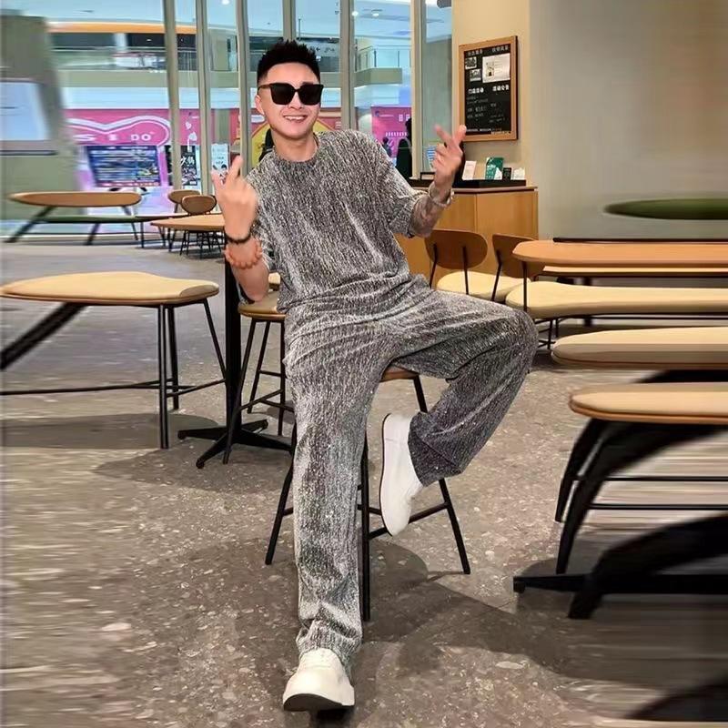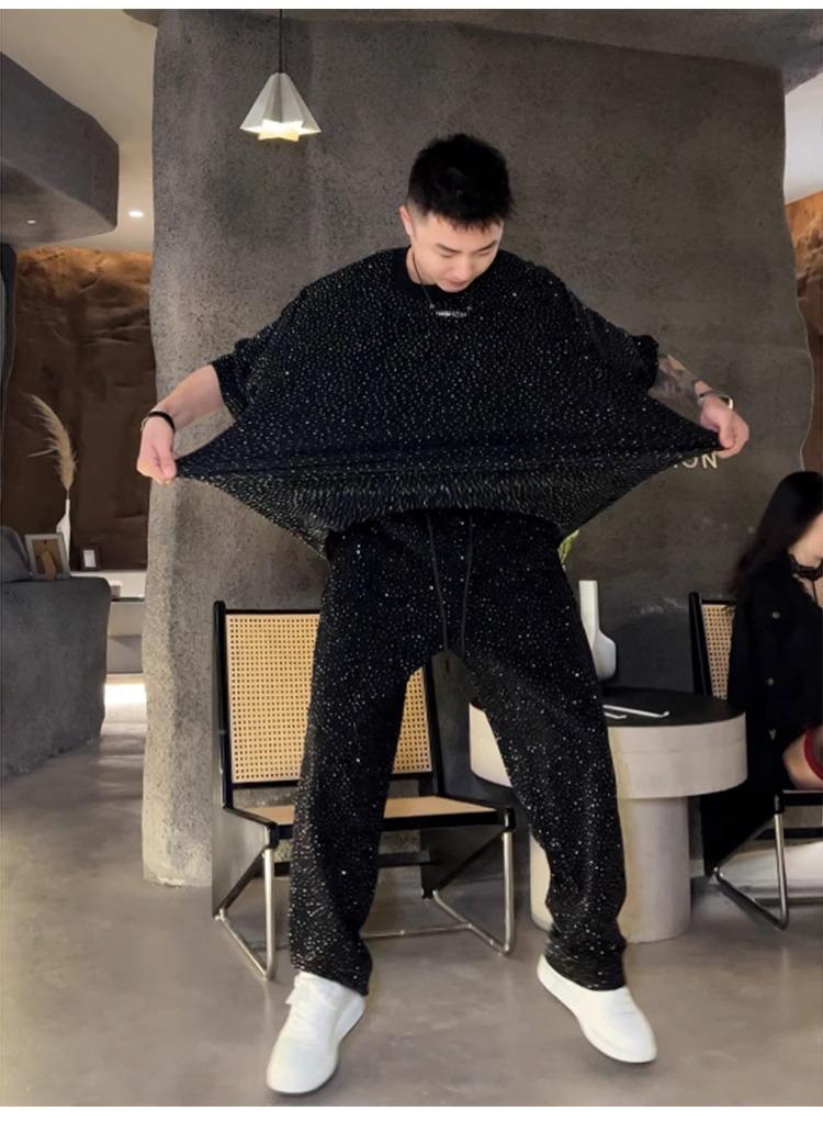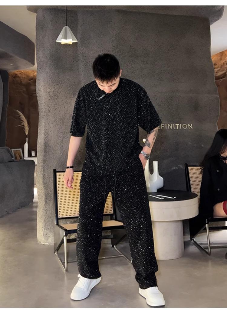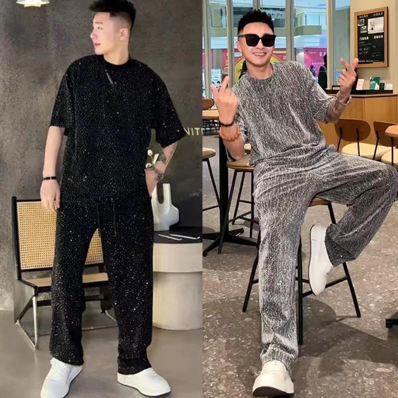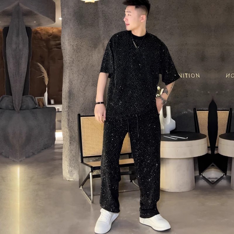 여름 신작 남성용 라이트 럭셔리 안개꽃 핫 다이아몬드 슈트 인터넷 연예인 트렌드 루즈하고 통기성이 좋은 5부 소매 반바지 투피스 세트