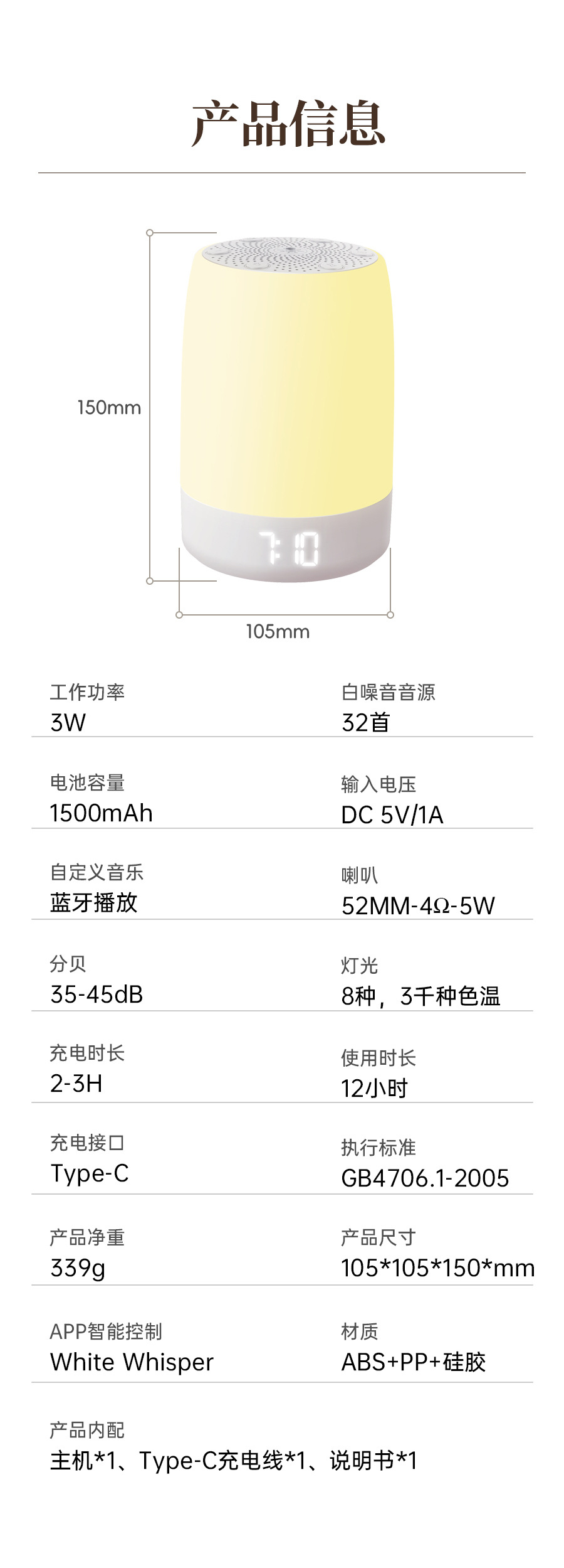 产品内配:白噪音主机*1、Type-C充电线80cm*1、说明书*1、合格证*1