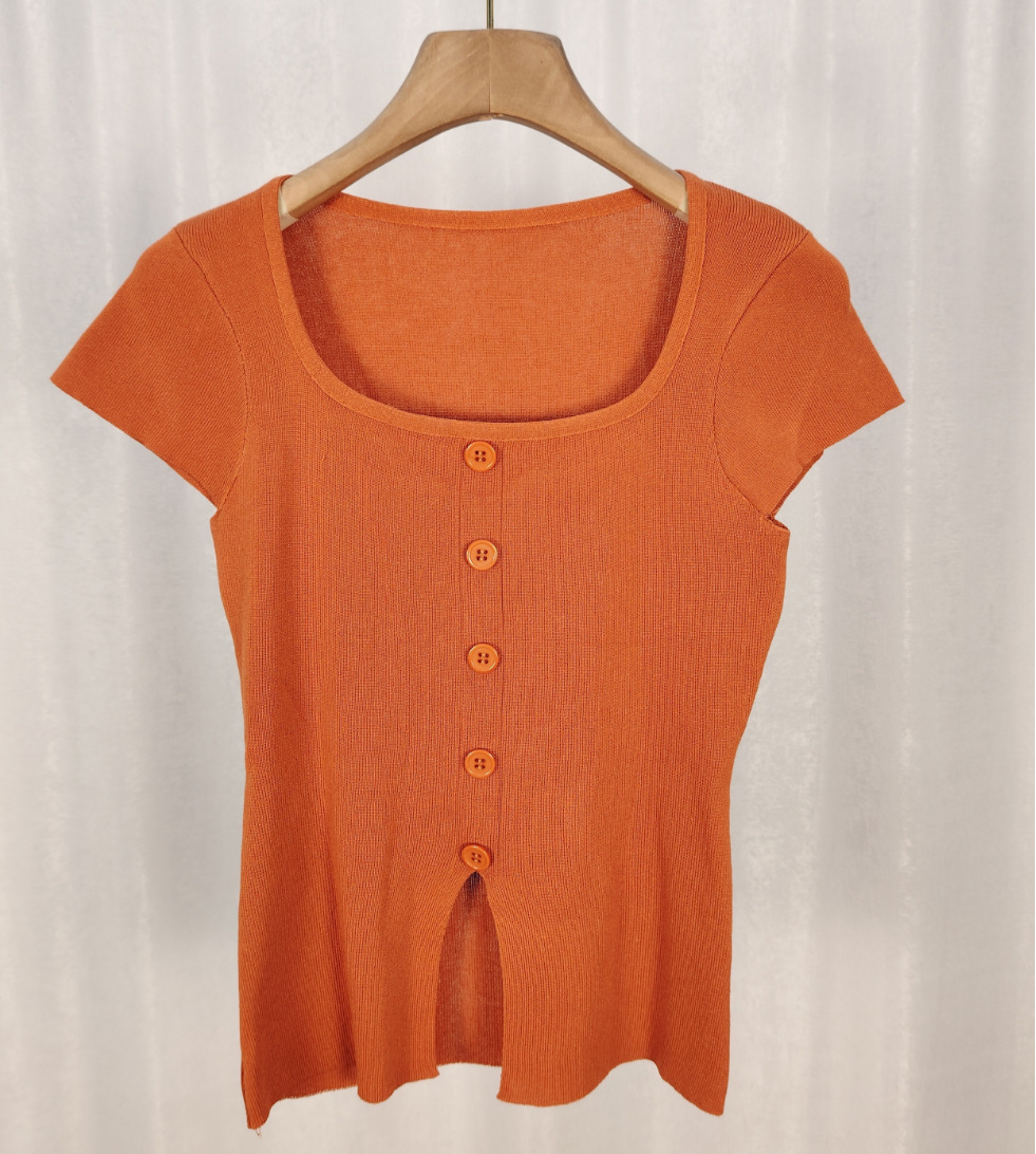 2025년 신상 여름 패션 슬림하고 활용도가 높은 탑, 외국 스타일의 어깨 스퀘어 칼라 싱글 브레스트 풀오버 여성용 반팔 스웨터스토어 가기