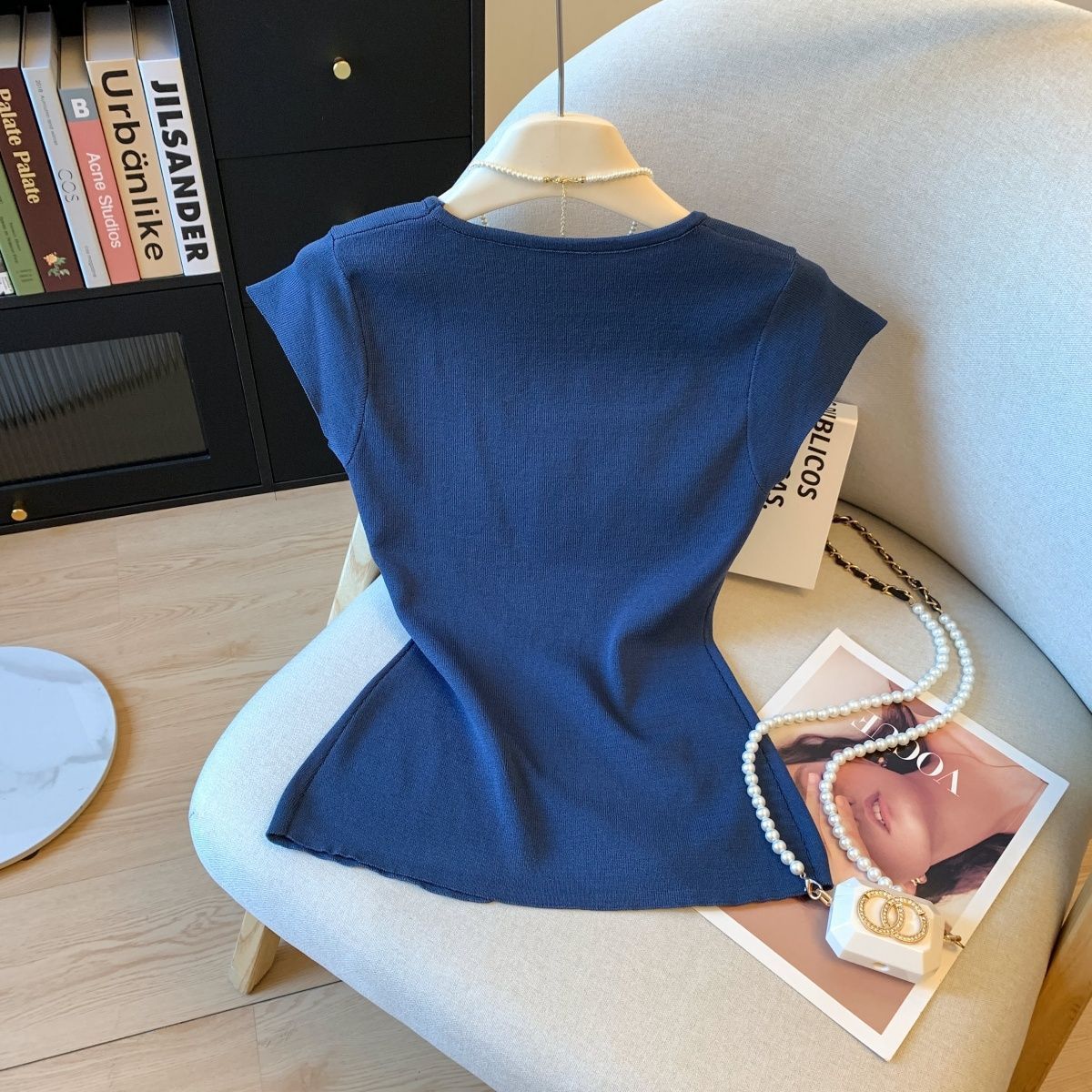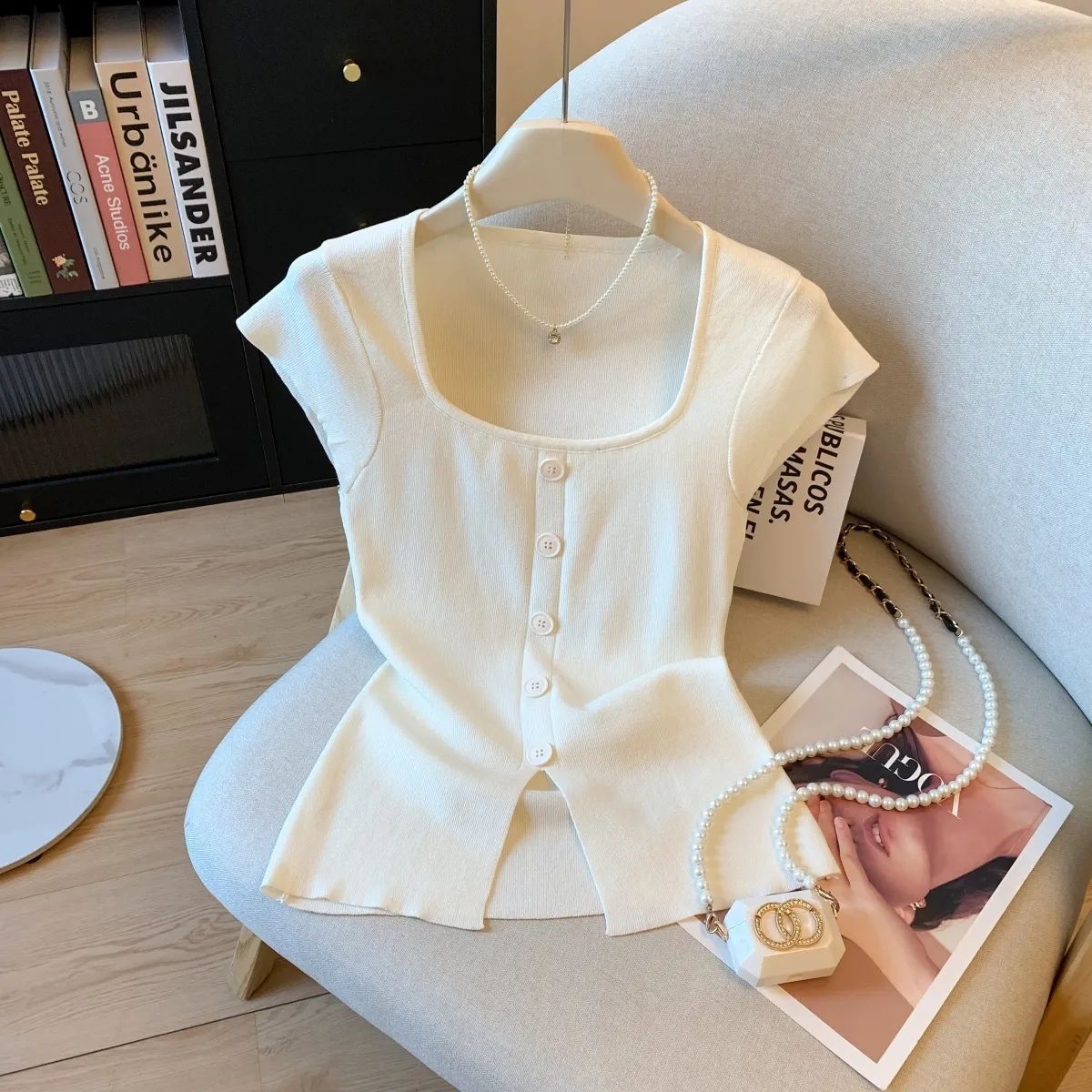 2025년 신상 여름 패션 슬림하고 활용도가 높은 탑, 외국 스타일의 어깨 스퀘어 칼라 싱글 브레스트 풀오버 여성용 반팔 스웨터