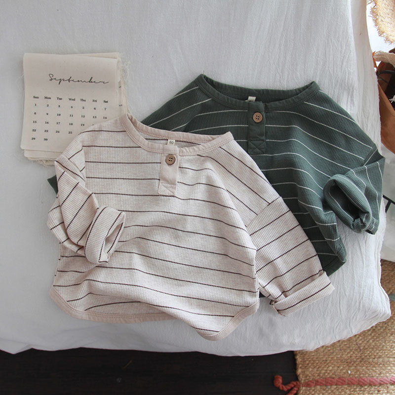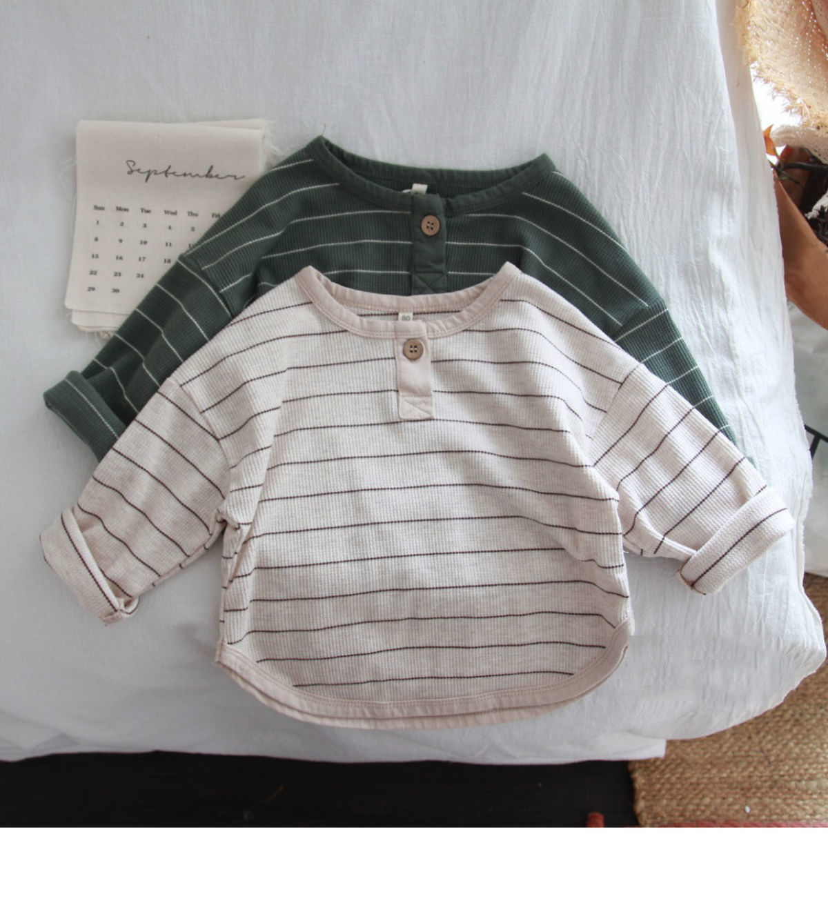 새로운 소년 복고풍 문학 스타일 한국 스타일 어린이 줄무늬 티셔츠 서양식 라운드 넥 베이비 바닥 셔츠 봄 새로운 T스토어 가기