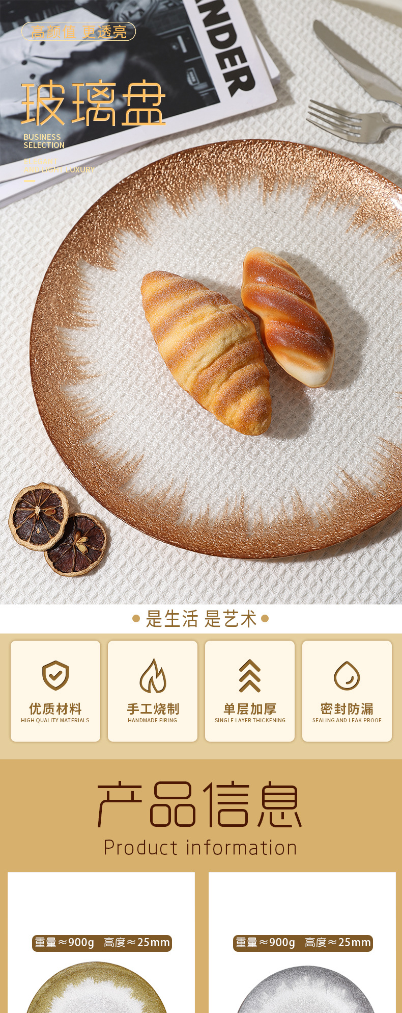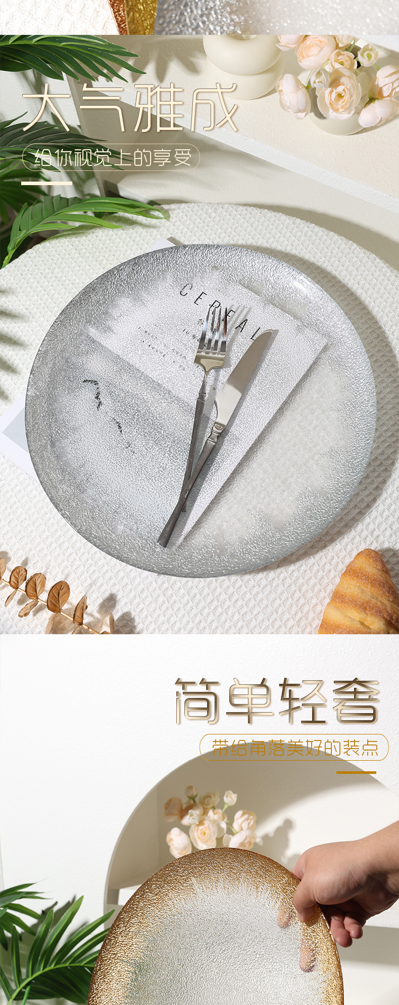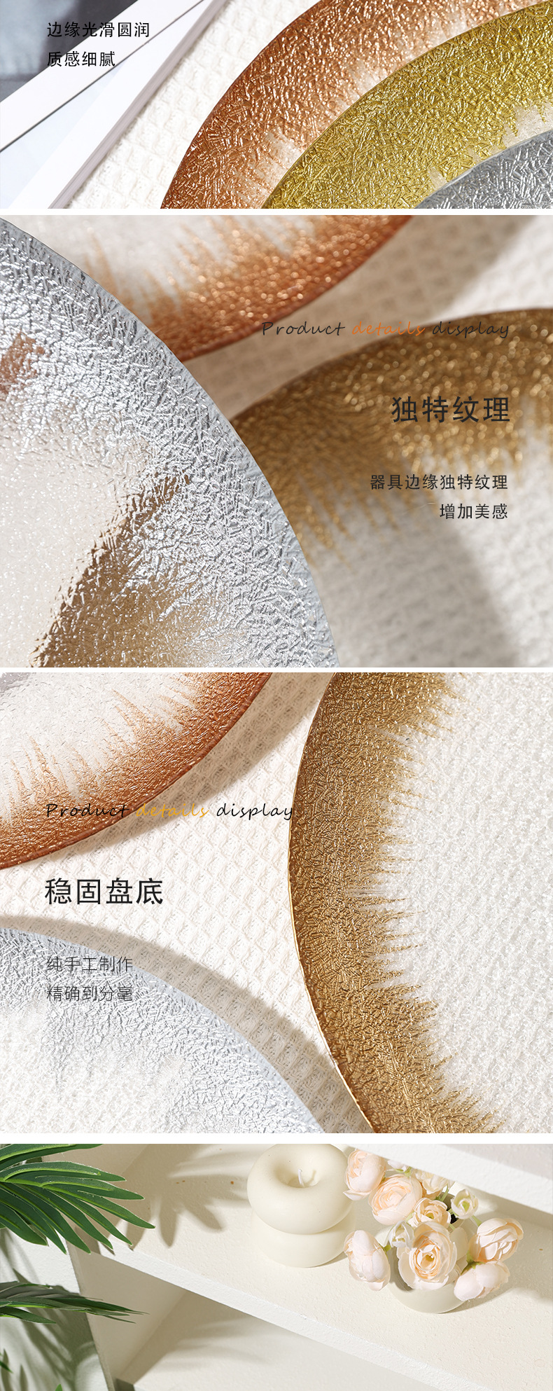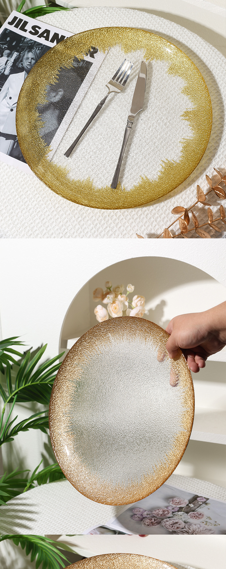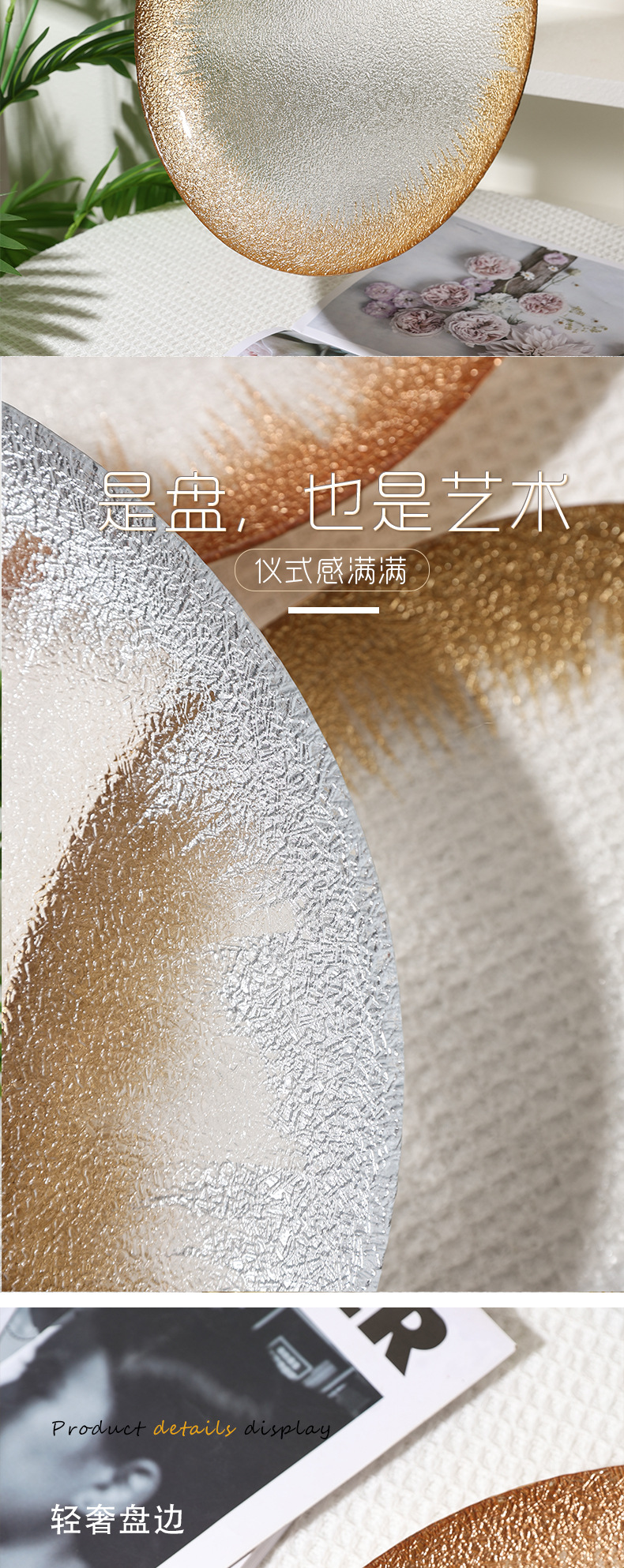 유럽 과일 접시, 가정용 크리스탈 유리 접시, 호텔 스테이크 접시, 금박 유리 접시, 금박 가죽 패턴 디너 접시스토어 가기