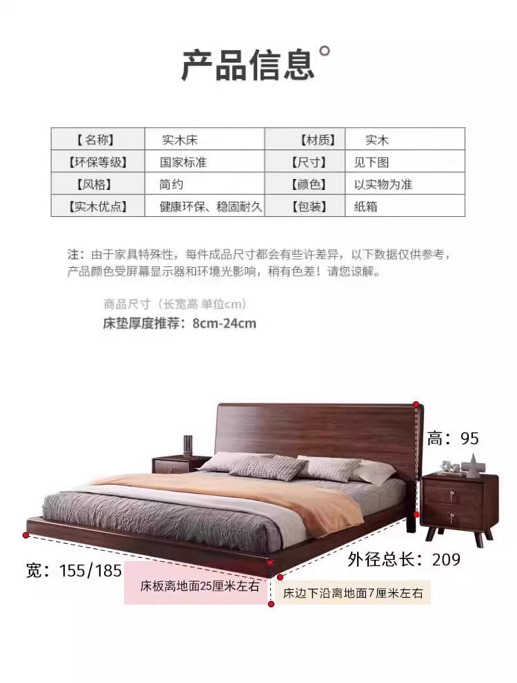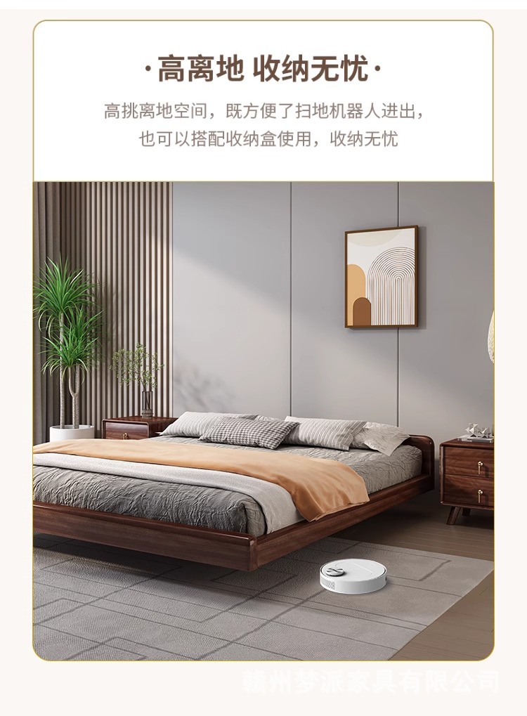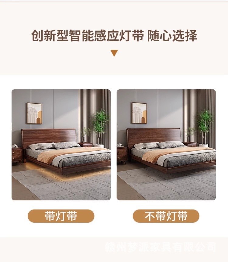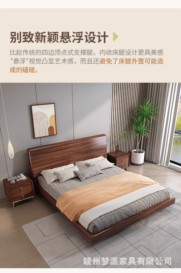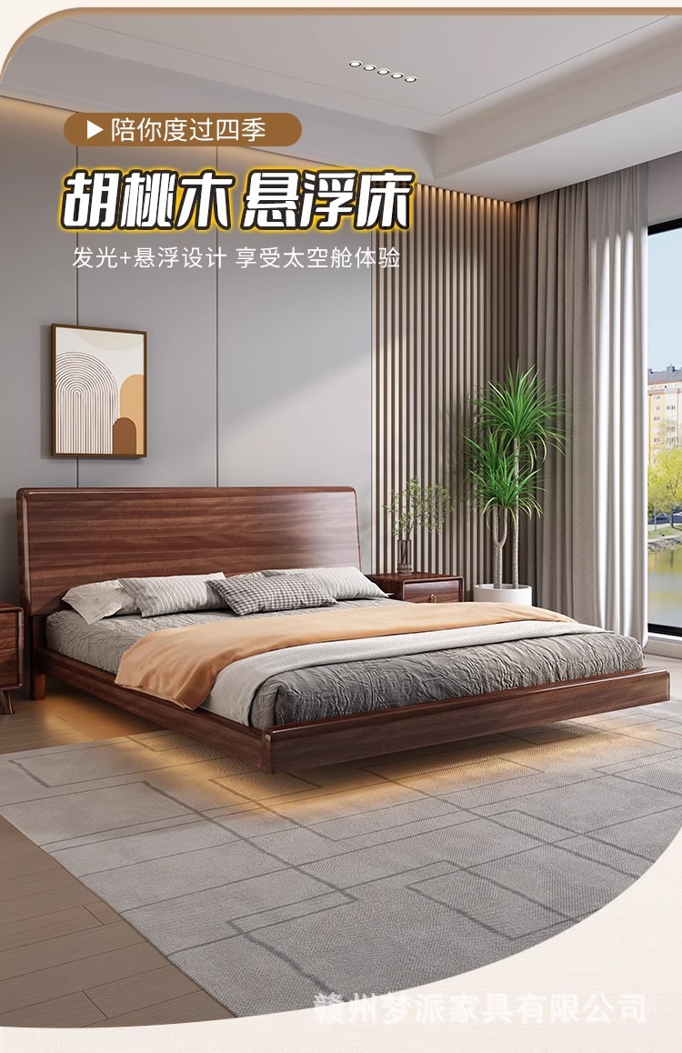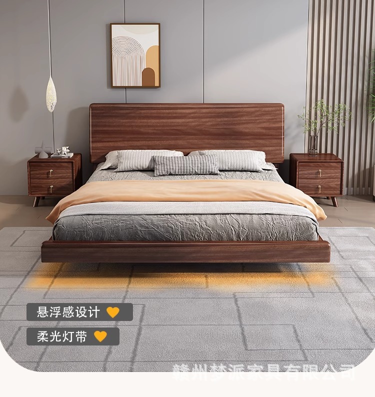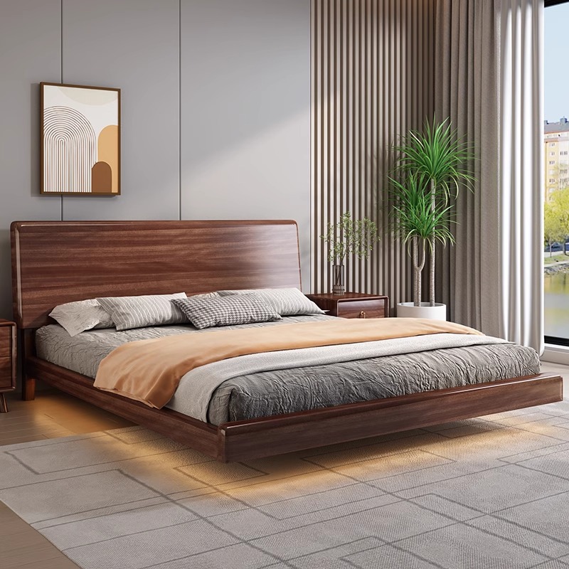 북유럽 단단한 나무 침대 다다미 마스터 침실 하이 엔드 호두 나무 서스펜션 침대 현대 간단한 1.8m 더블 침대 램프스토어 가기