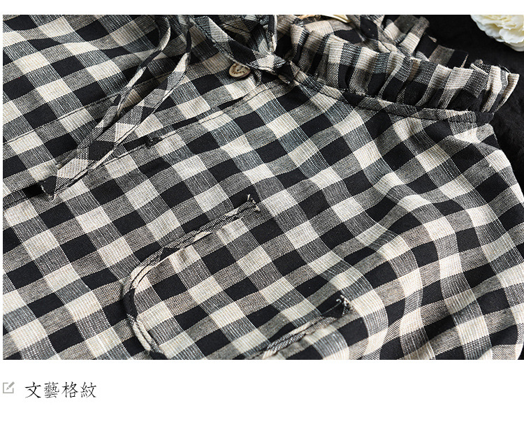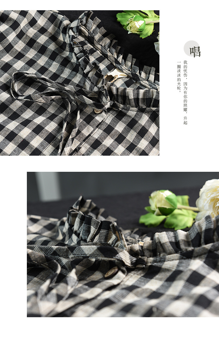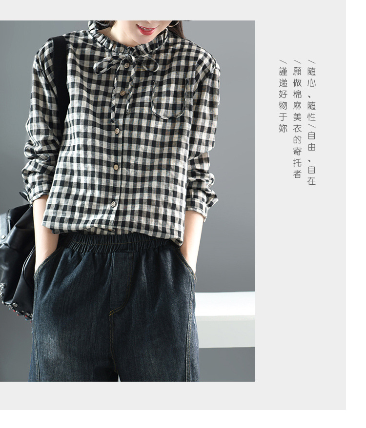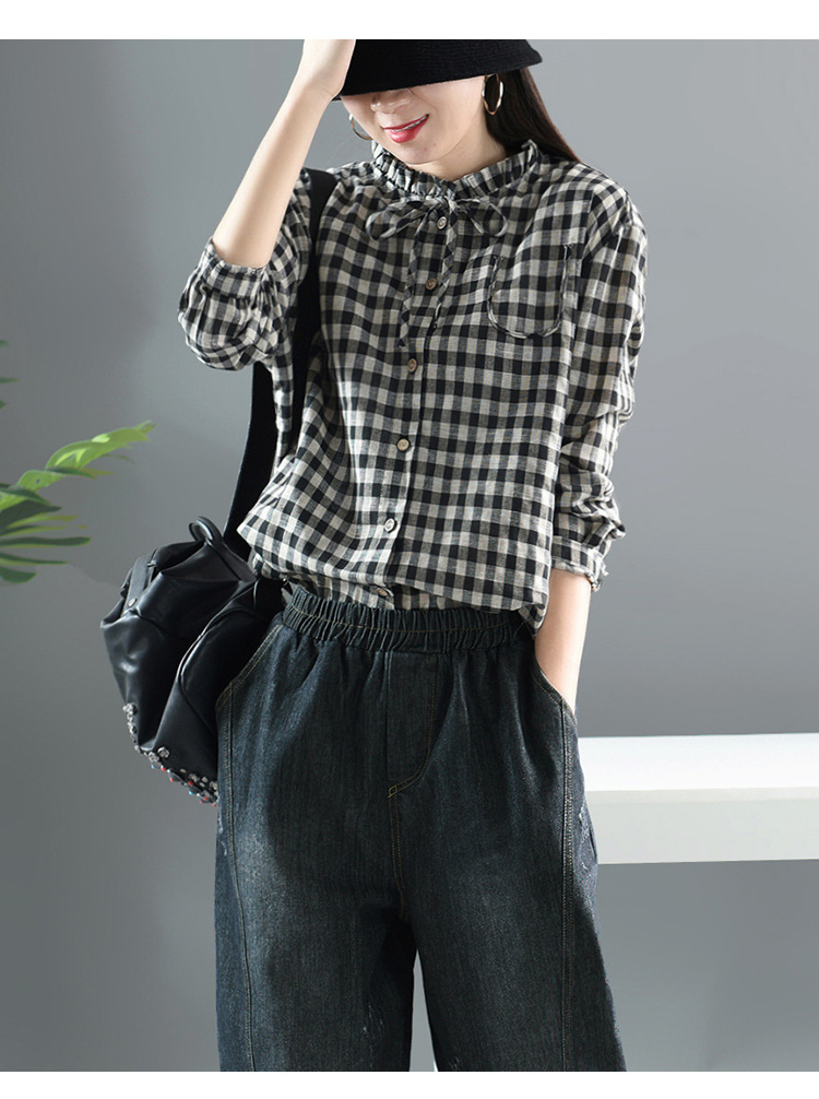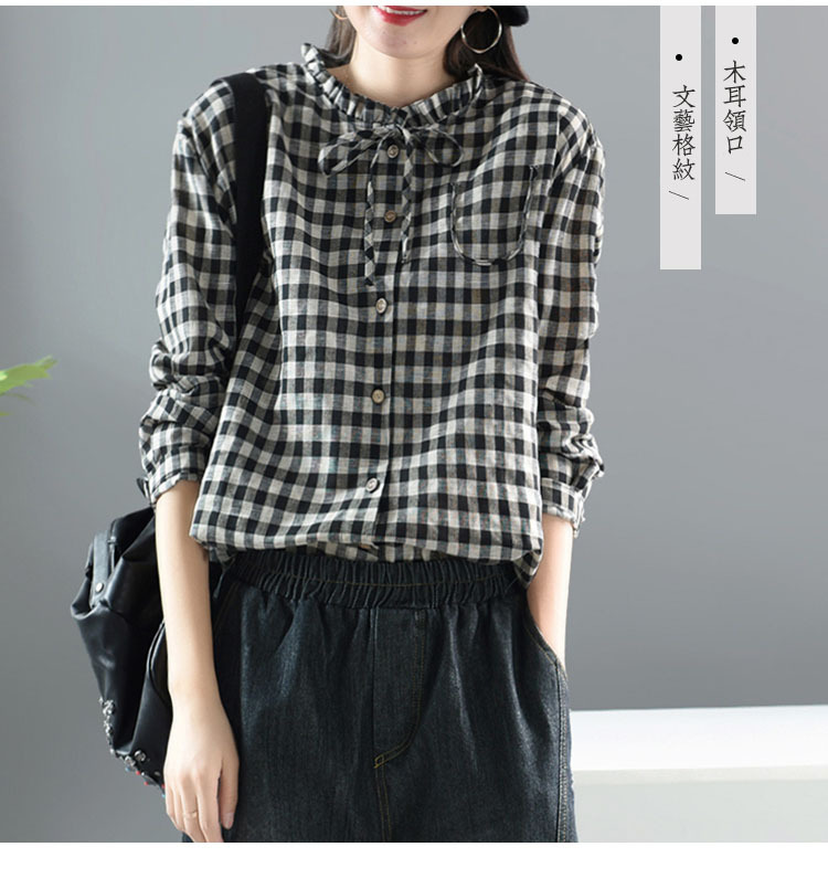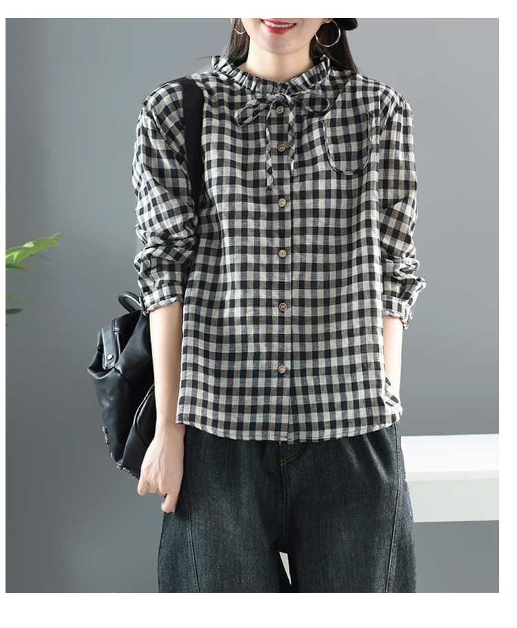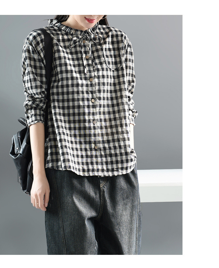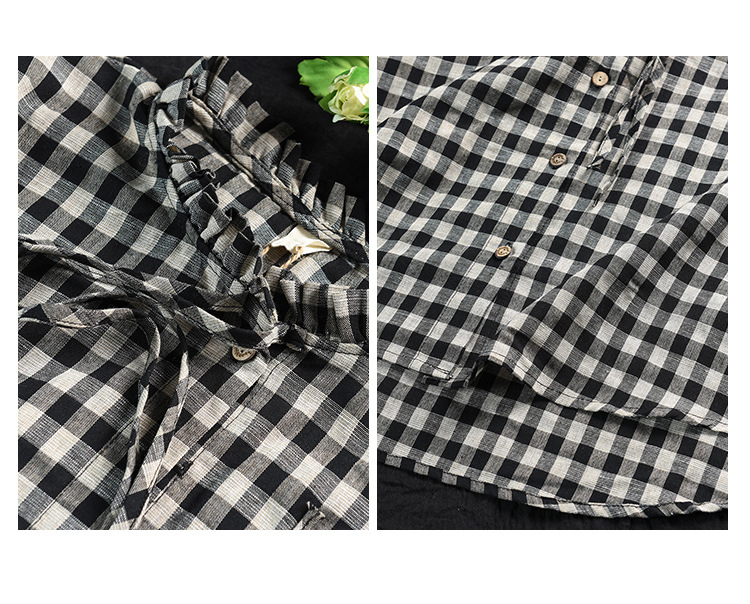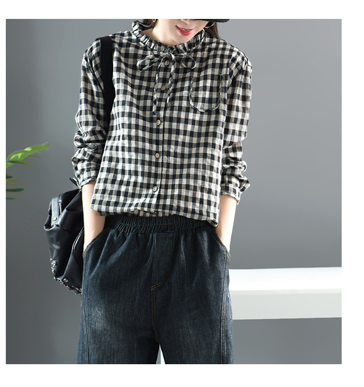 봄과 가을 한국 스타일 버진 우드 칼라 레이스 업 코튼 린넨 탑 예술적 격자 무늬 긴팔 셔츠 캐주얼 셔츠 트렌디스토어 가기
