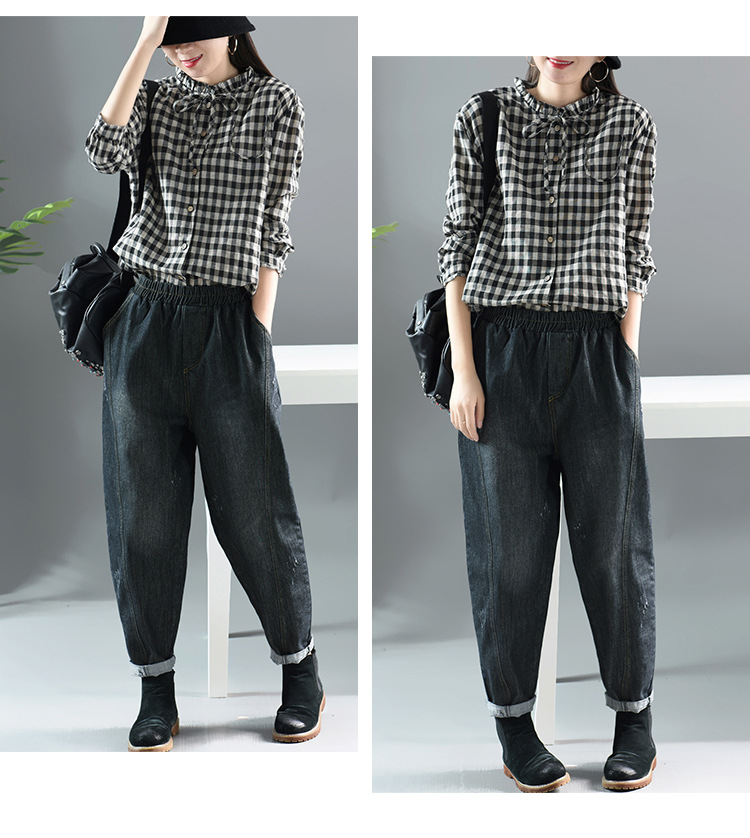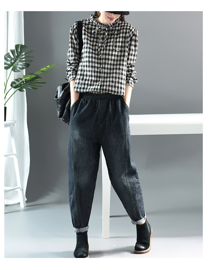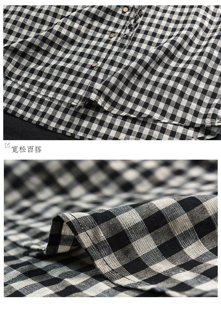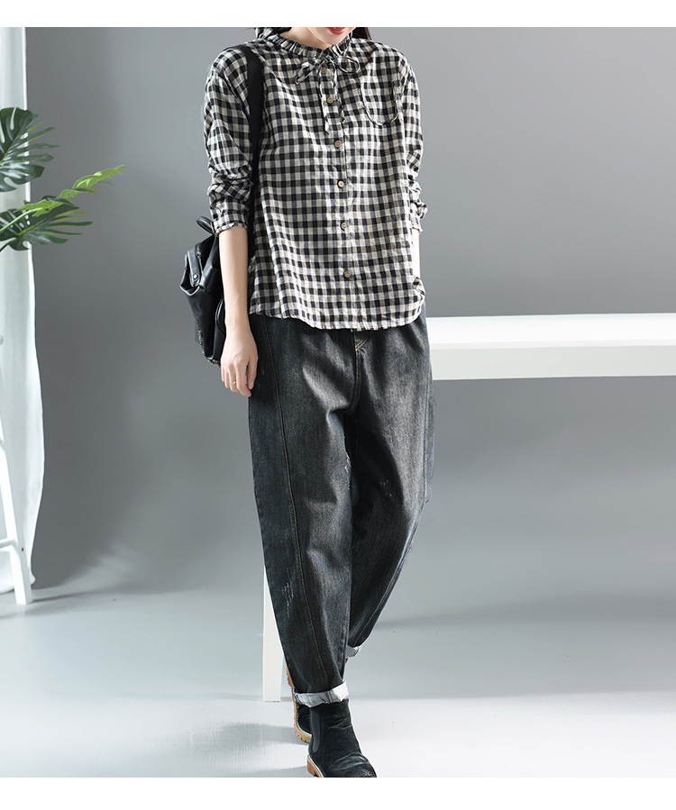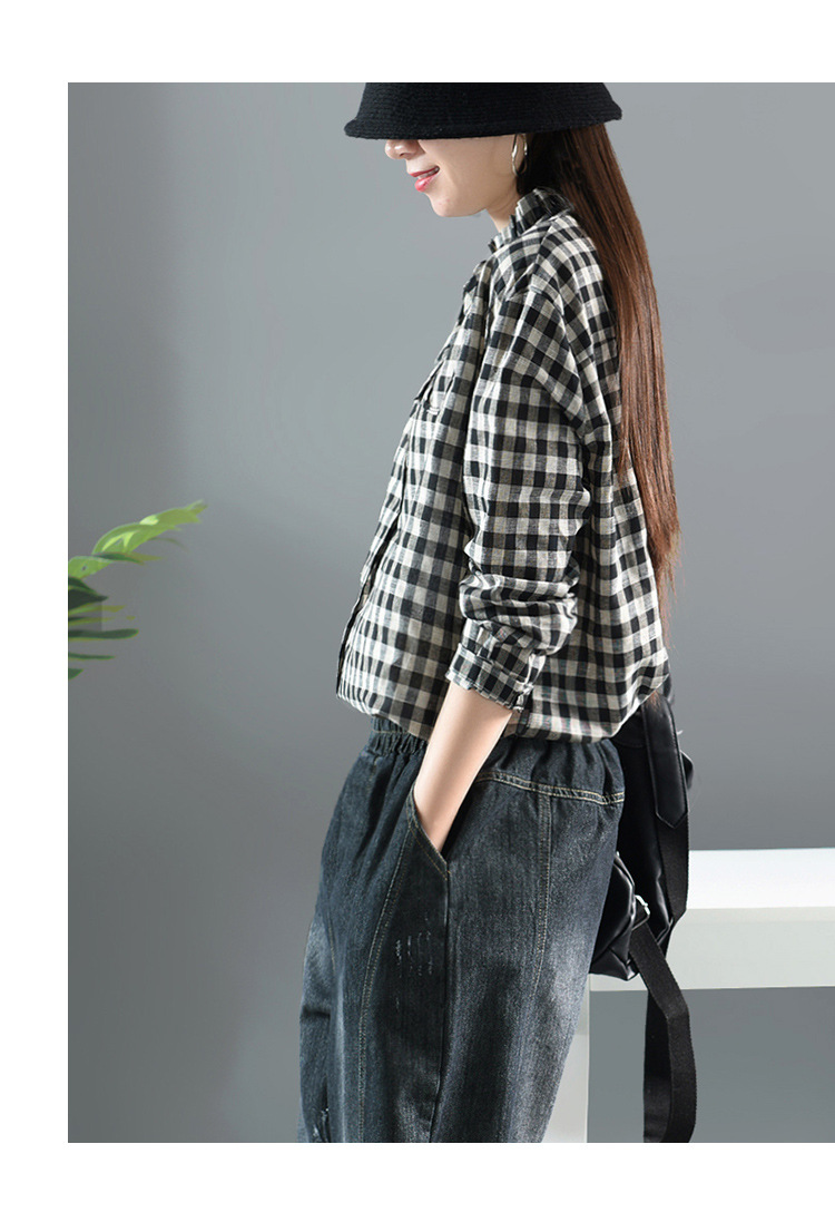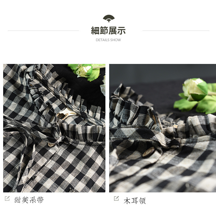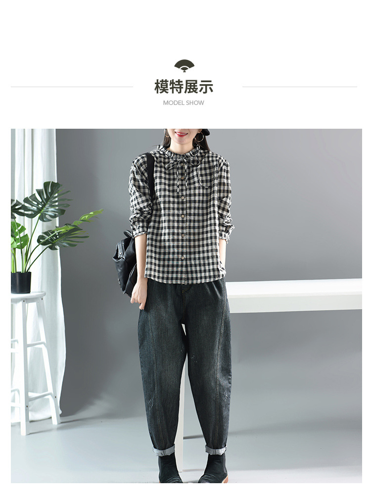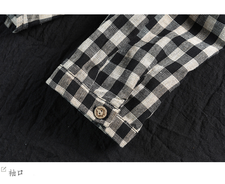 봄과 가을 한국 스타일 버진 우드 칼라 레이스 업 코튼 린넨 탑 예술적 격자 무늬 긴팔 셔츠 캐주얼 셔츠 트렌디스토어 가기