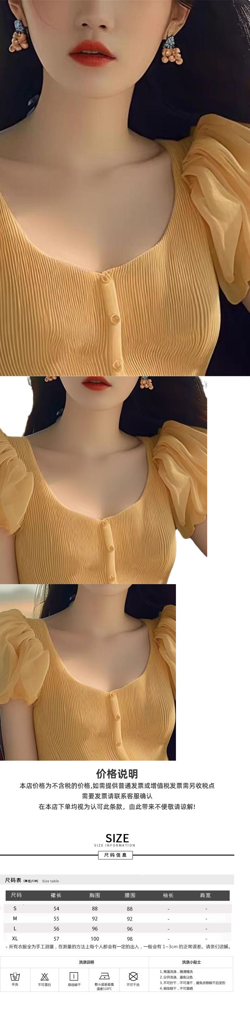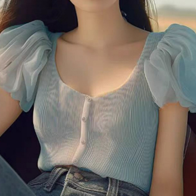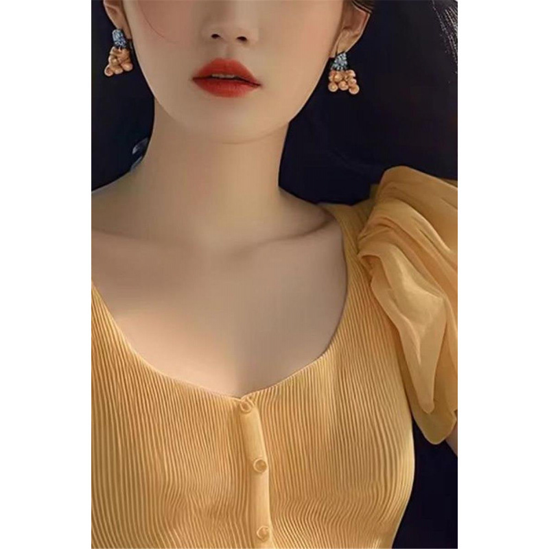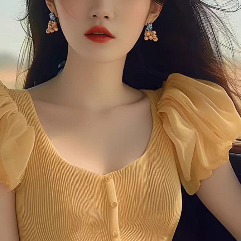 니치 스위트 핫걸 옐로우 쉬폰 셔츠, 부드럽고 슬림한 여성용 퍼프 슬리브 스퀘어 넥 반팔 탑