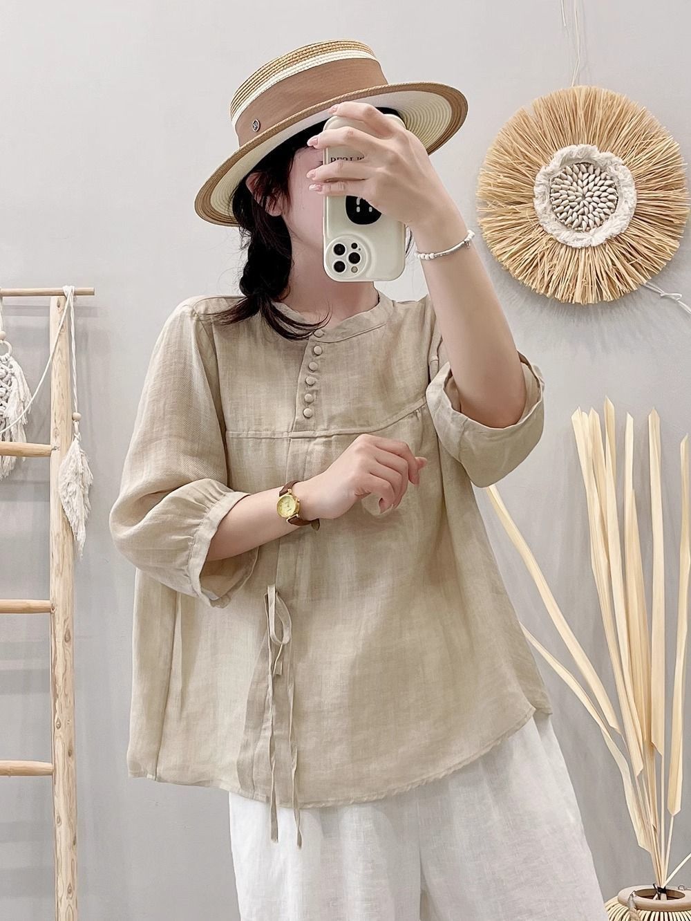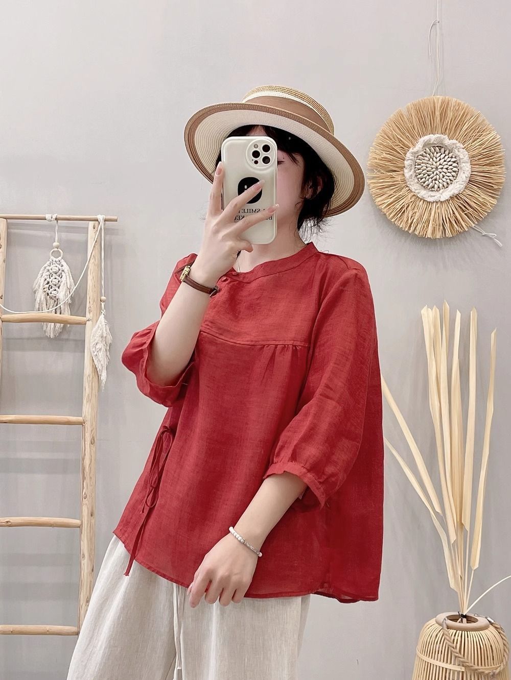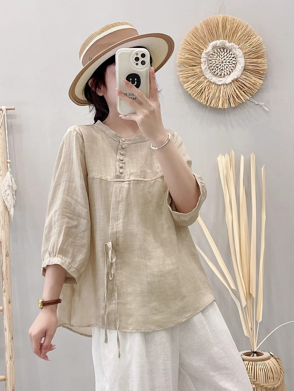 2025 여름 새로운 스타일 예술적 복고풍 캐주얼 루즈 슬리밍 5부 소매 솔리드 컬러 레이스 업 탑 셔츠 여성용스토어 가기