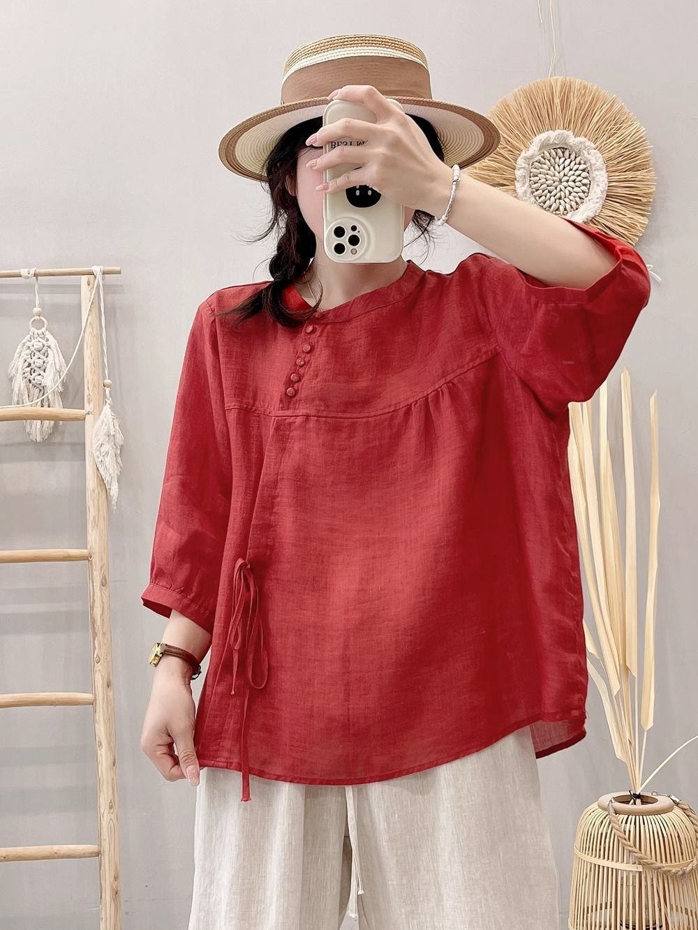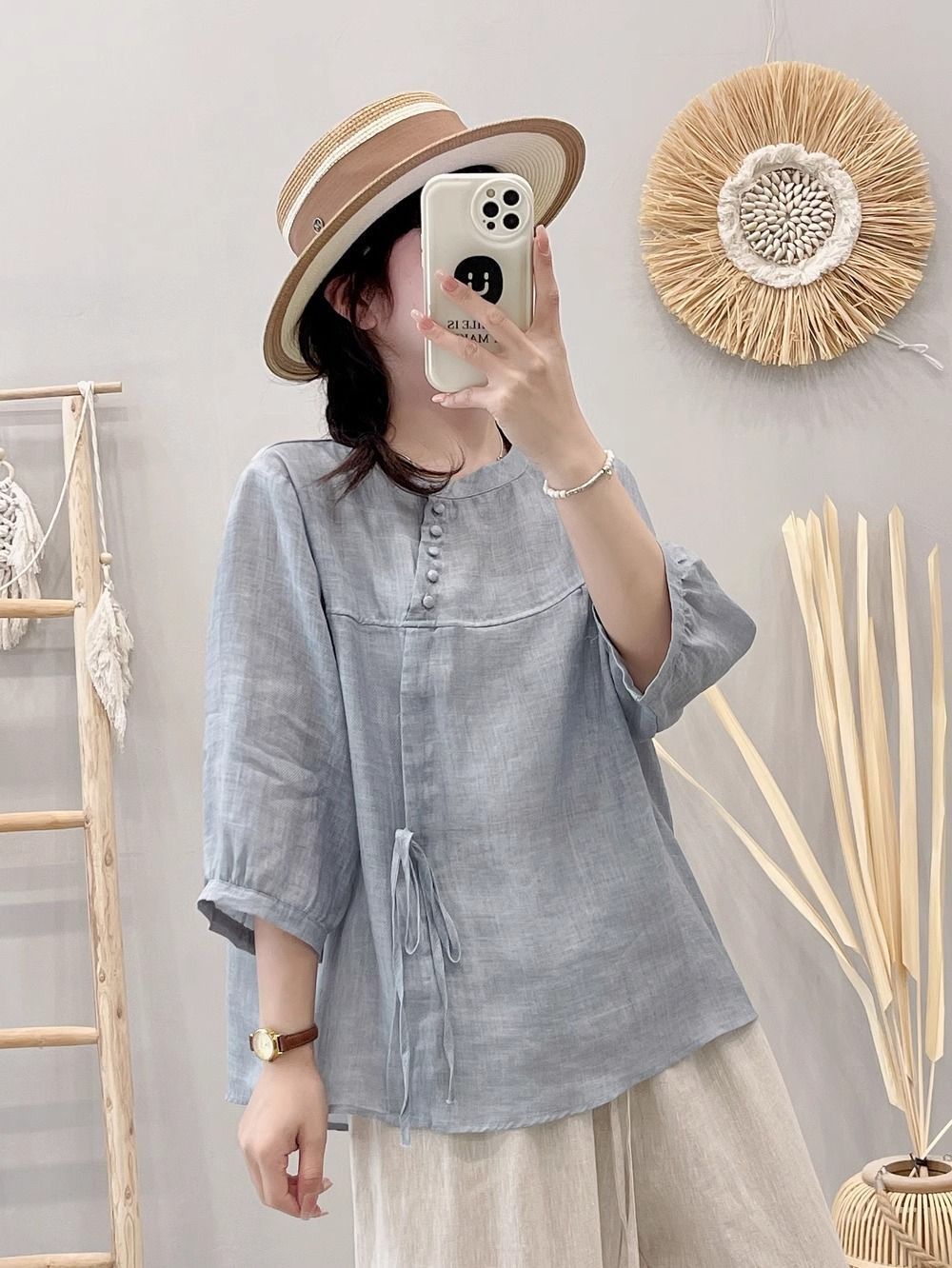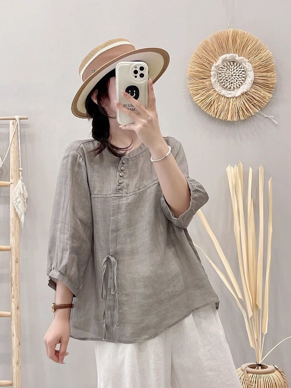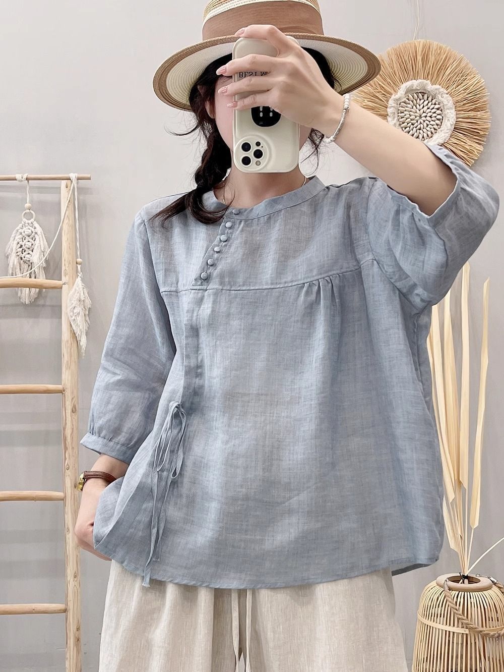 2025 여름 새로운 스타일 예술적 복고풍 캐주얼 루즈 슬리밍 5부 소매 솔리드 컬러 레이스 업 탑 셔츠 여성용스토어 가기
