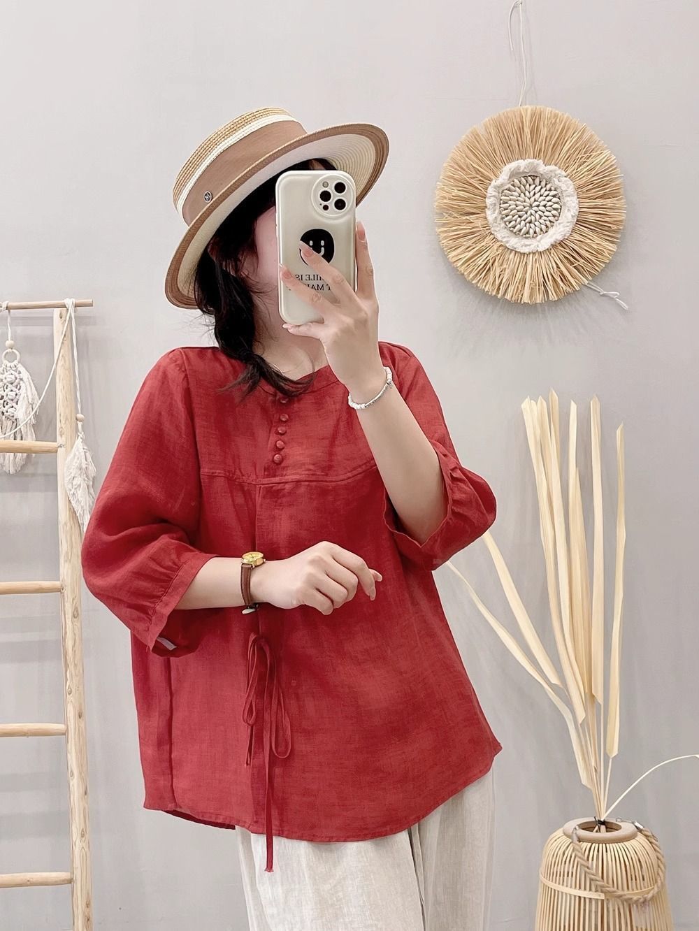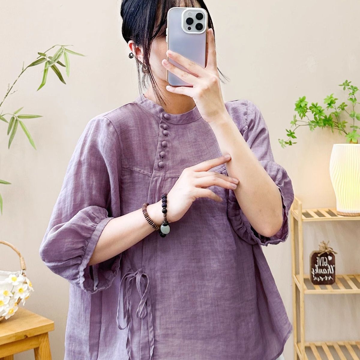 2025 여름 새로운 스타일 예술적 복고풍 캐주얼 루즈 슬리밍 5부 소매 솔리드 컬러 레이스 업 탑 셔츠 여성용