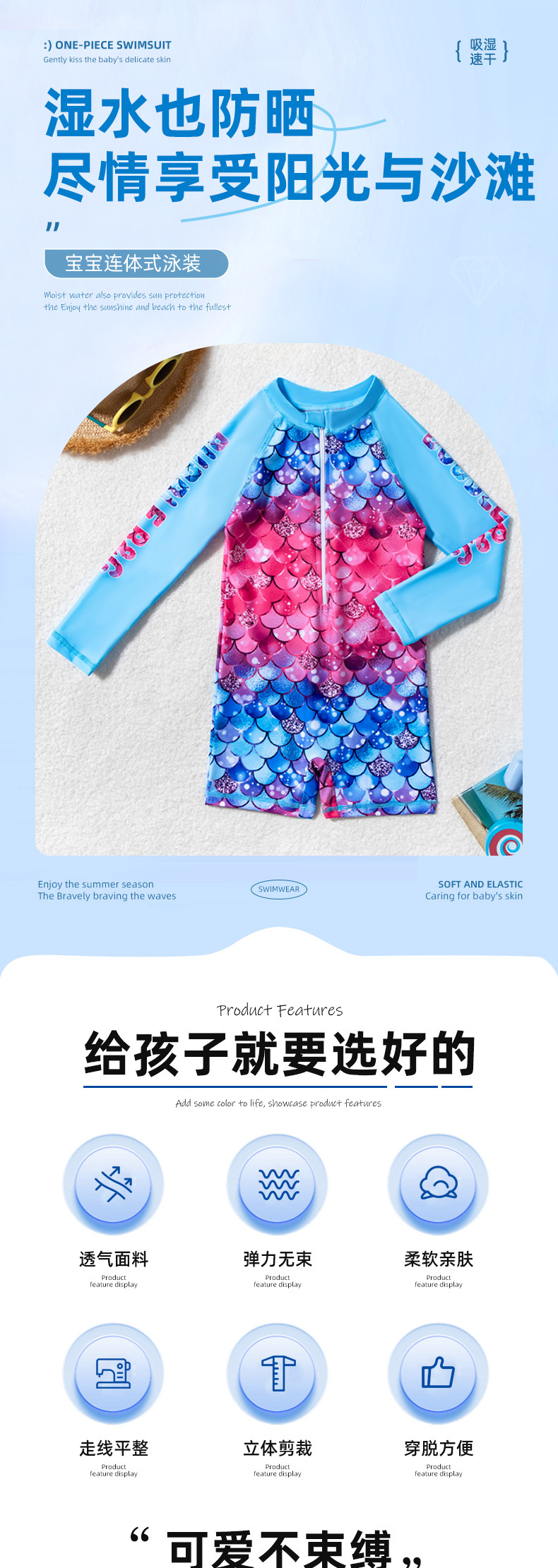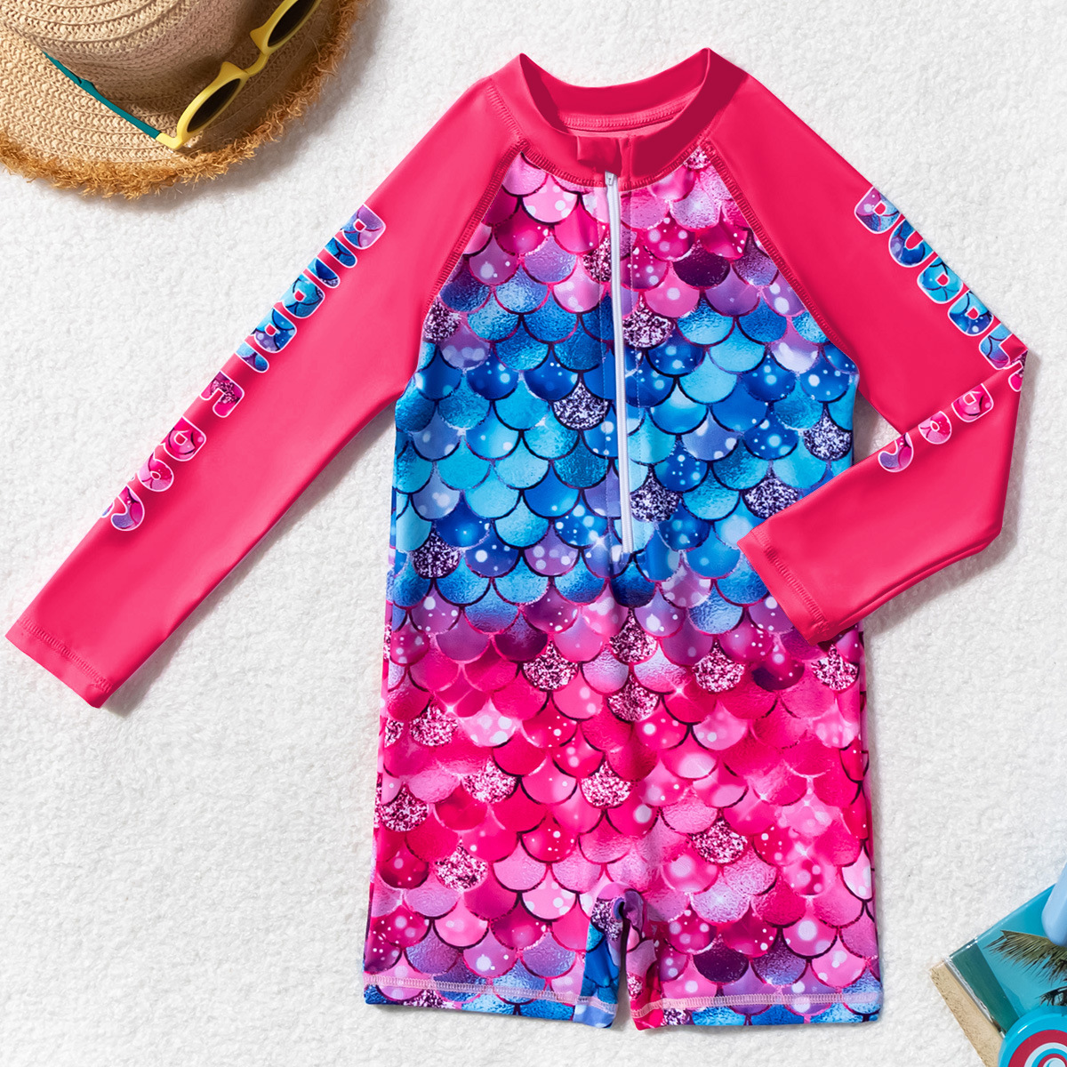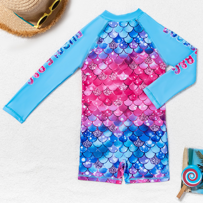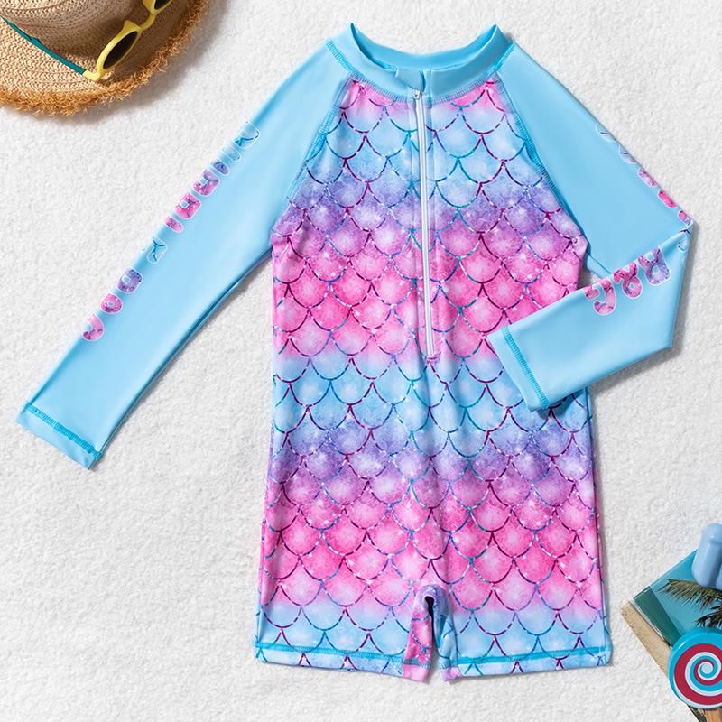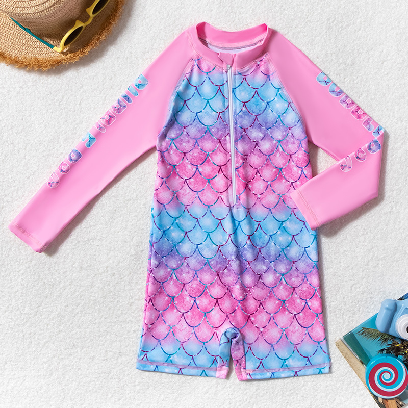 아동용 수영복, 여아용 긴팔 원피스 수영복, 어린이용 물고기 비늘 무늬 지퍼 자외선 차단제 온천 아동용 수영복