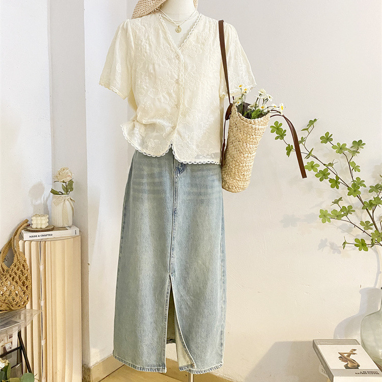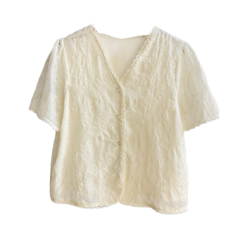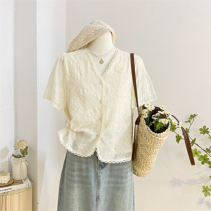 여성을위한 프랑스 스타일 레이스 v 넥 반팔 셔츠 2025 여름 짧은 스타일 부드럽고 연령 감소 한국 자수 셔츠 탑스토어 가기