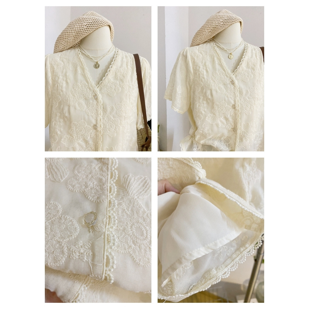 여성을위한 프랑스 스타일 레이스 v 넥 반팔 셔츠 2025 여름 짧은 스타일 부드럽고 연령 감소 한국 자수 셔츠 탑