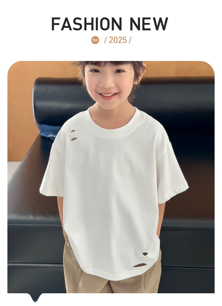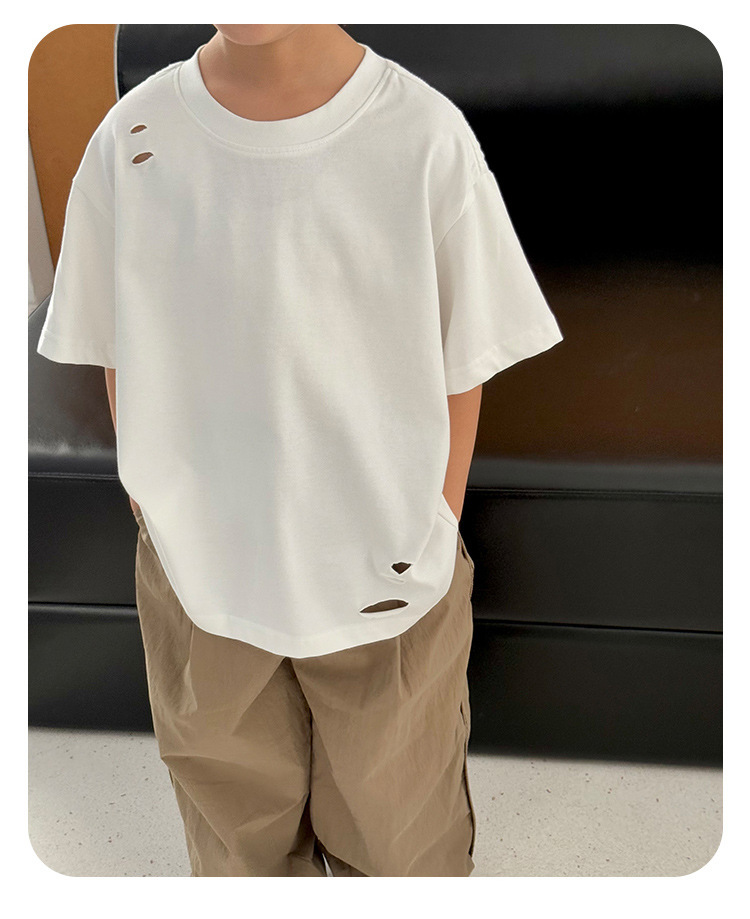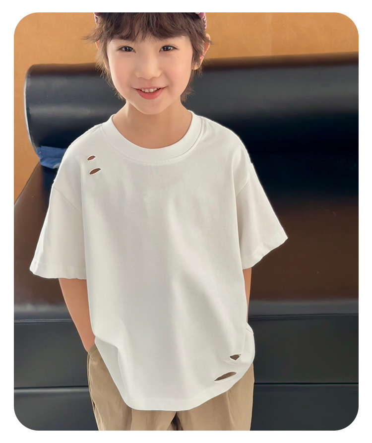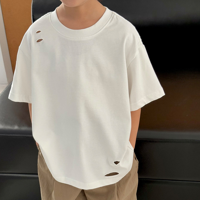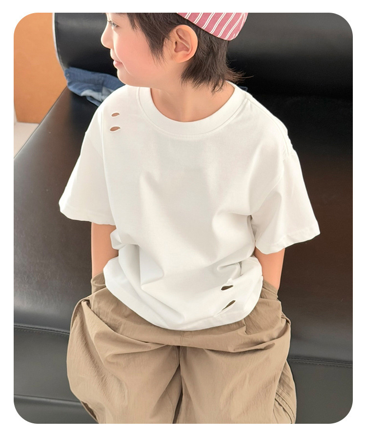 2025 여름 소년 반팔 티셔츠, 세련된 찢어진 한국식 여름 아동복, 다용도 아동 반팔 루즈 솔리드 컬러스토어 가기
