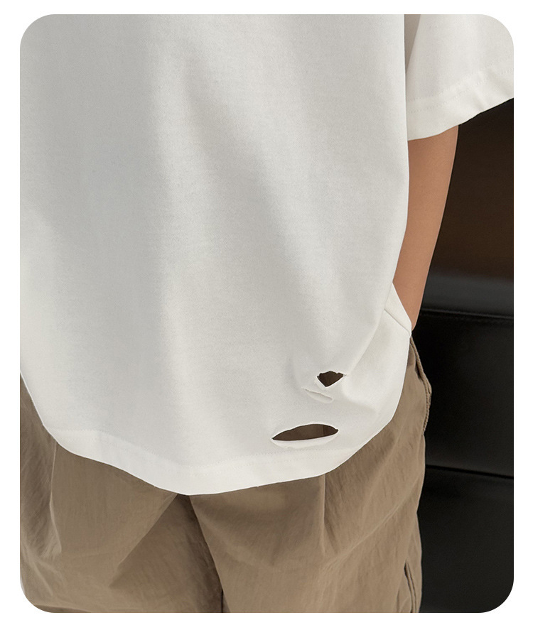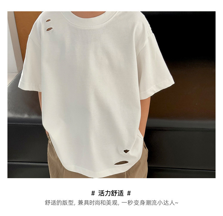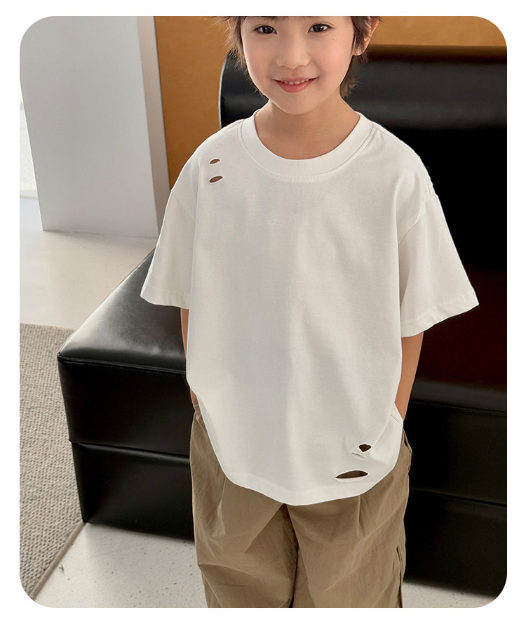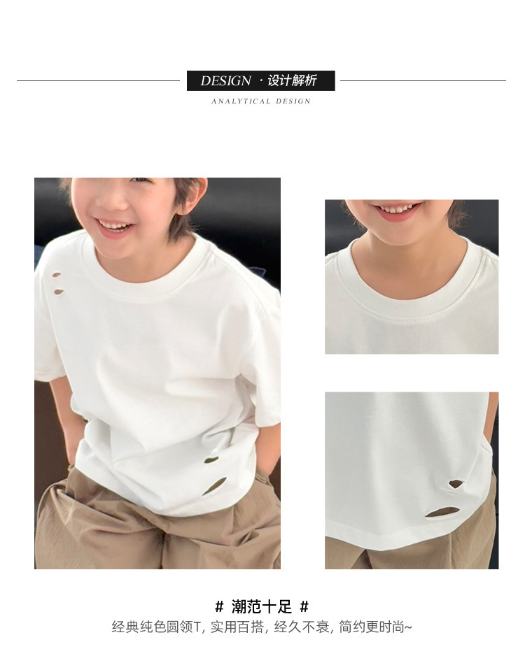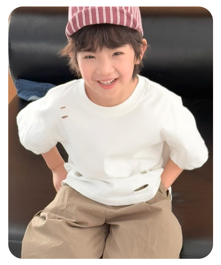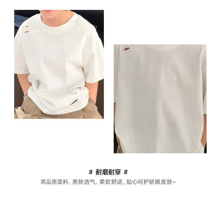 2025 여름 소년 반팔 티셔츠, 세련된 찢어진 한국식 여름 아동복, 다용도 아동 반팔 루즈 솔리드 컬러스토어 가기